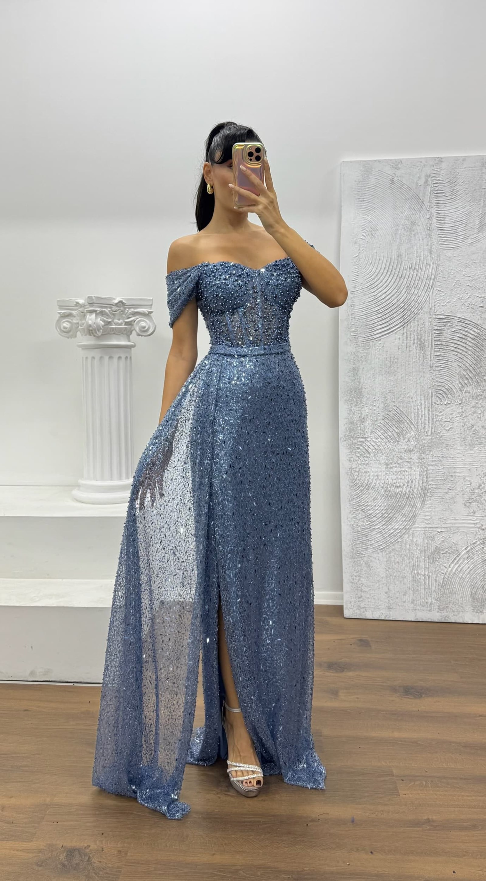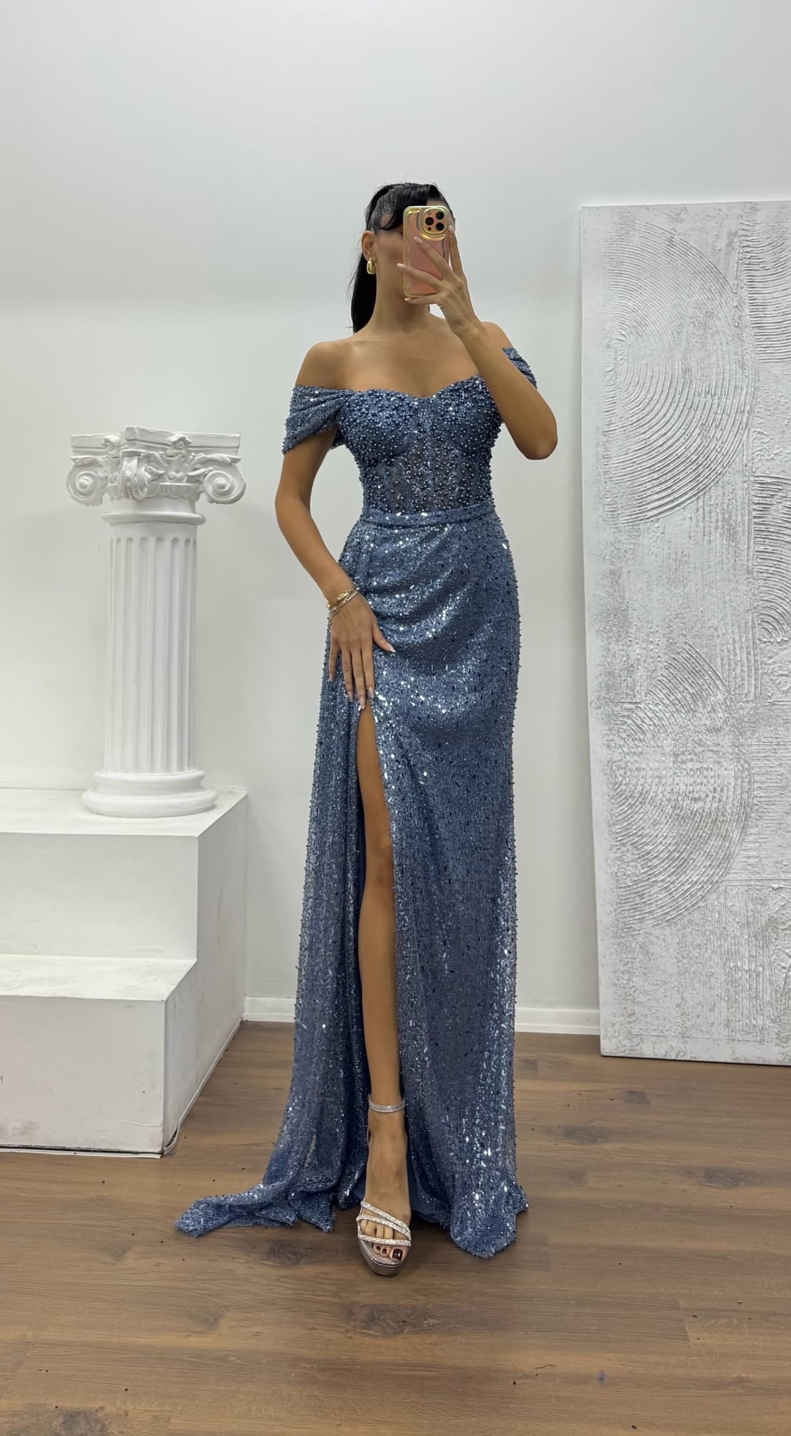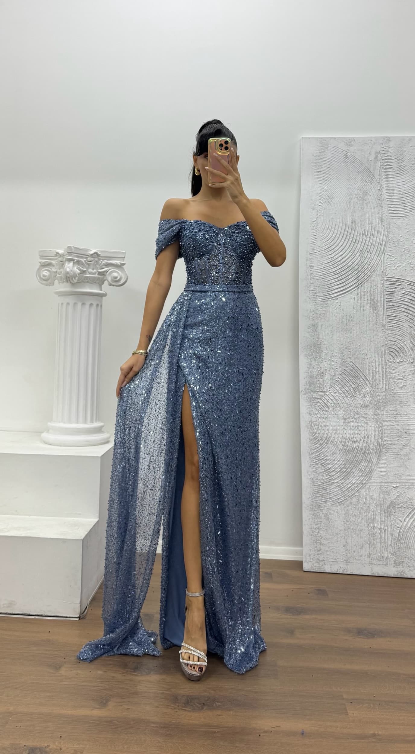 Ürün 36-44 bedene kadar uyumlu, göğüs pedli, astarlı, arka kapama fermuar, yırtmaçlı abiye olarak tasarlanmıştır.