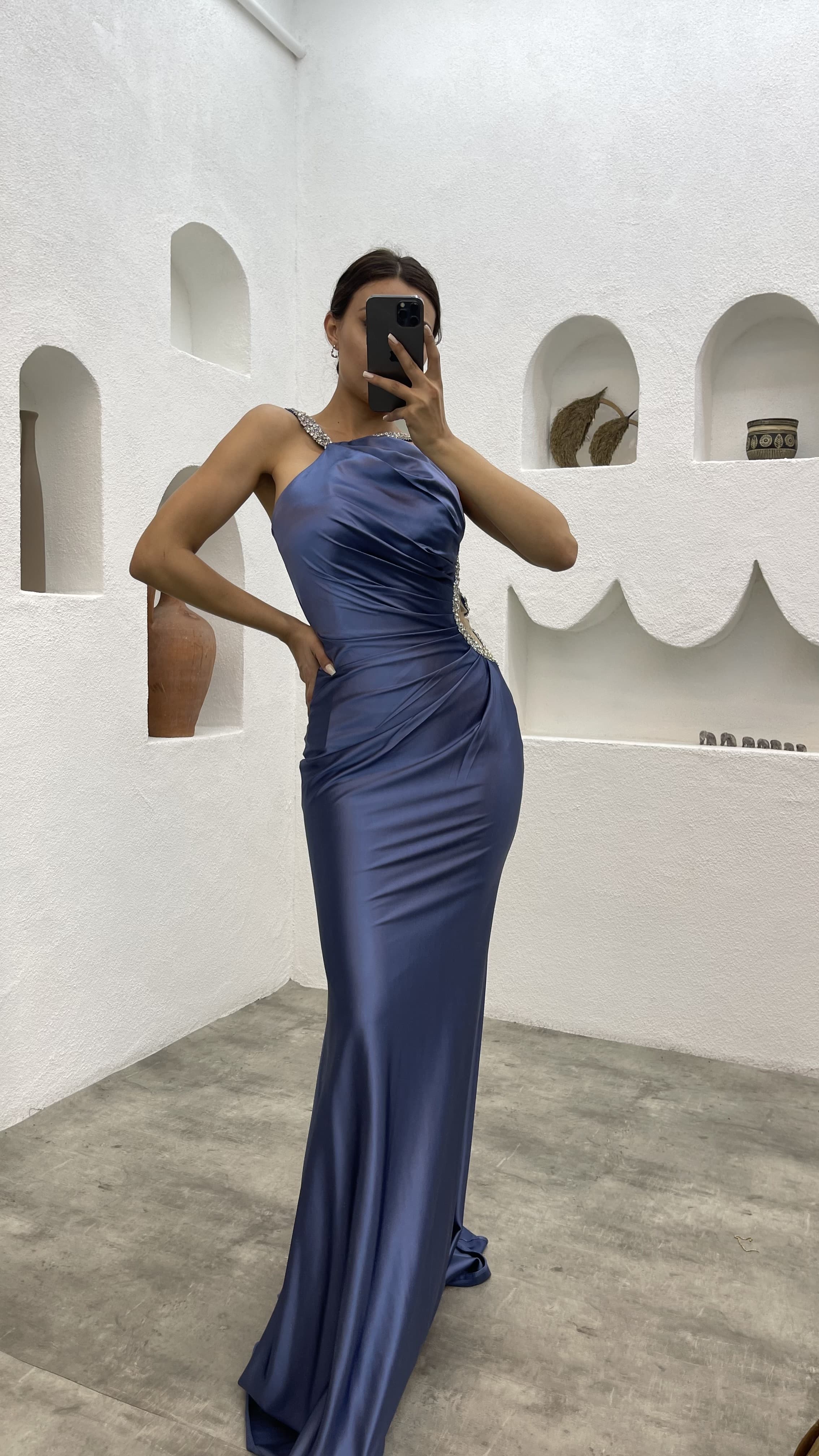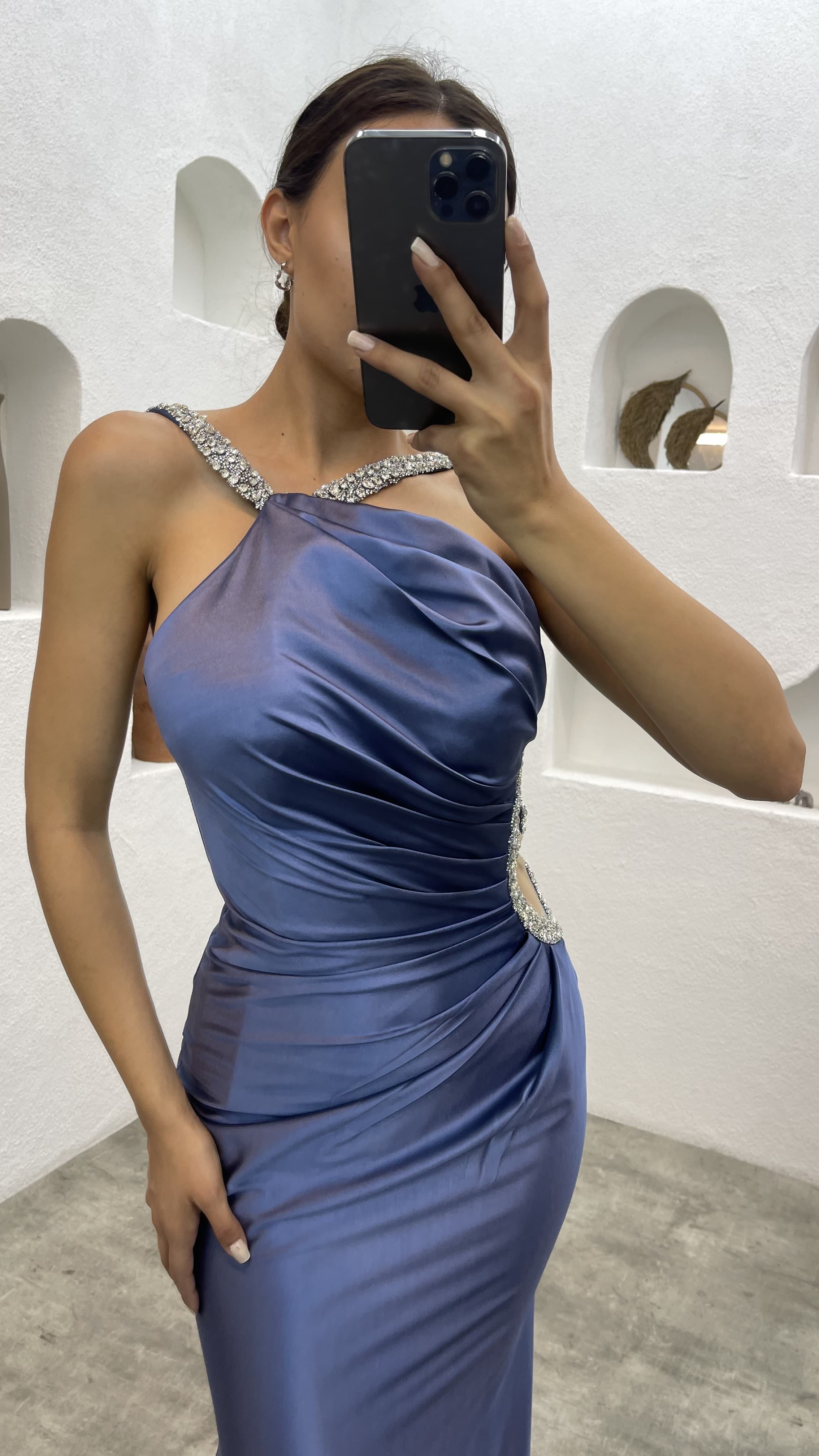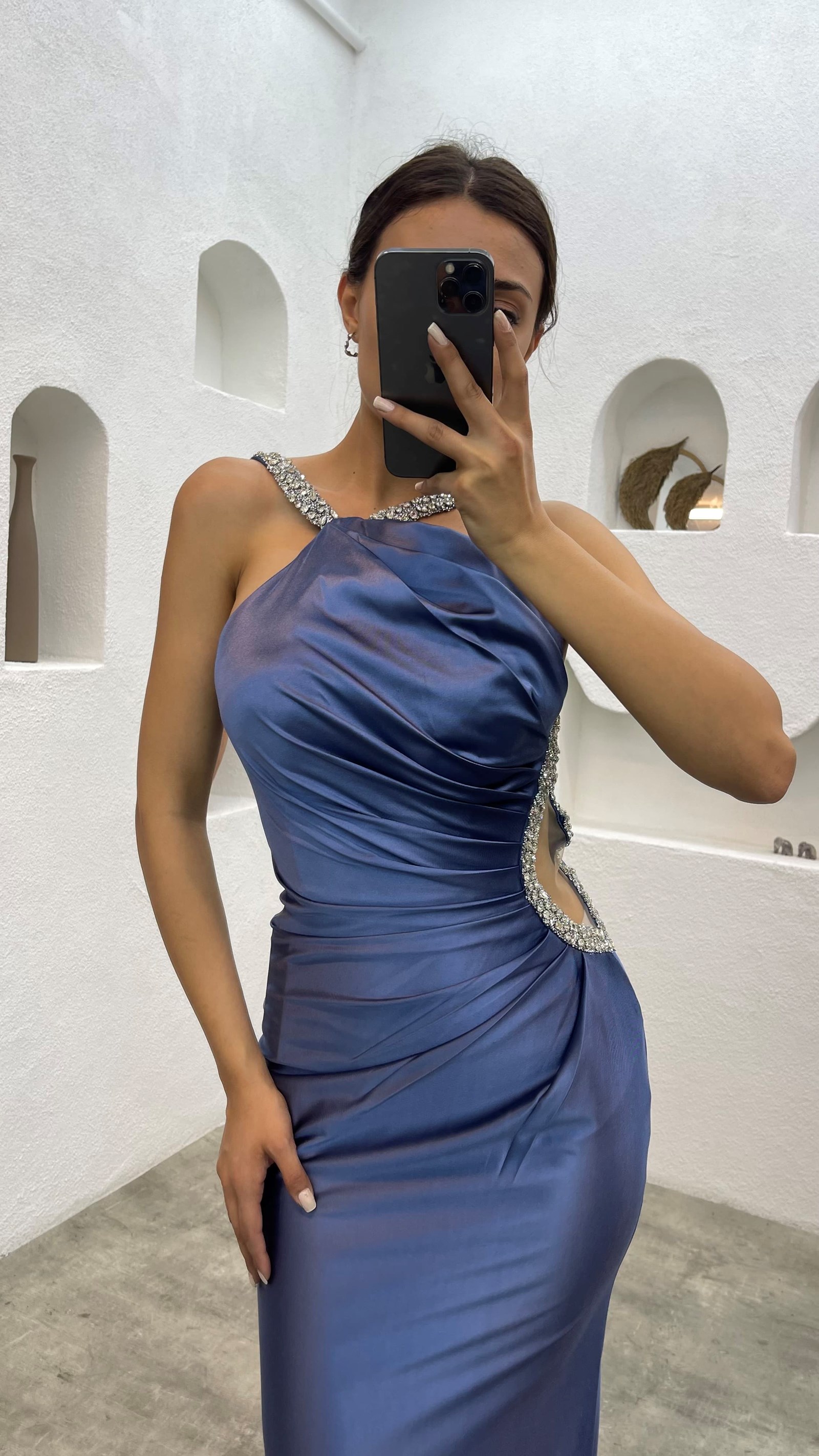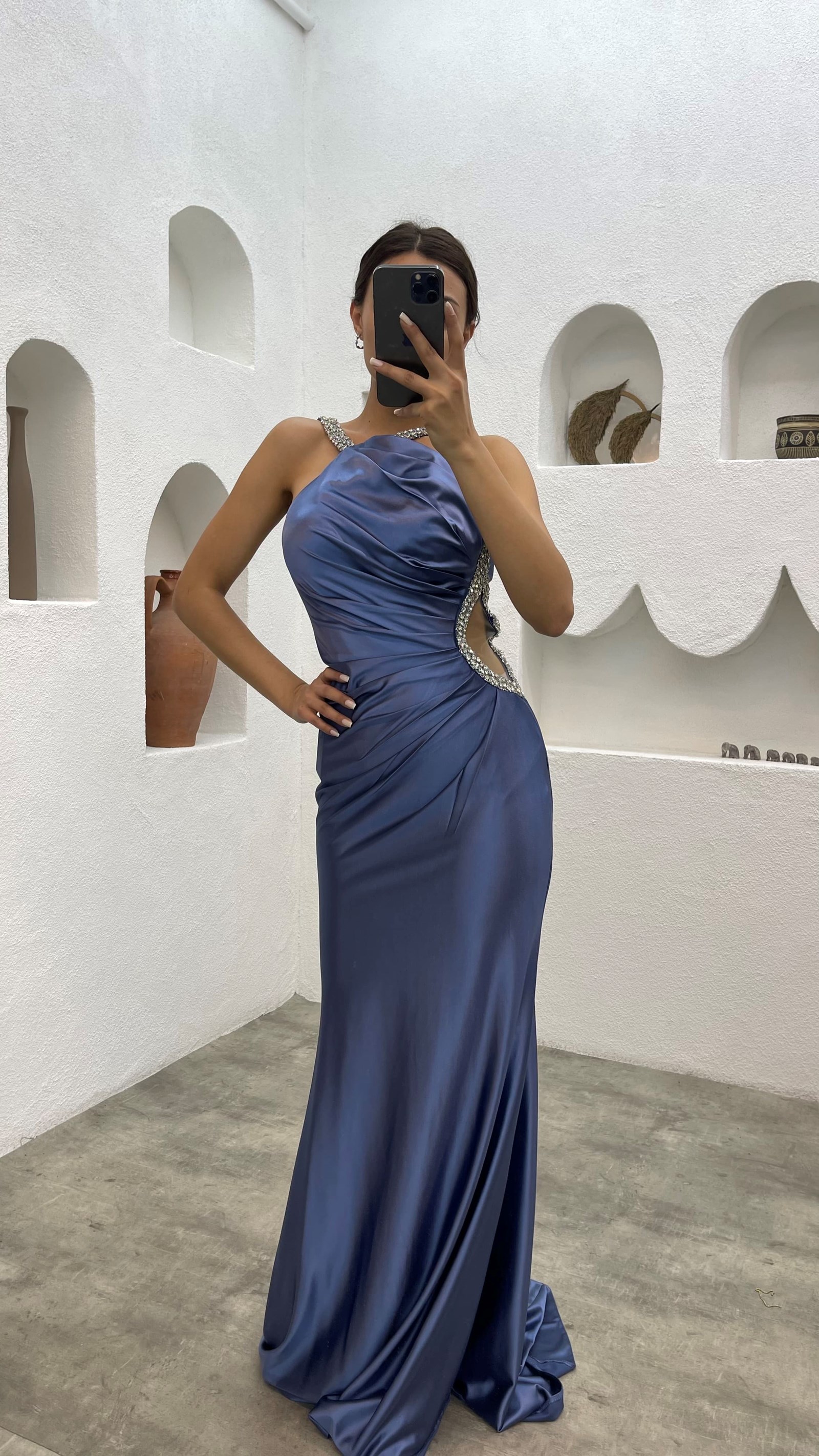 • İndigo Boynu Ve Beli İşlemeli Abiye Elbise