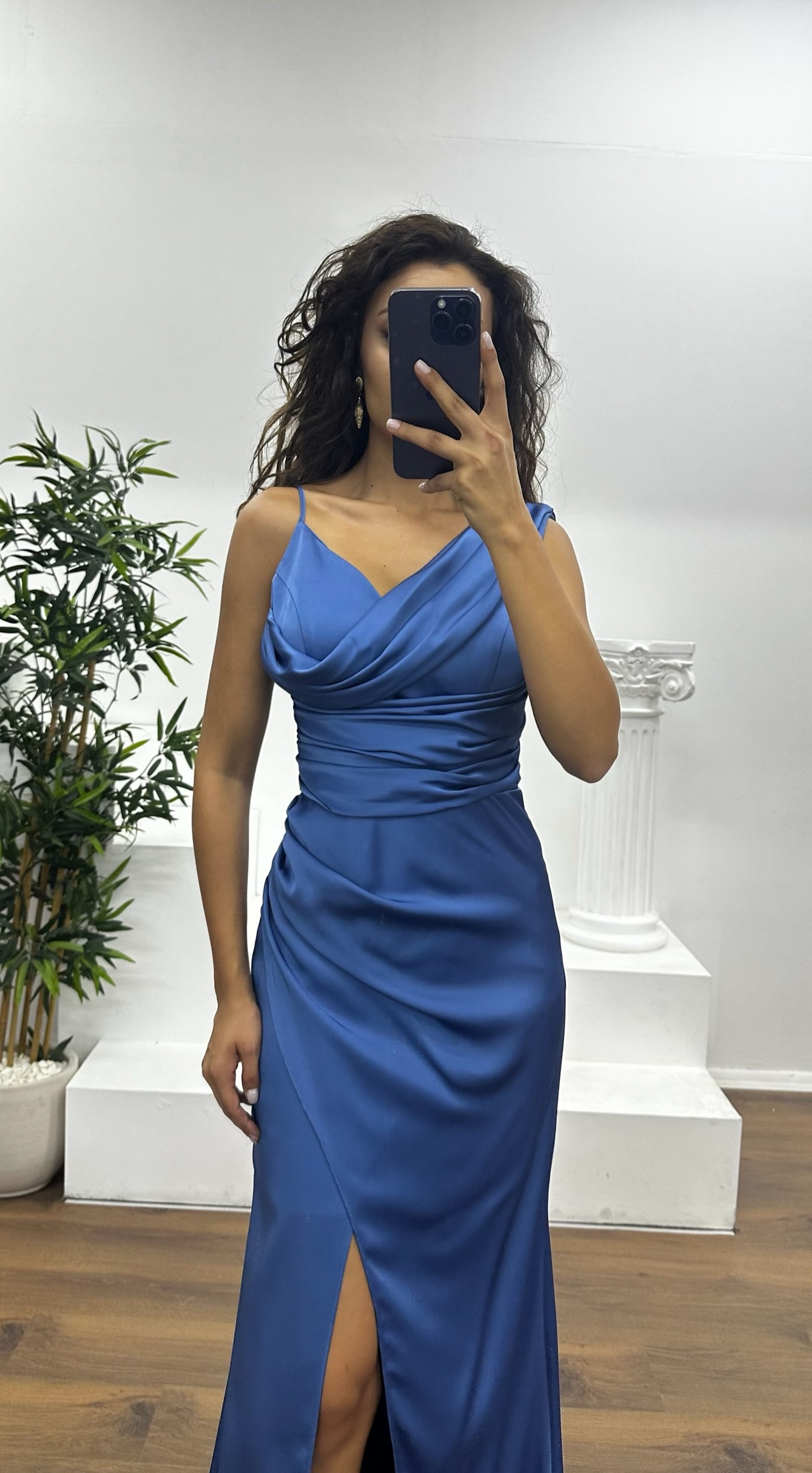 • İndigo Drapeli Saten Abiye Elbise