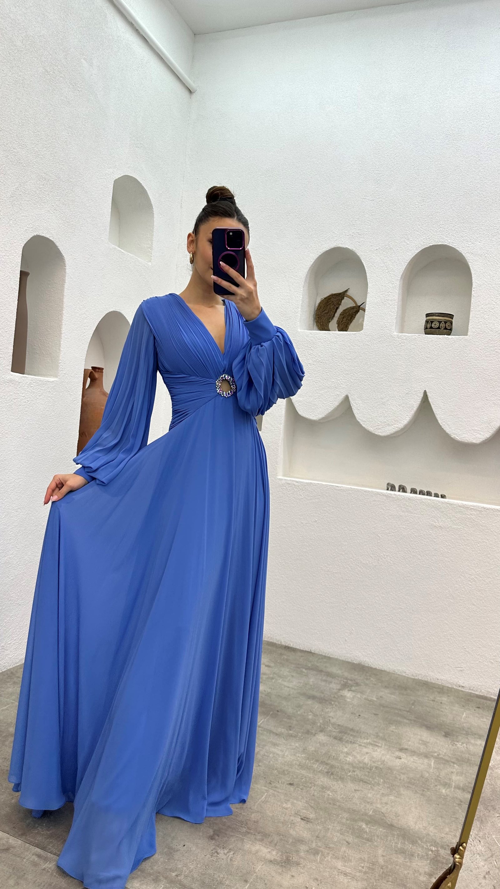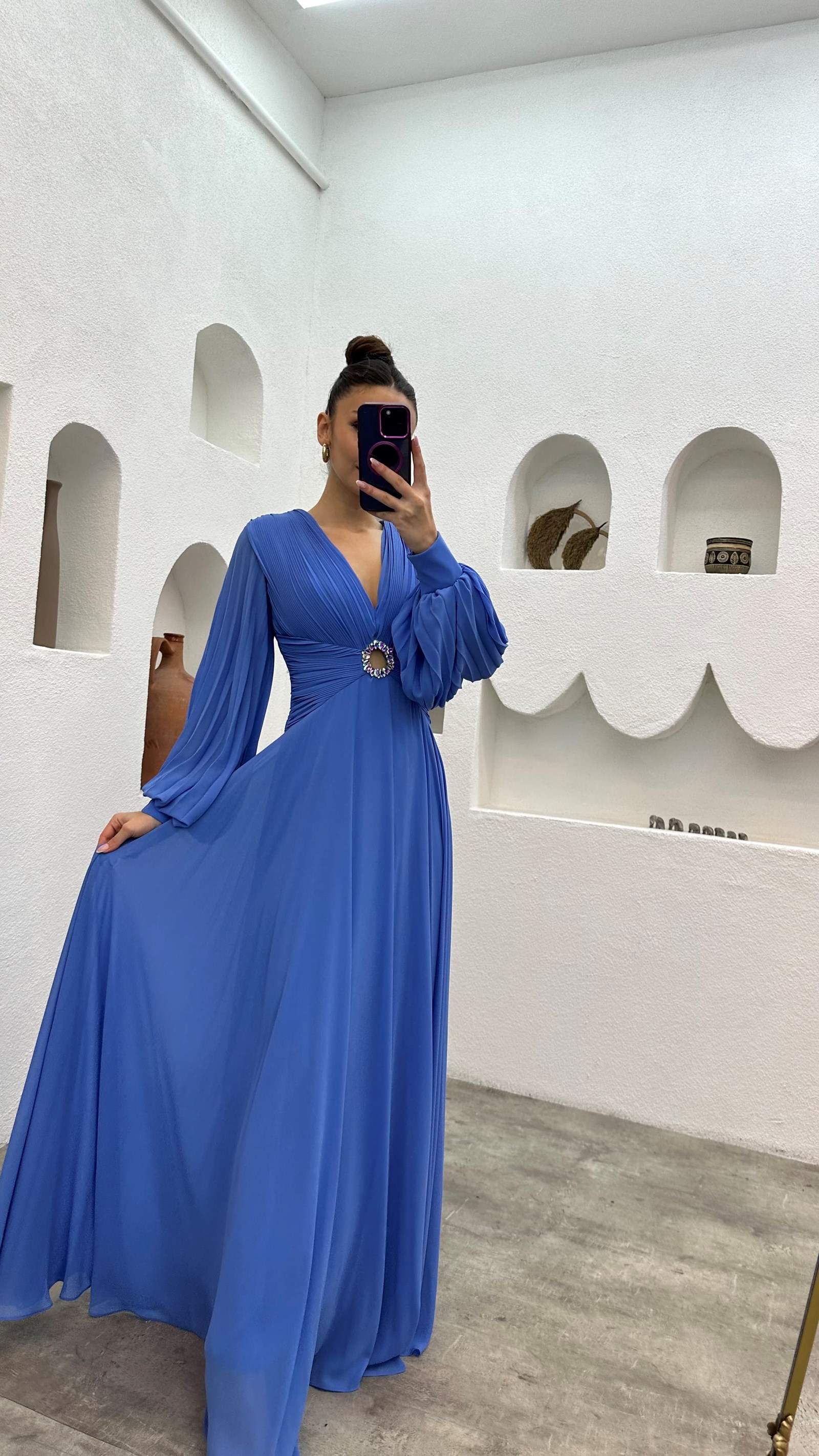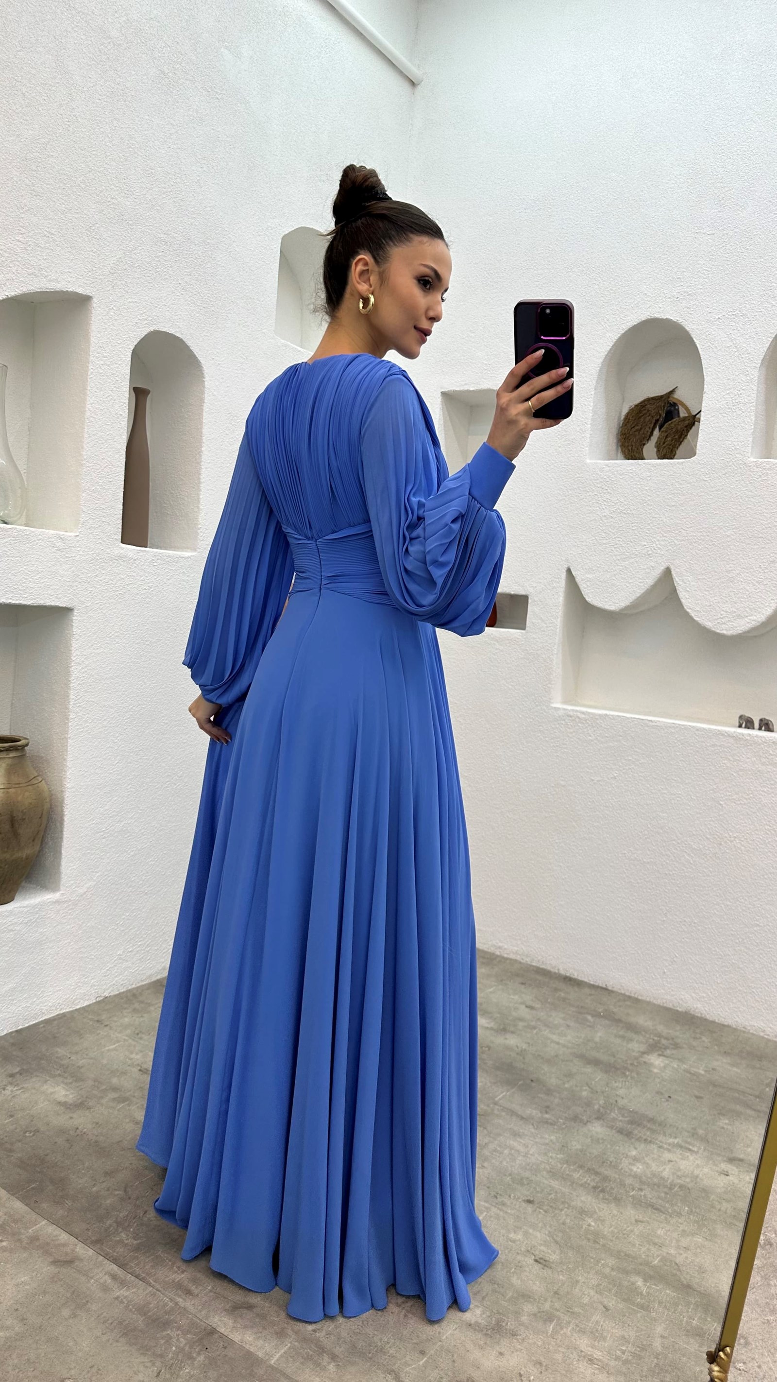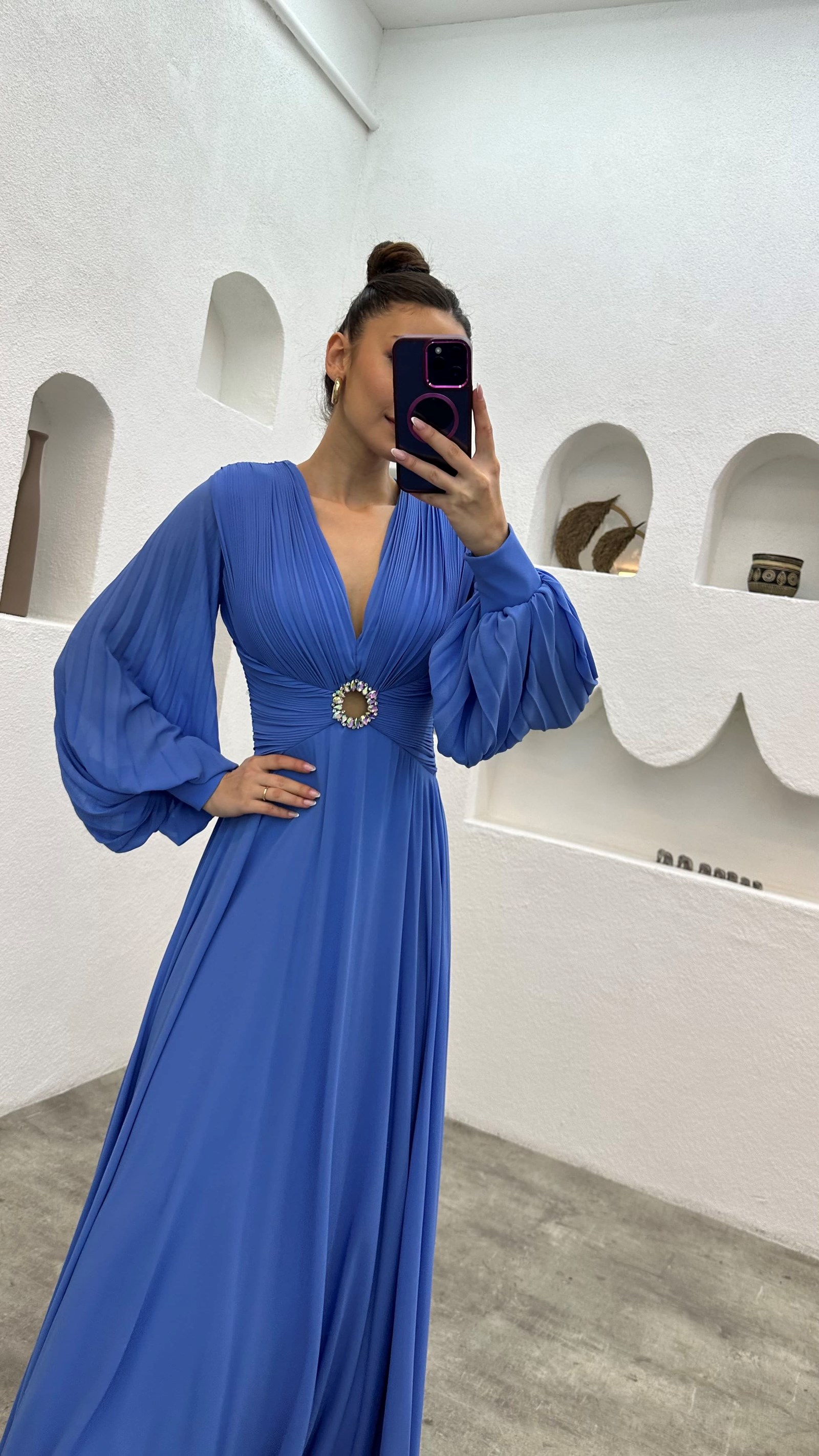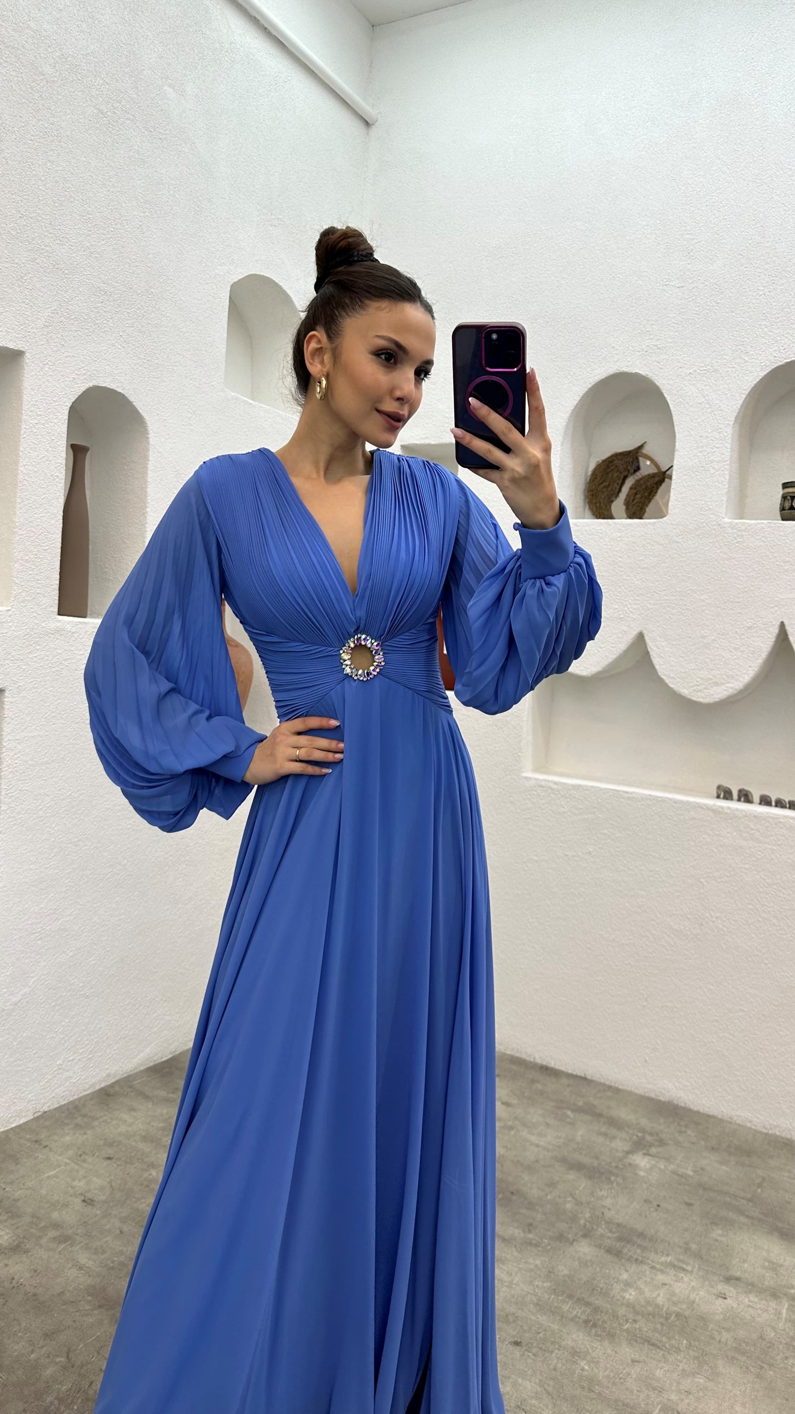 • İndigo Göğsü Ve Kolları Fırfırlı Tül Abiye Elbise