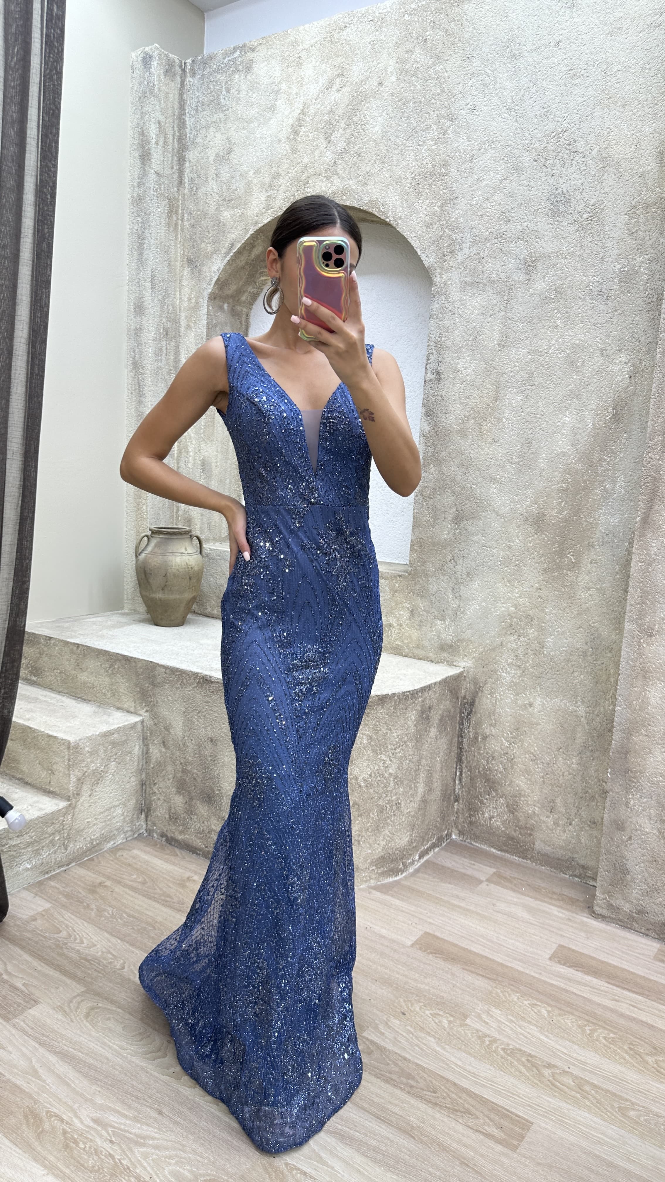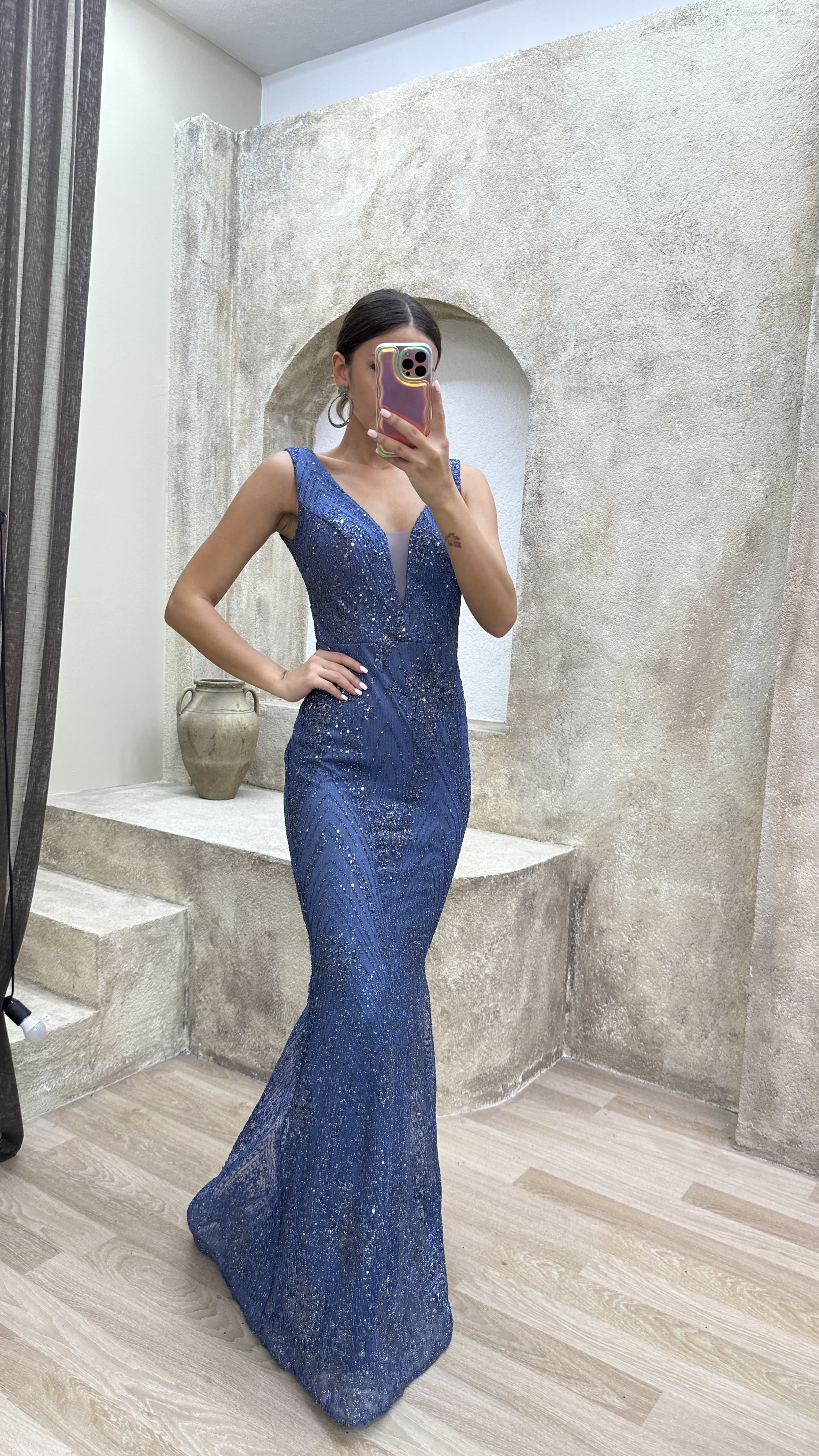 • İndigo Kalp Yaka Tasarım Pul Payet Abiye Elbise