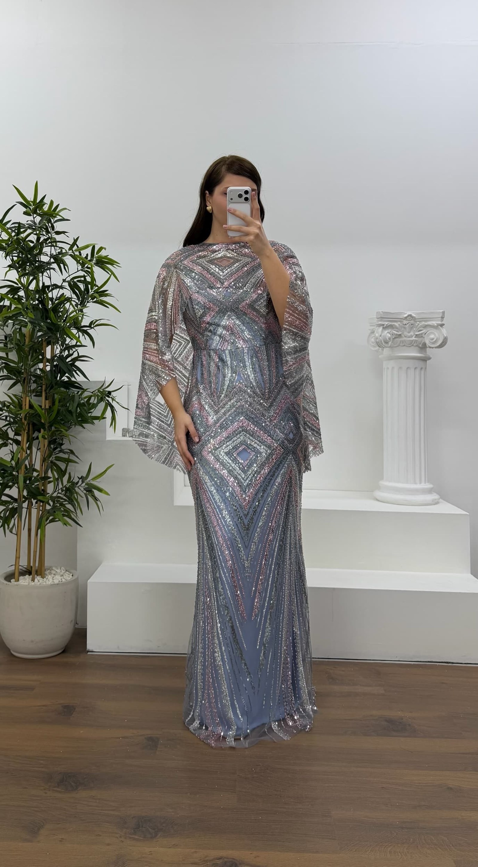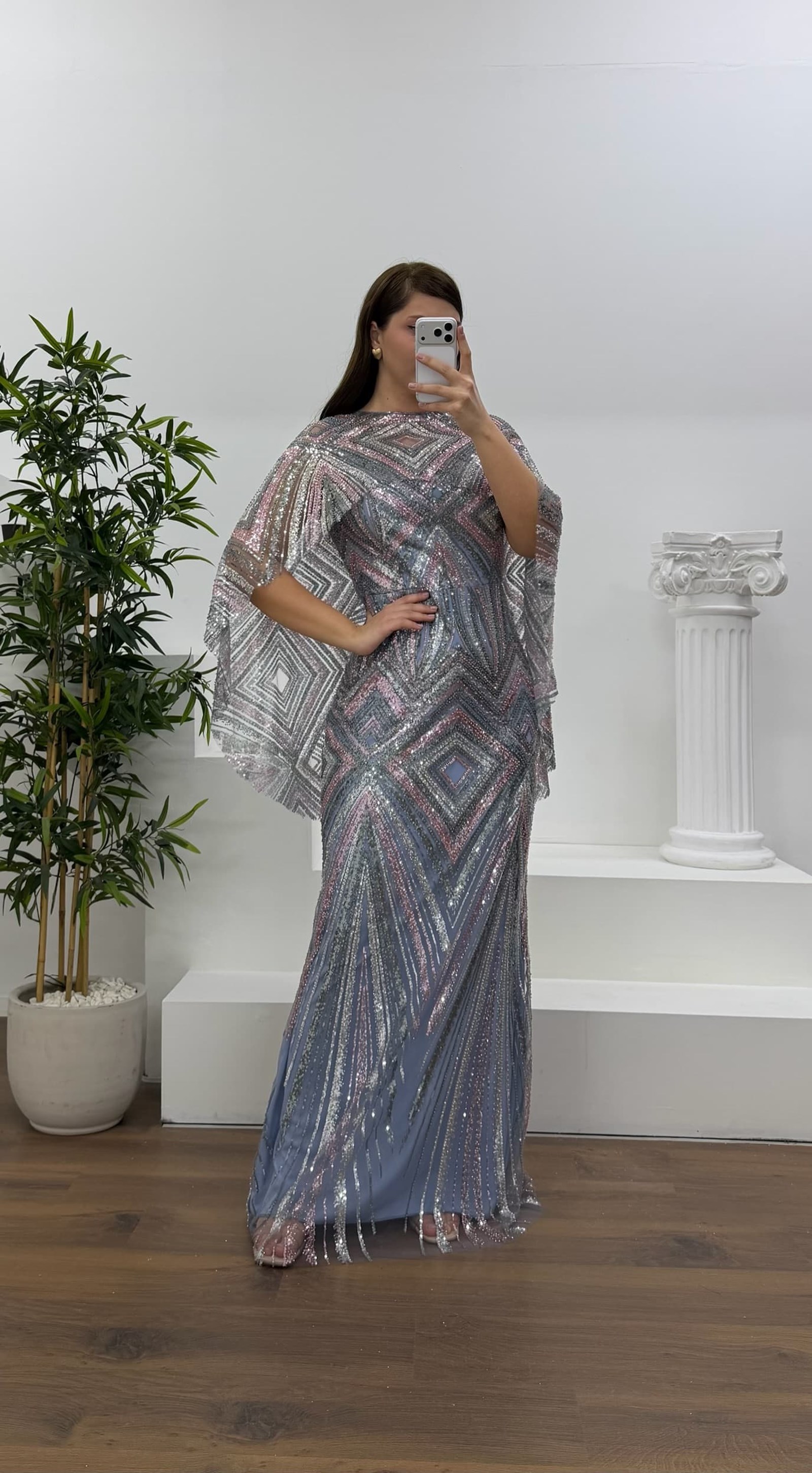 • Vizon Kolları Pelerin Detay Pul Payet Büyük Beden Abiye Elbise
