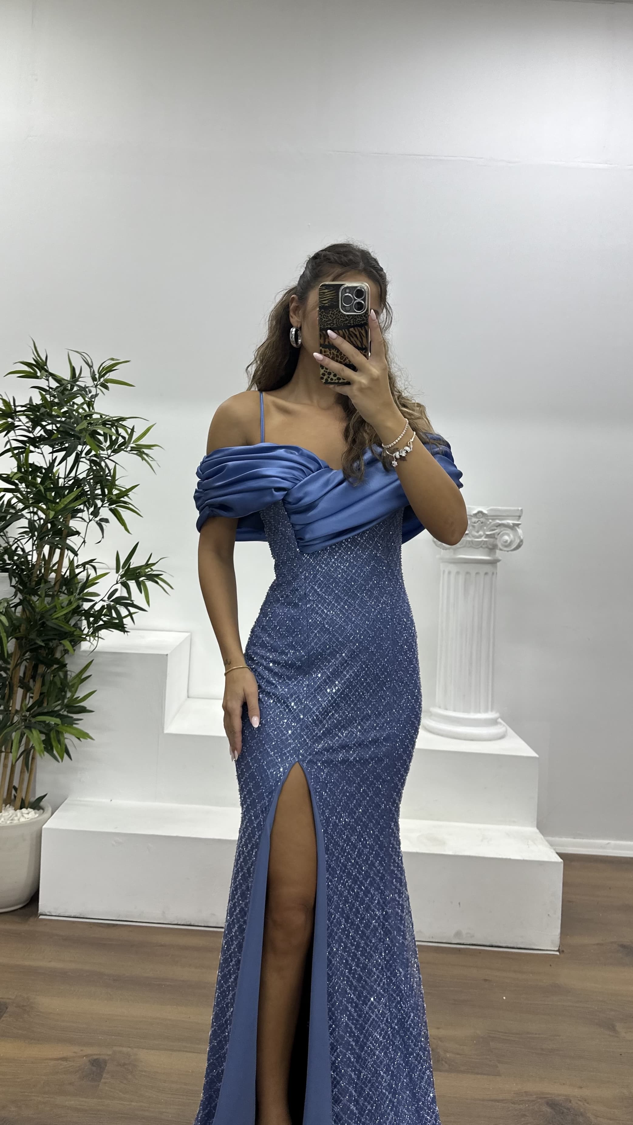 • İndigo Sırt Detay İşlemeli Abiye Elbise