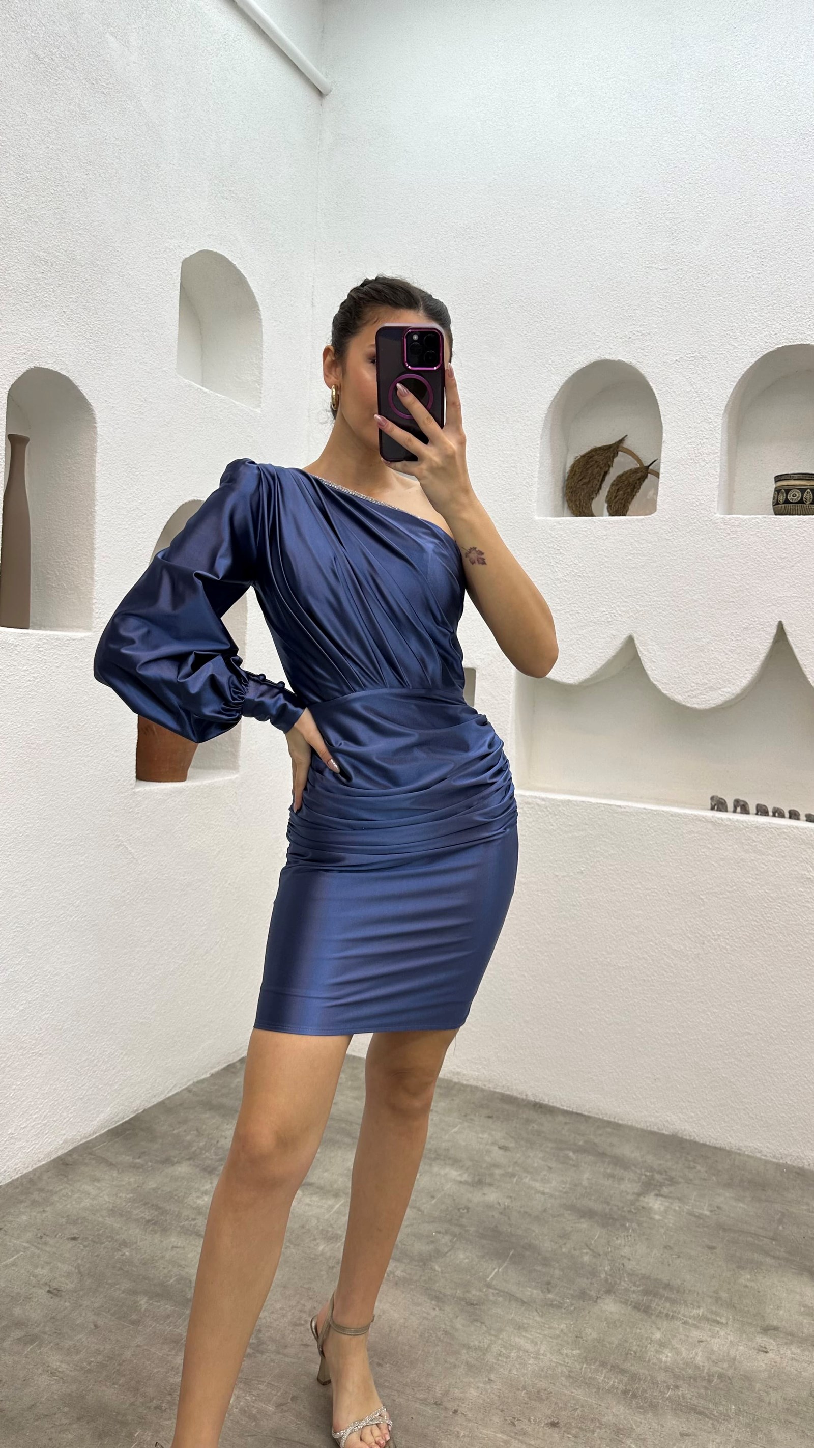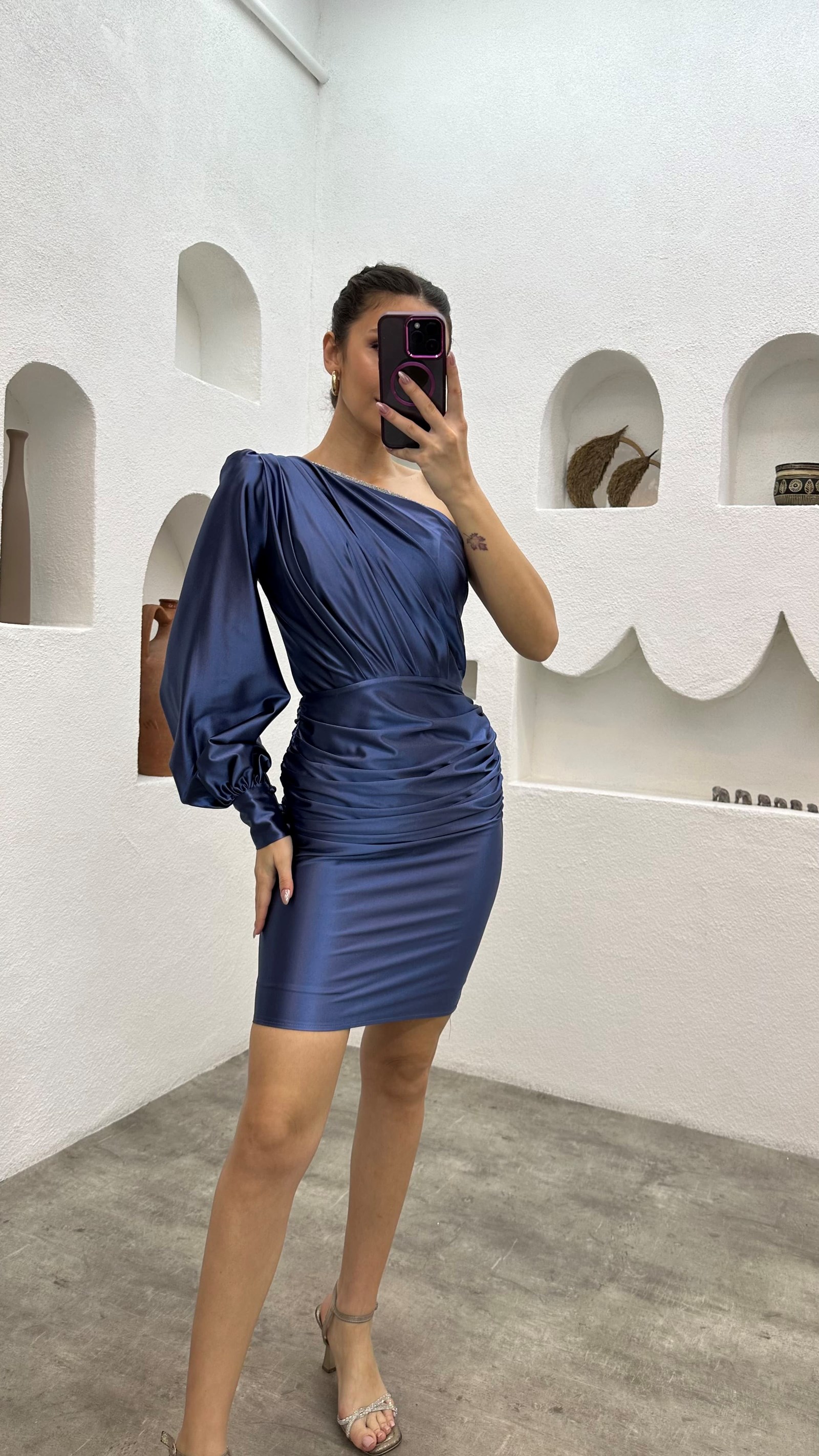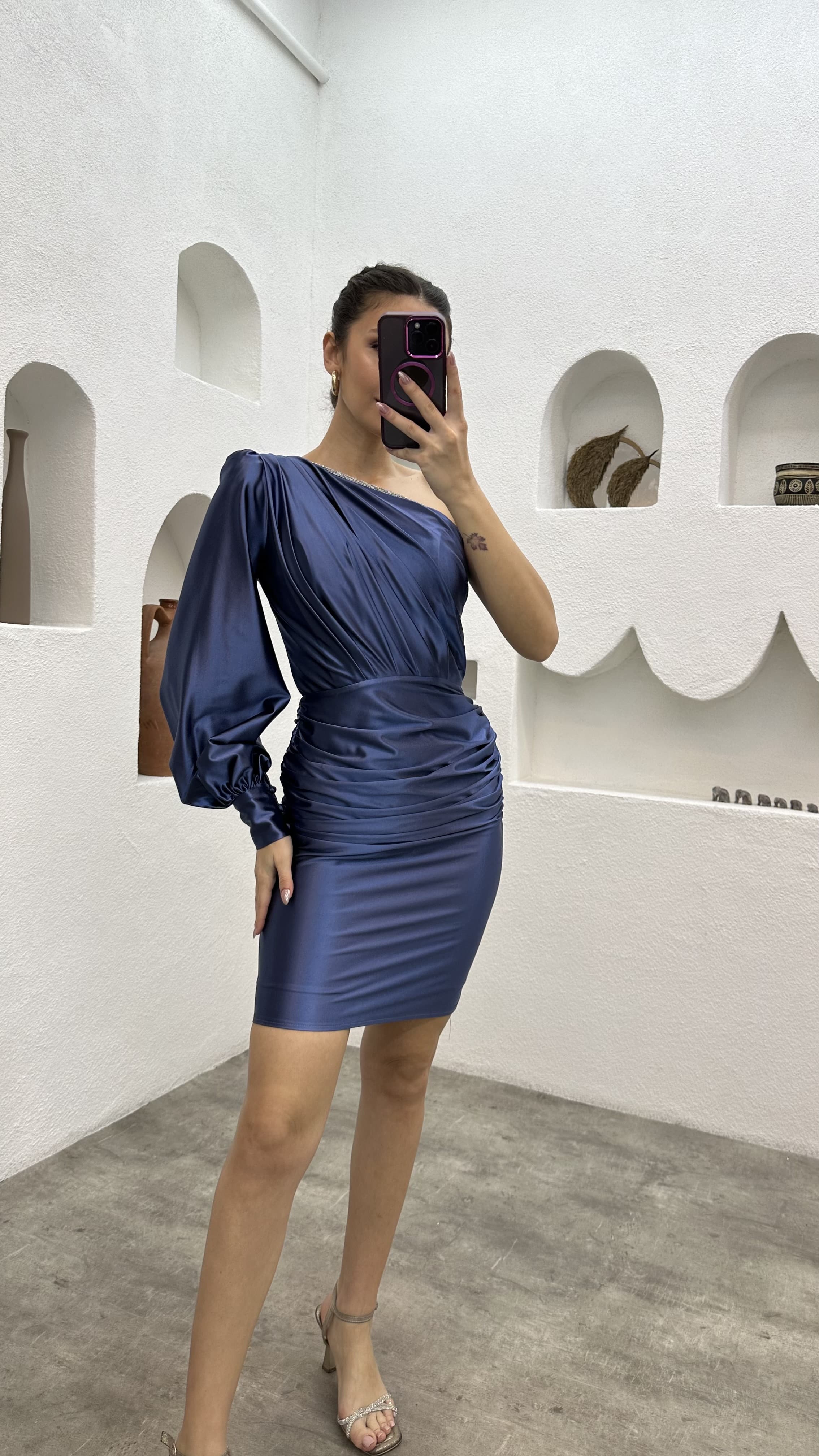 İndigo Tek Omuz Drapeli Saten Abiye Elbise