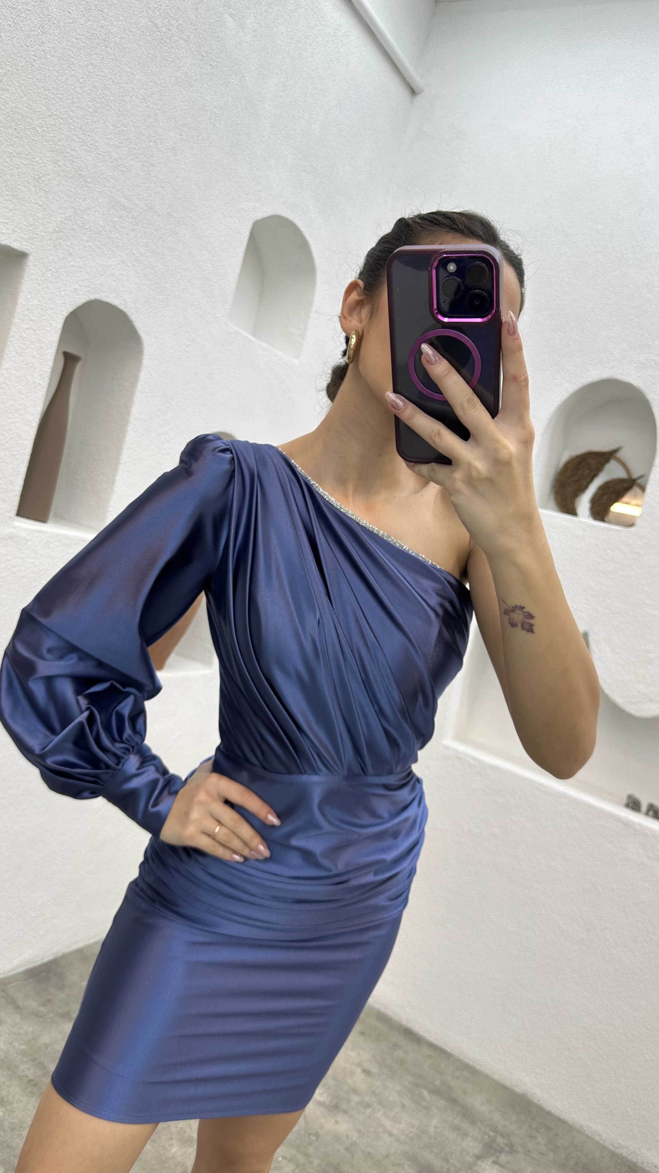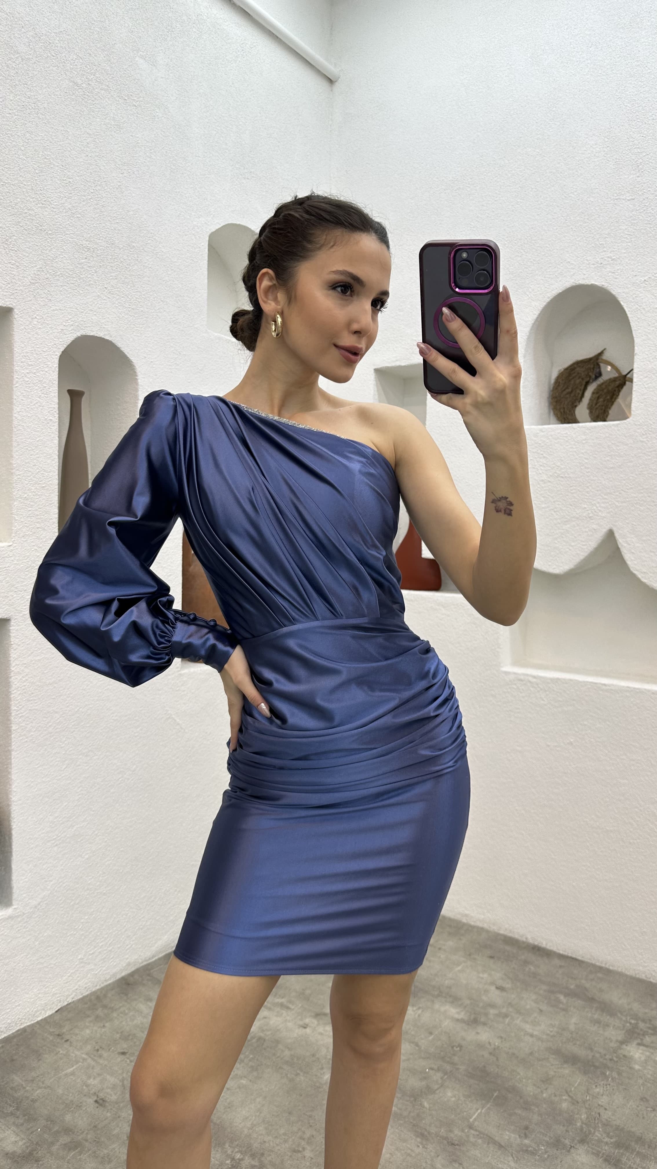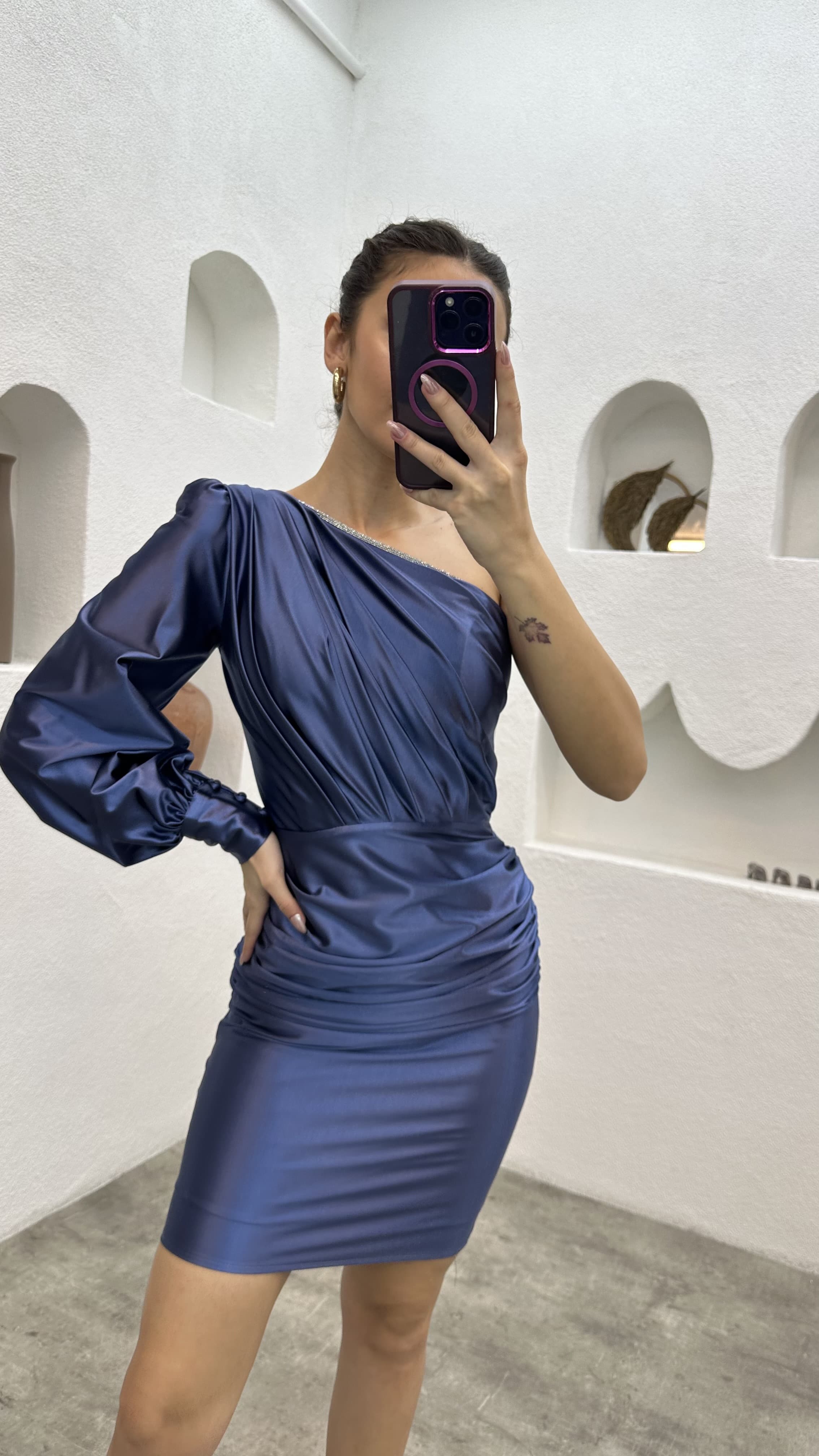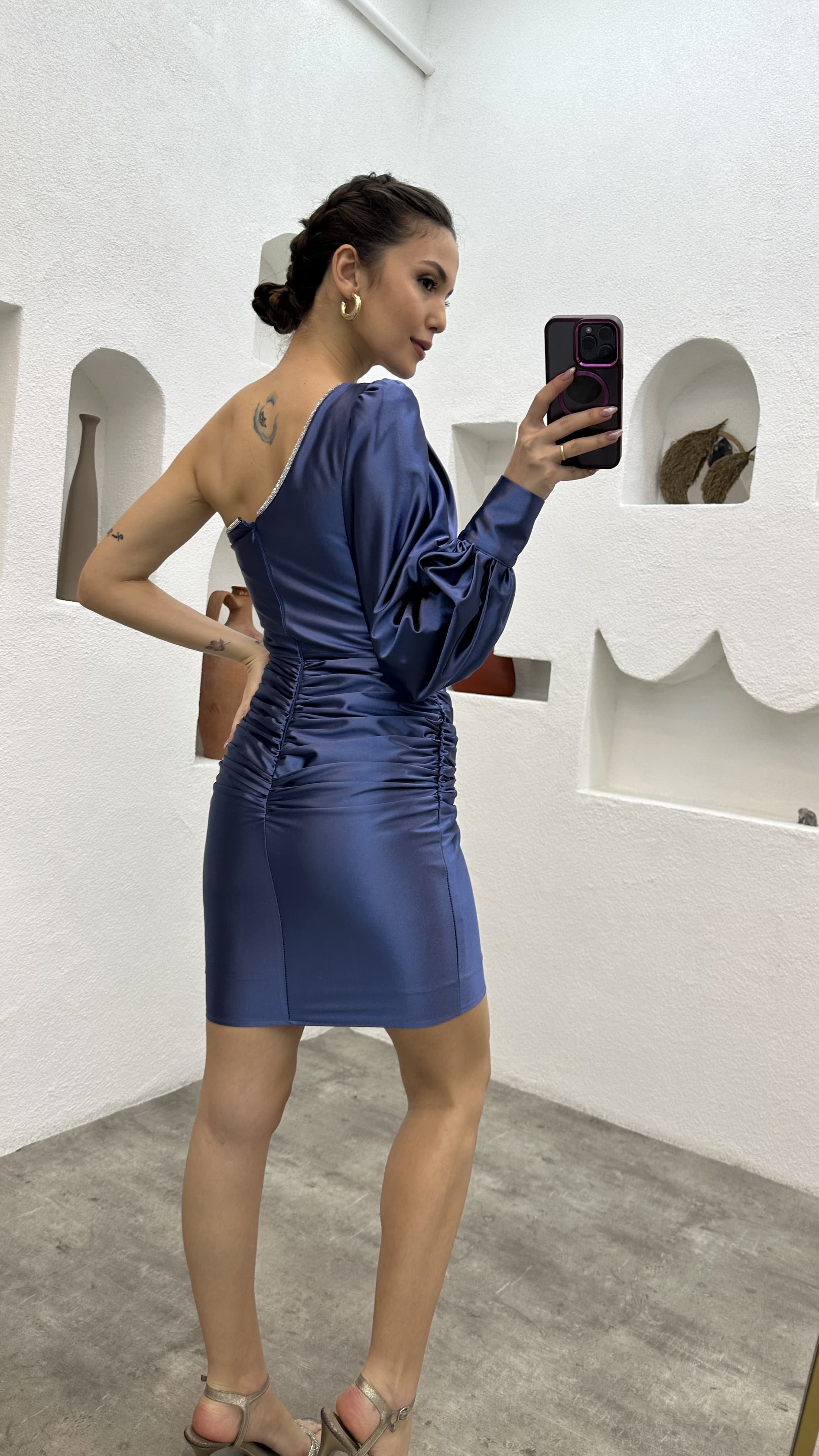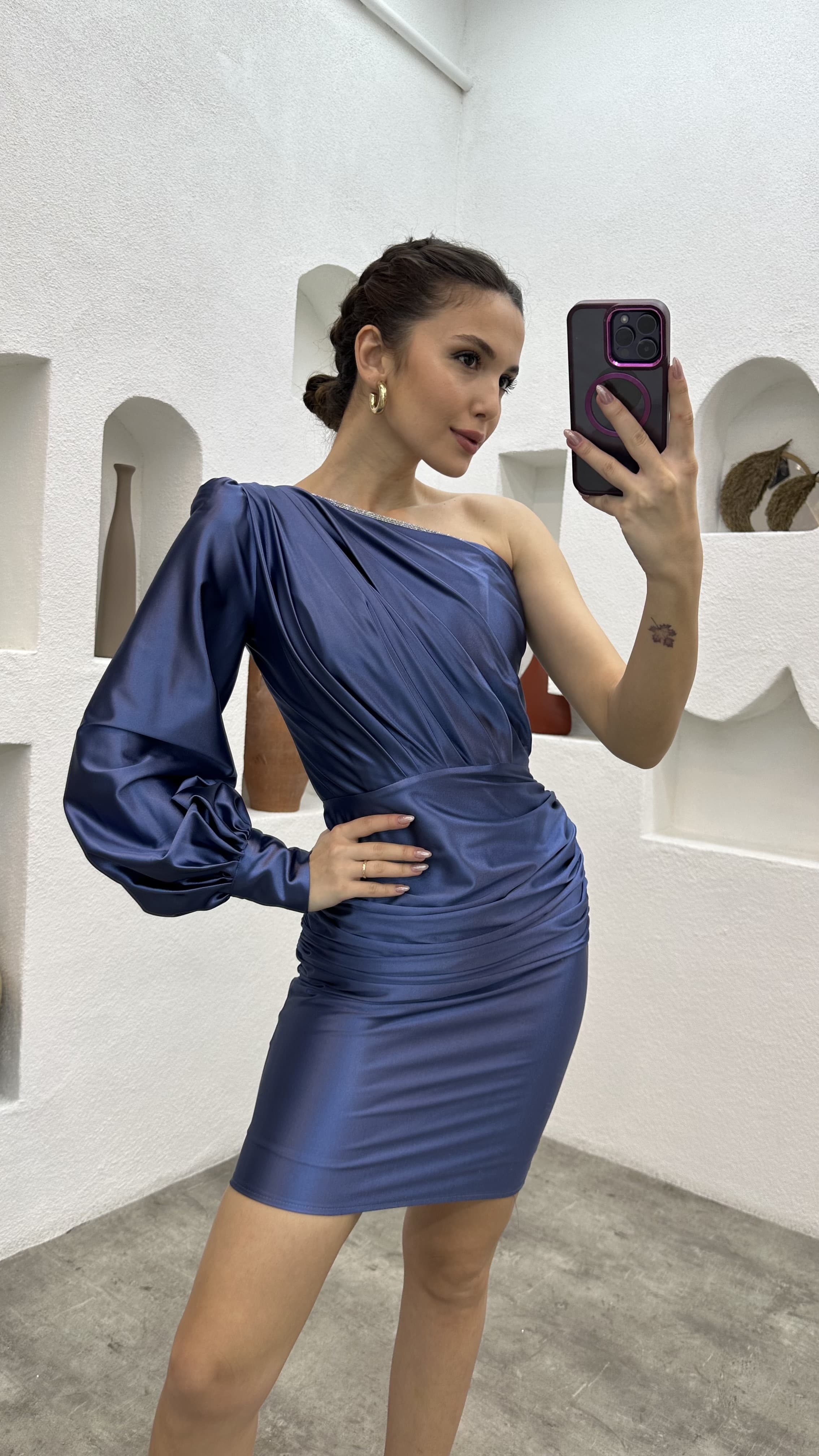 • İndigo Tek Omuz Drapeli Saten Abiye Elbise