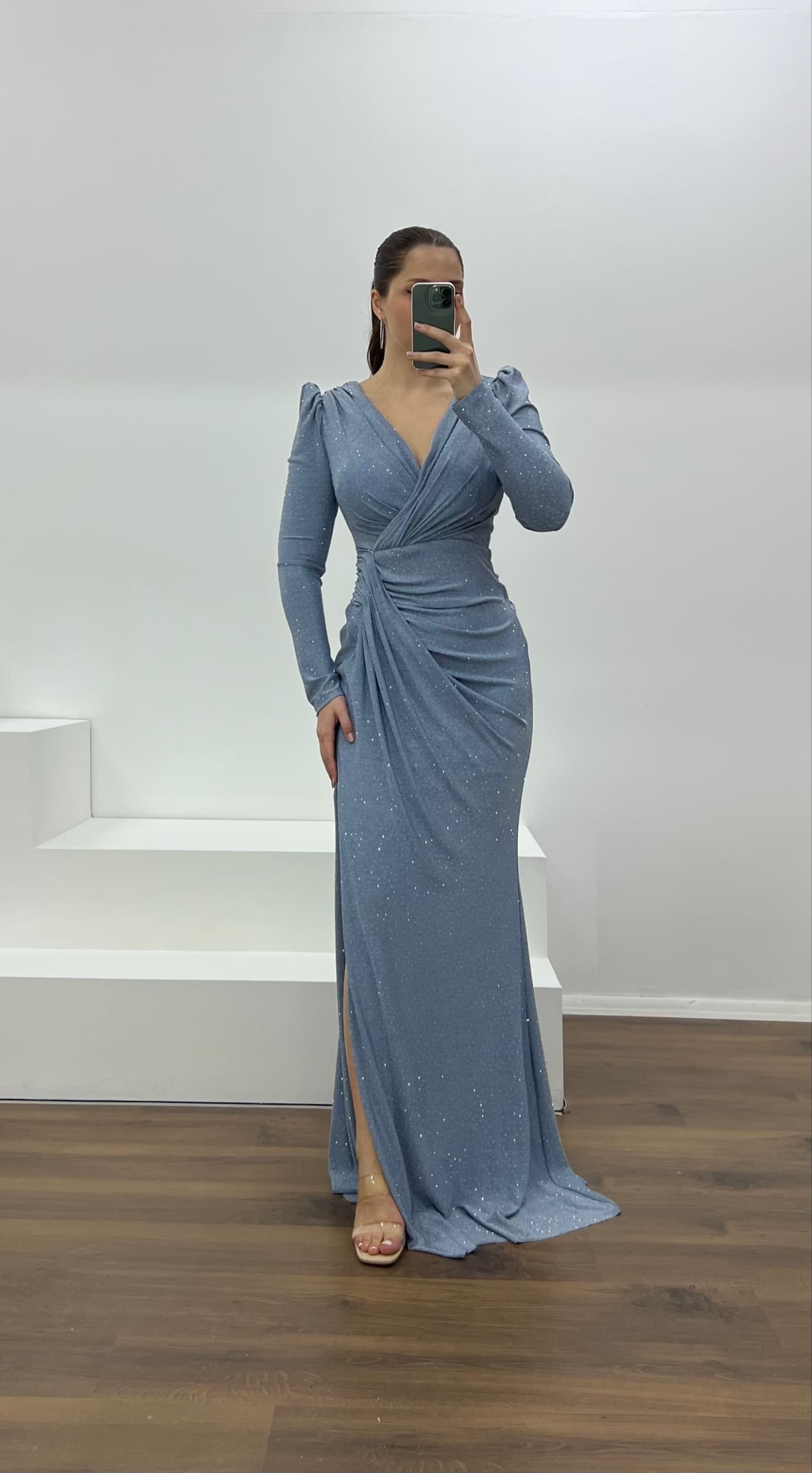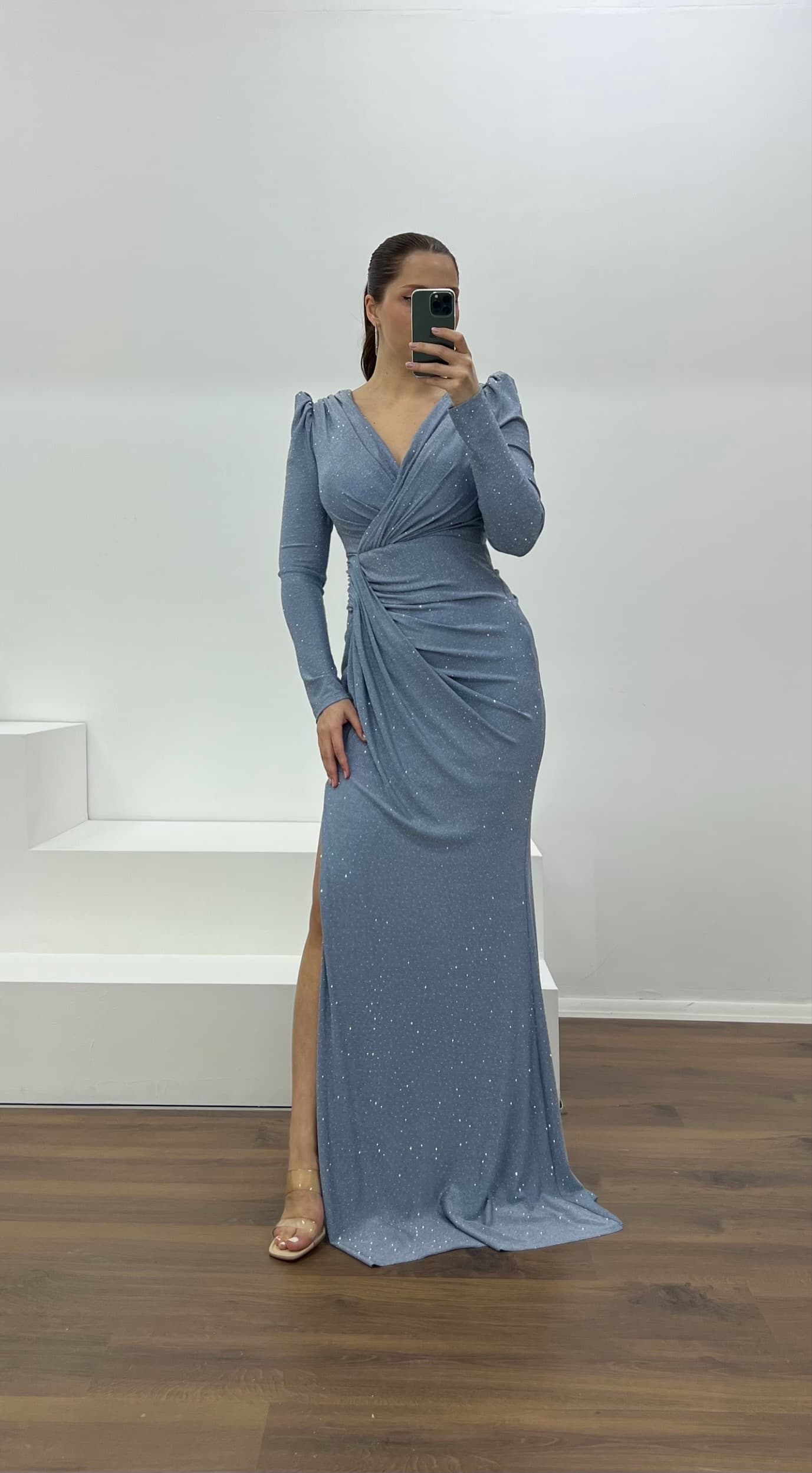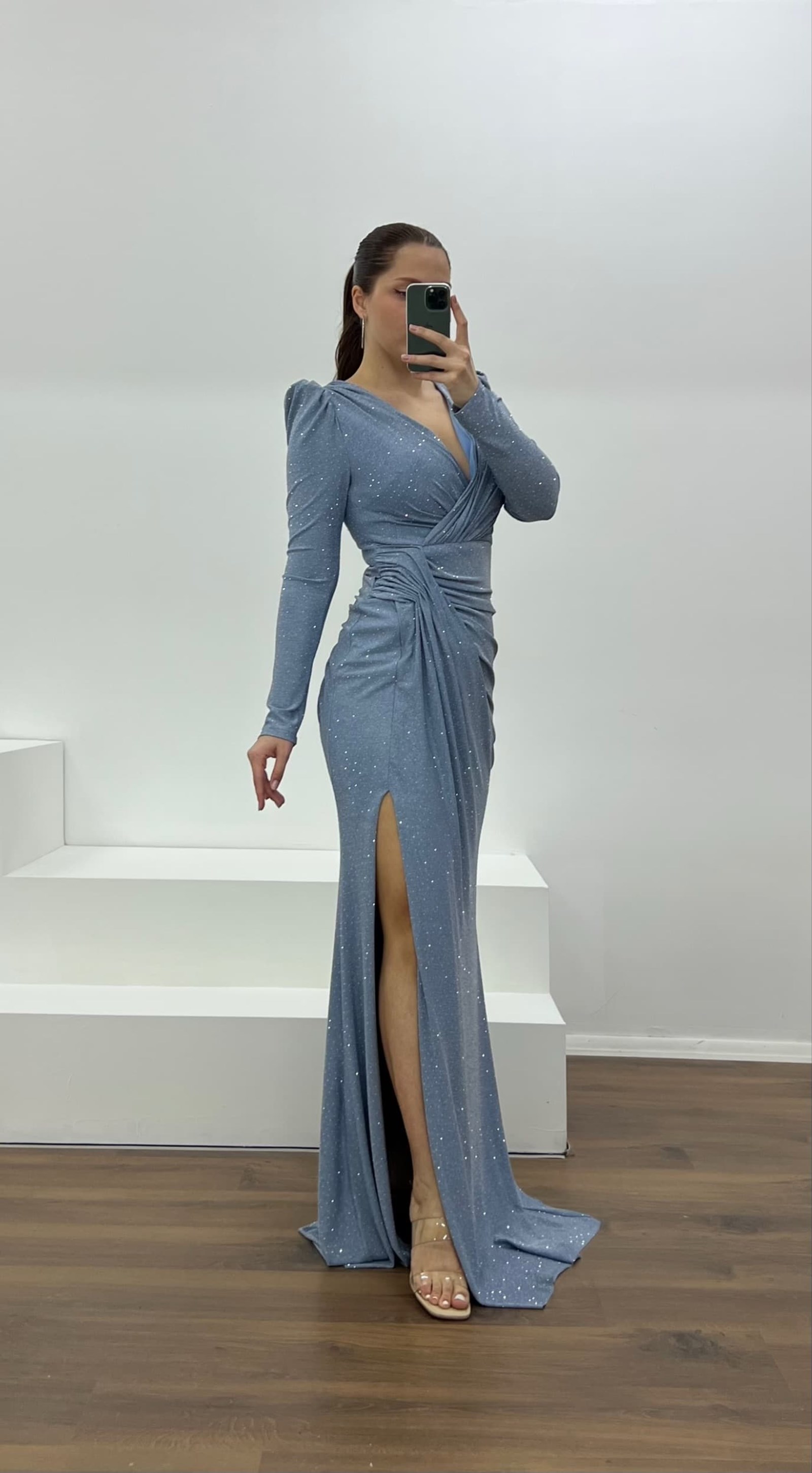 • İndigo V Yaka Parıltılı Büyük Abiye Elbise