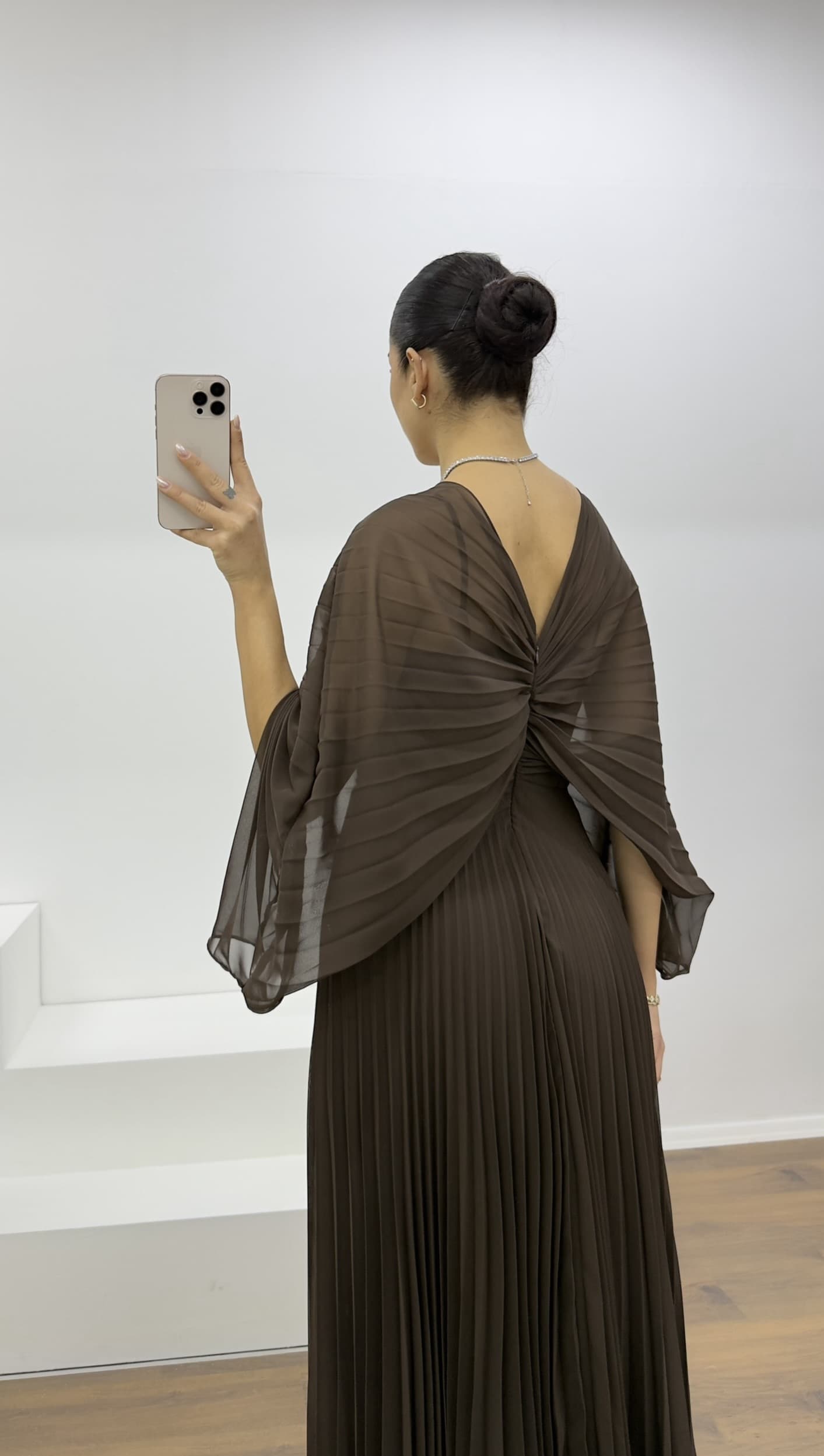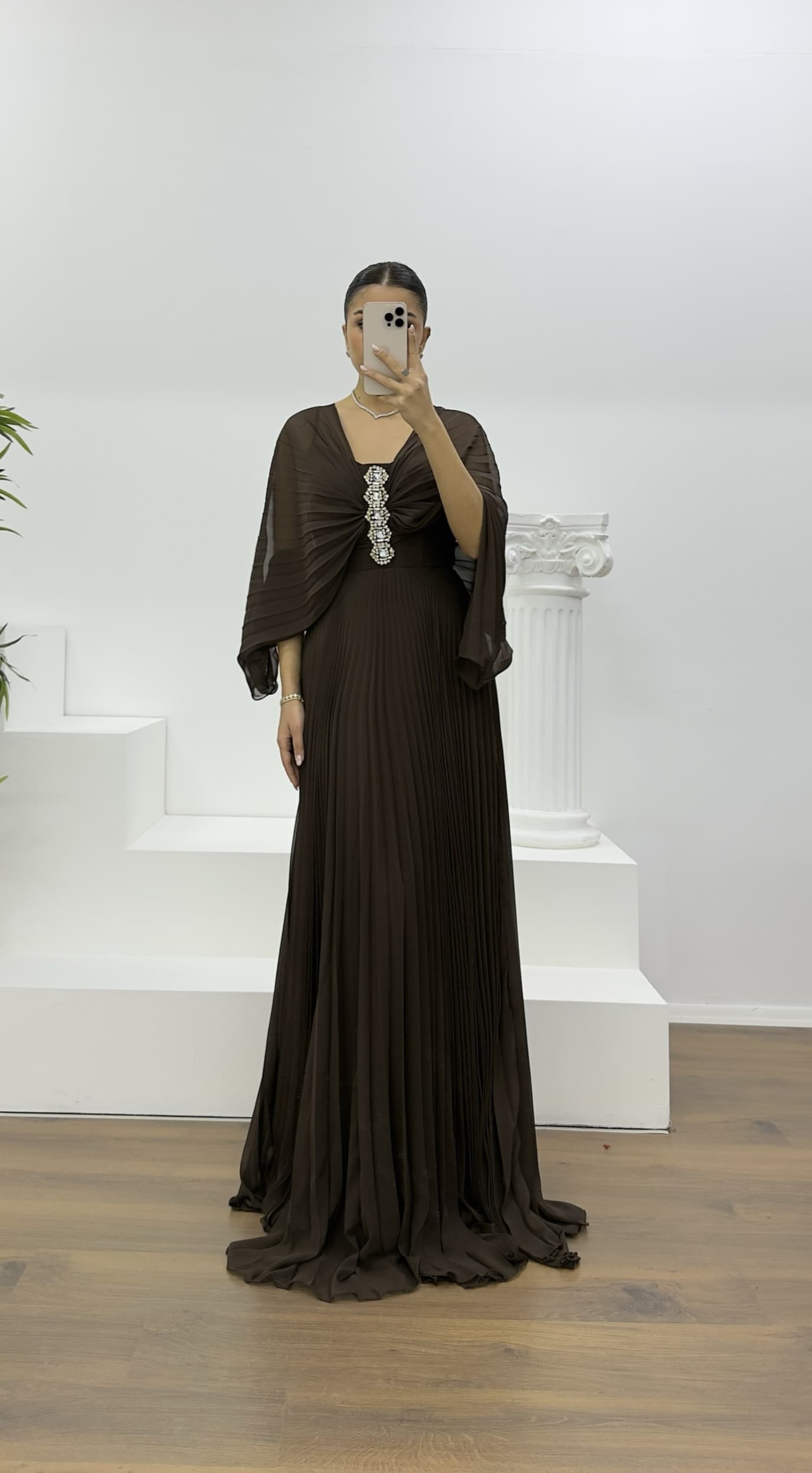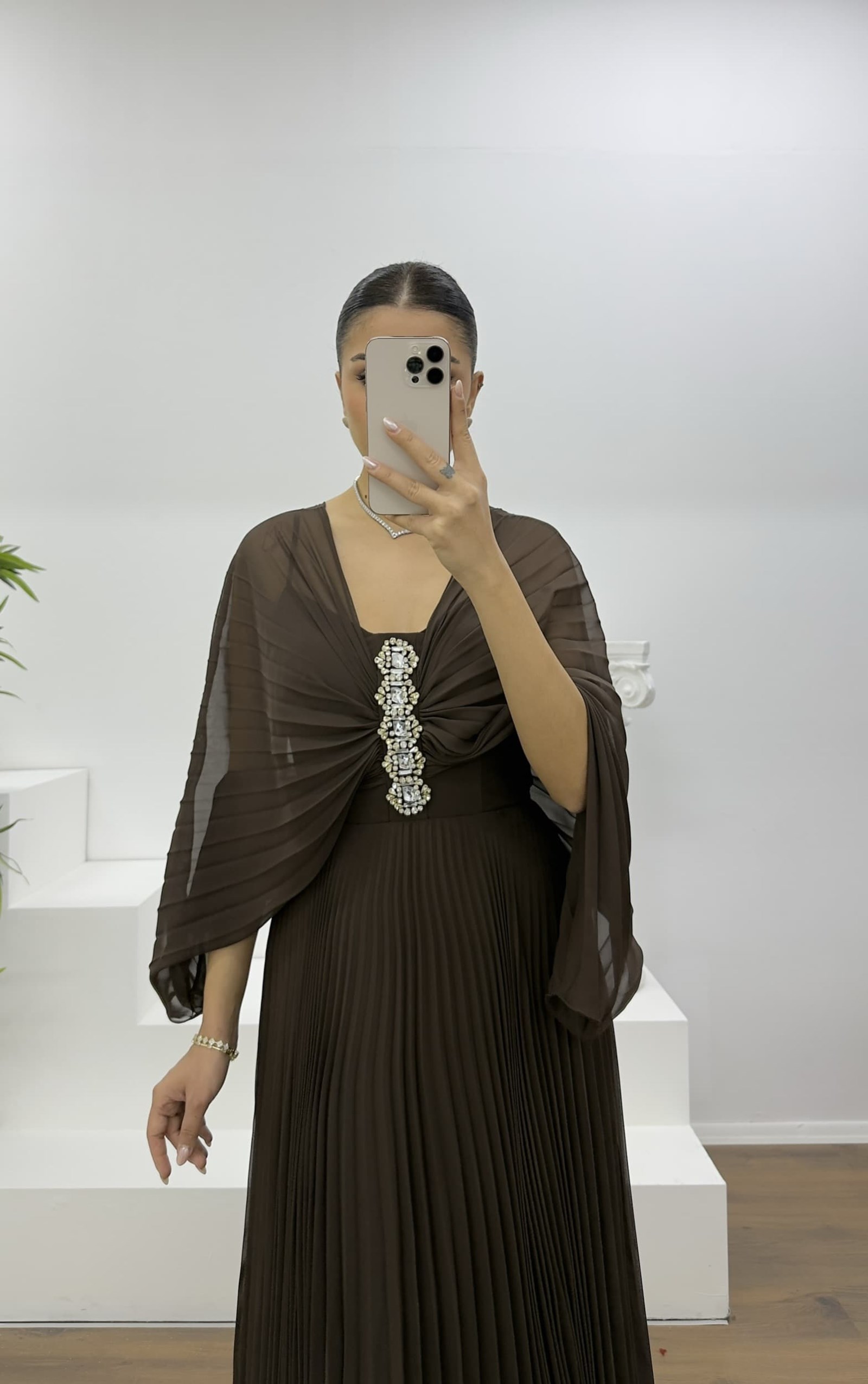 • Kahve Broş Detaylı Melek Kanadı Şifon Abiye Elbise