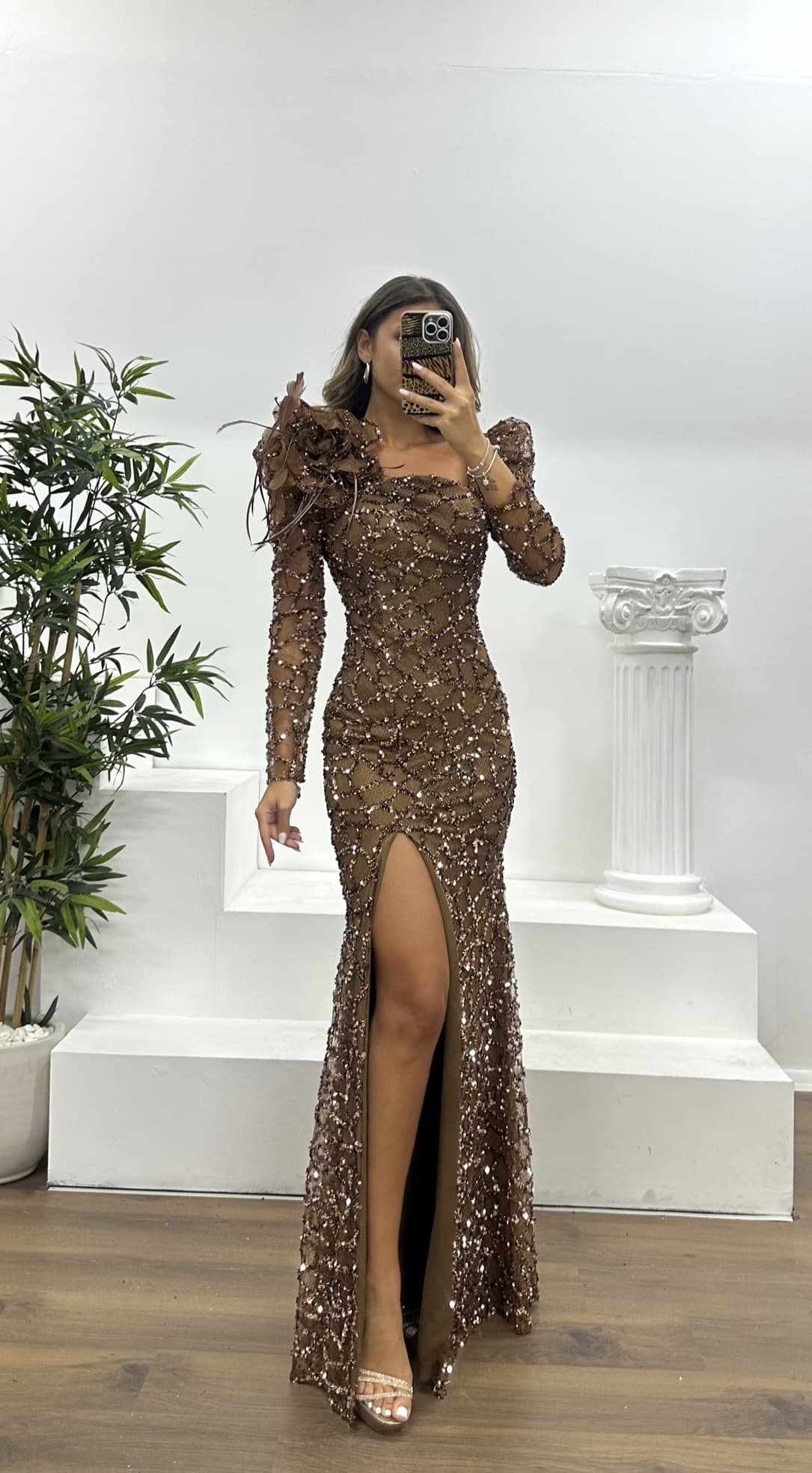 Ürün 36-42 bedene kadar uyumlu, göğüs pedli, astarlı, arka kapama fermuar, yırtmaçlı, omuz detay abiye olarak tasarlanmıştır.