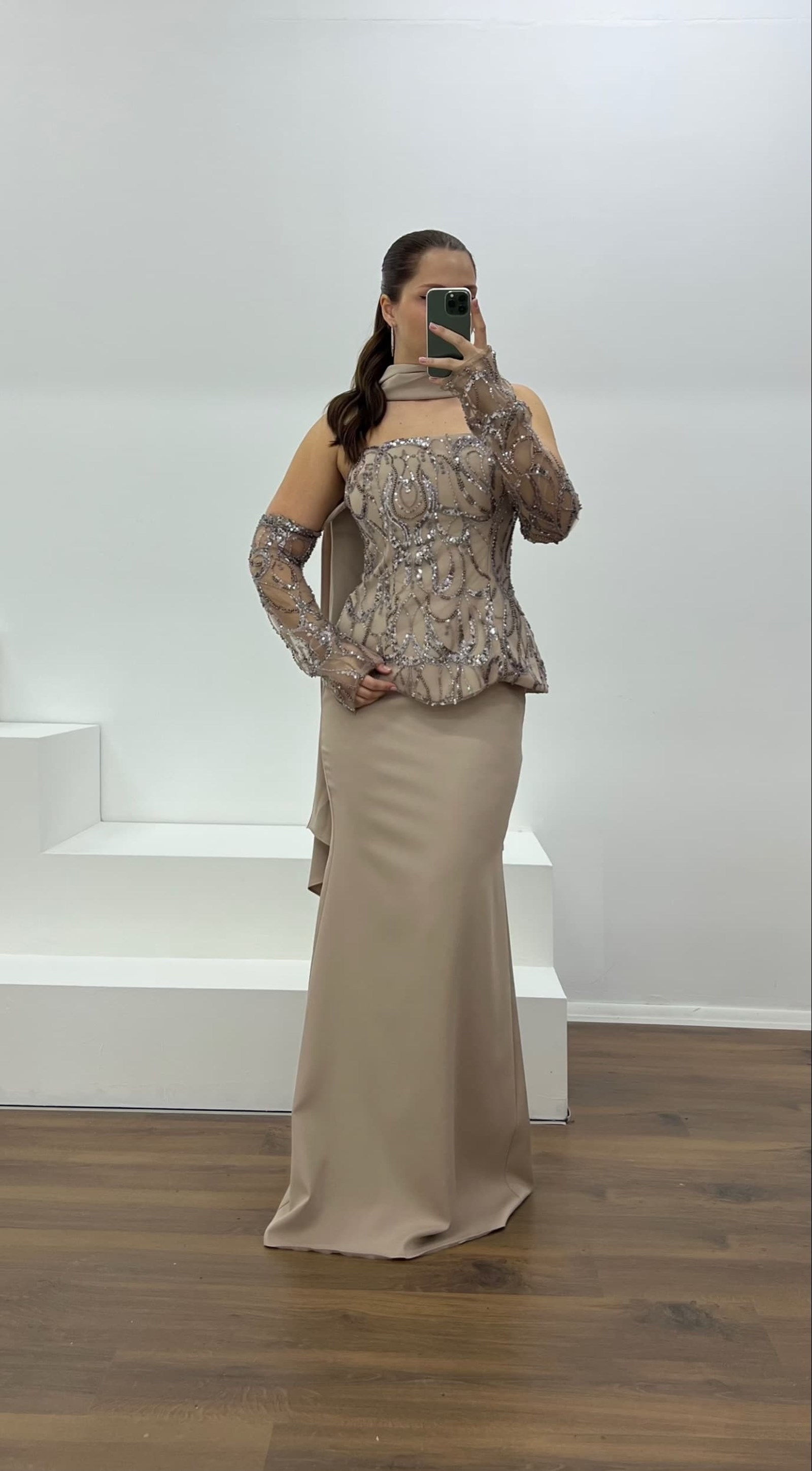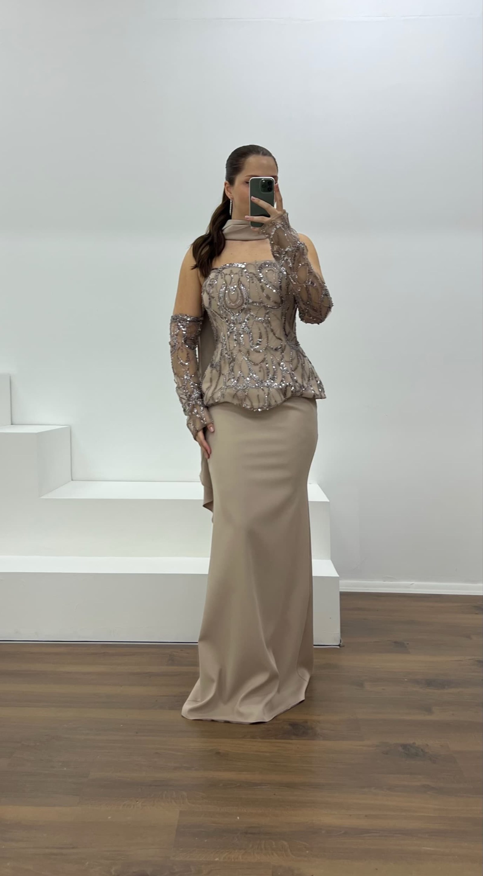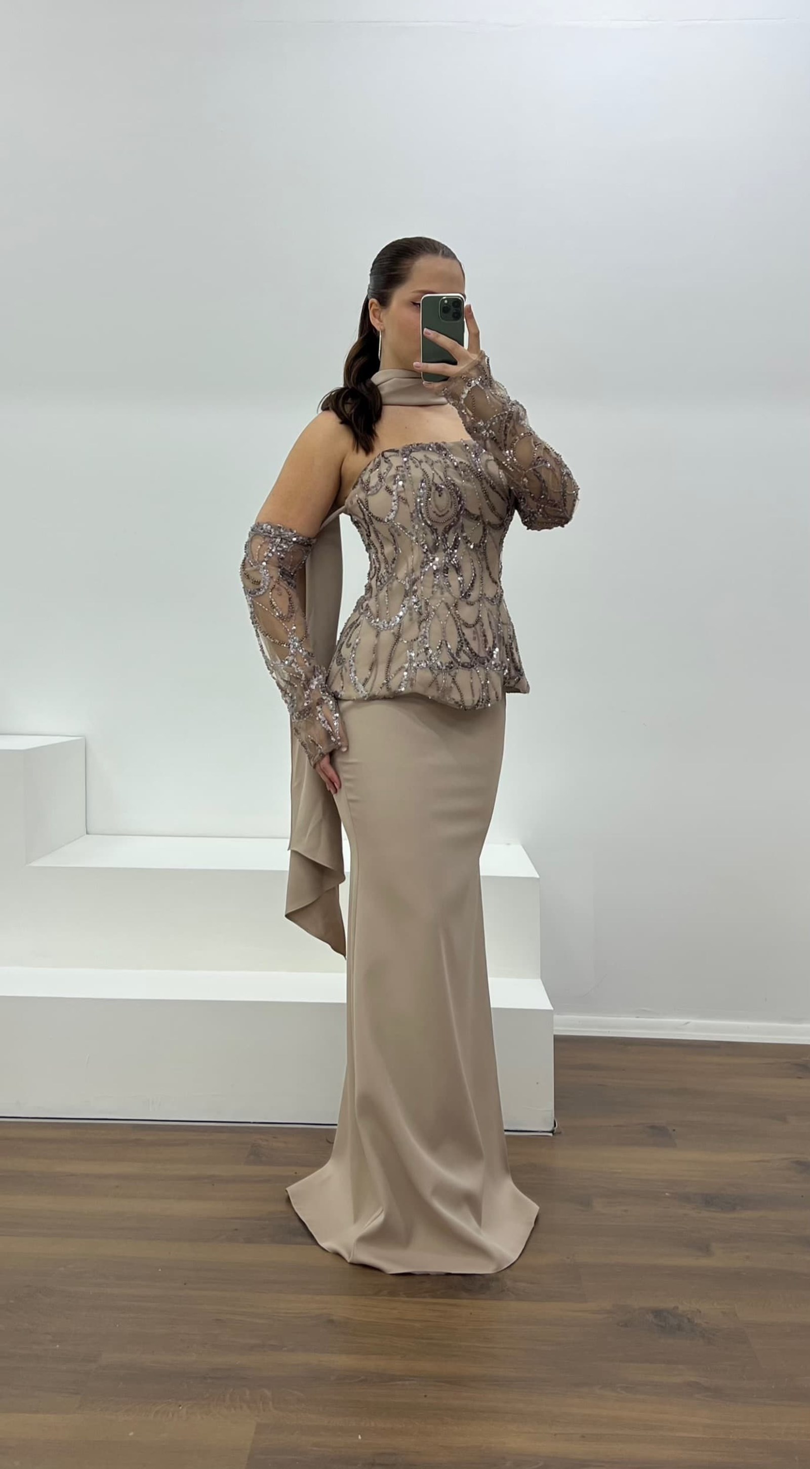 • Bej Straplez İşleme Detay Büyük Beden Abiye Elbise