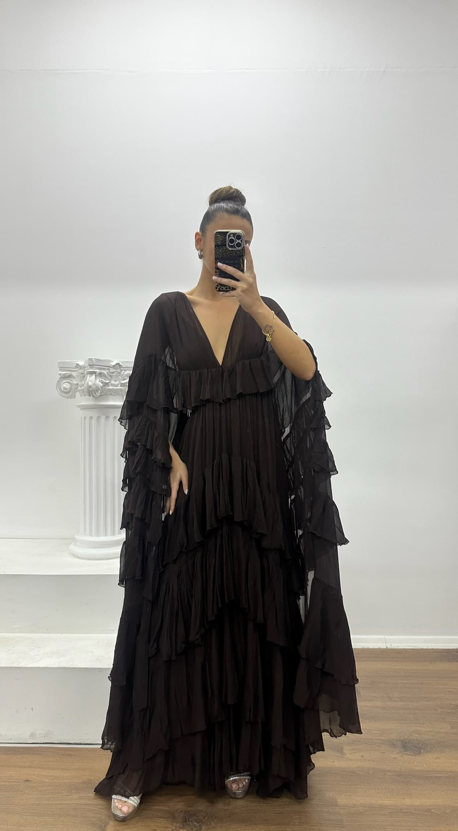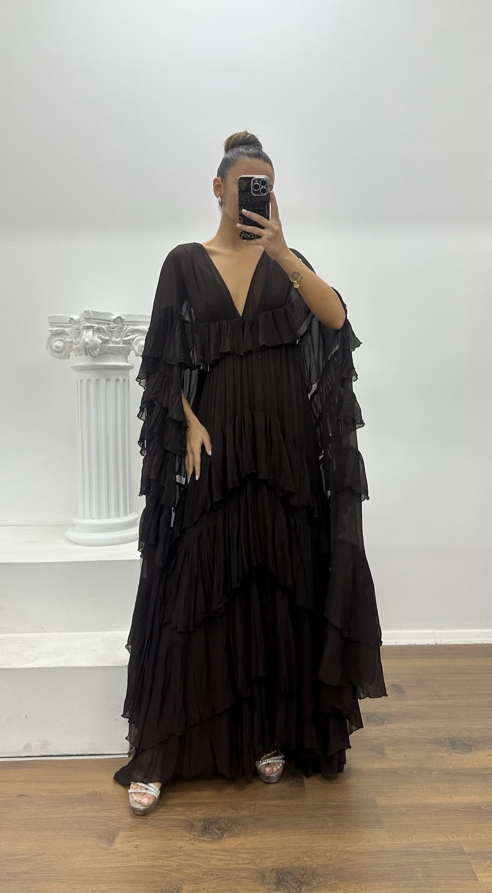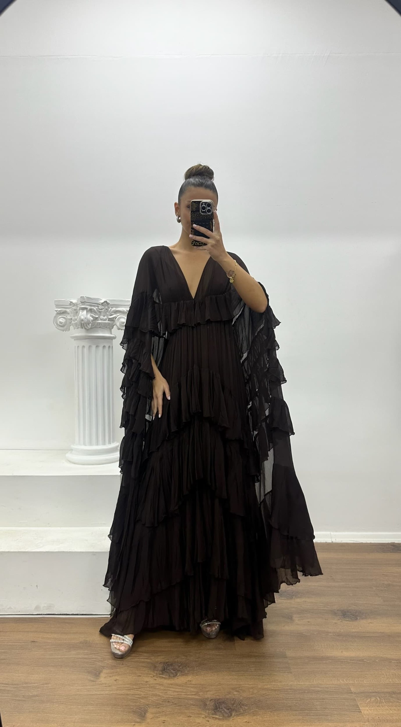 Kahverengi Bohem Fırfır Detaylı Özel Tasarım Abiye Elbise