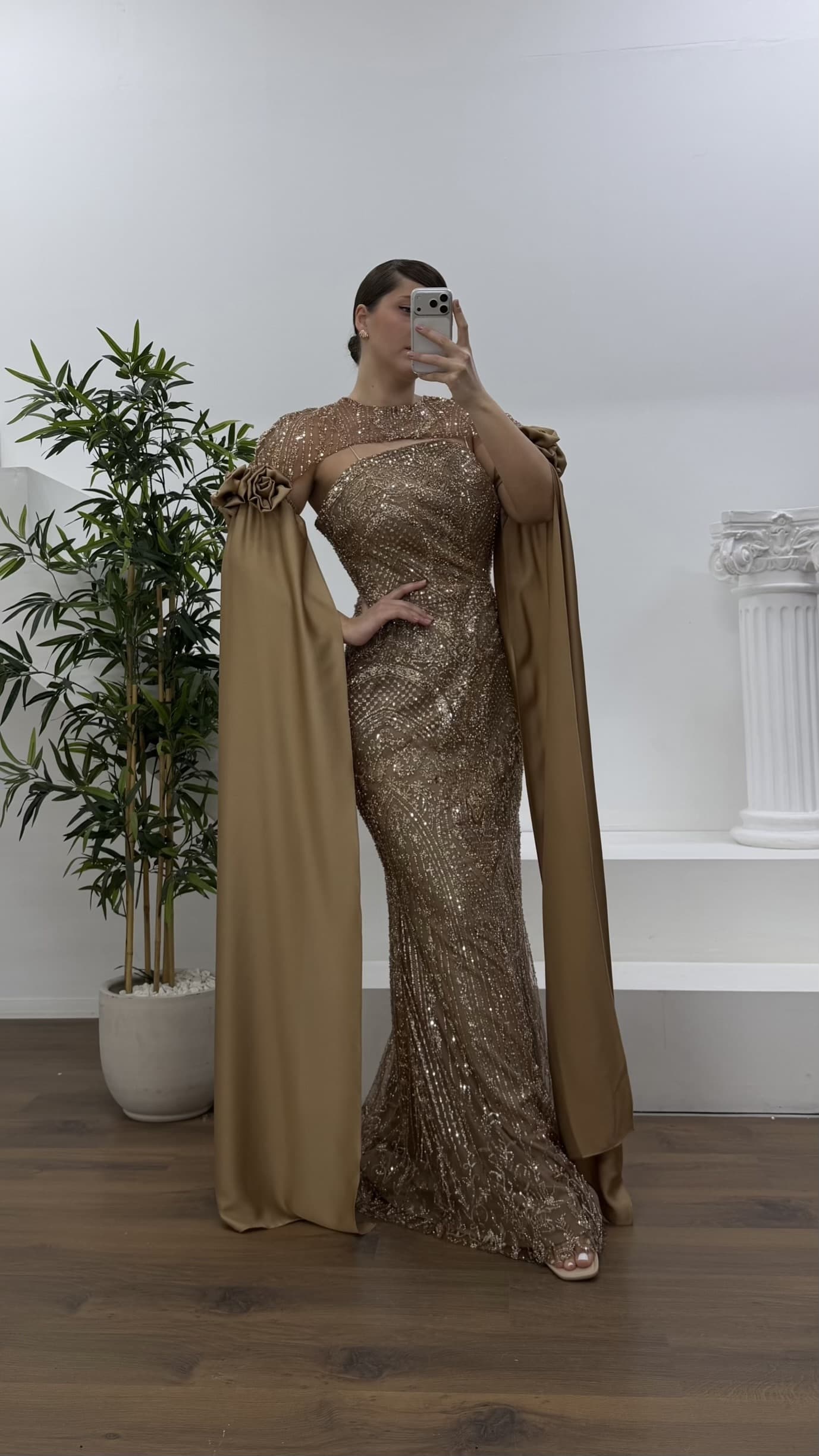 • Kahverengi Çiçek Detaylı Uzun Saten Pelerin Kollu Büyük Beden Abiye Elbise