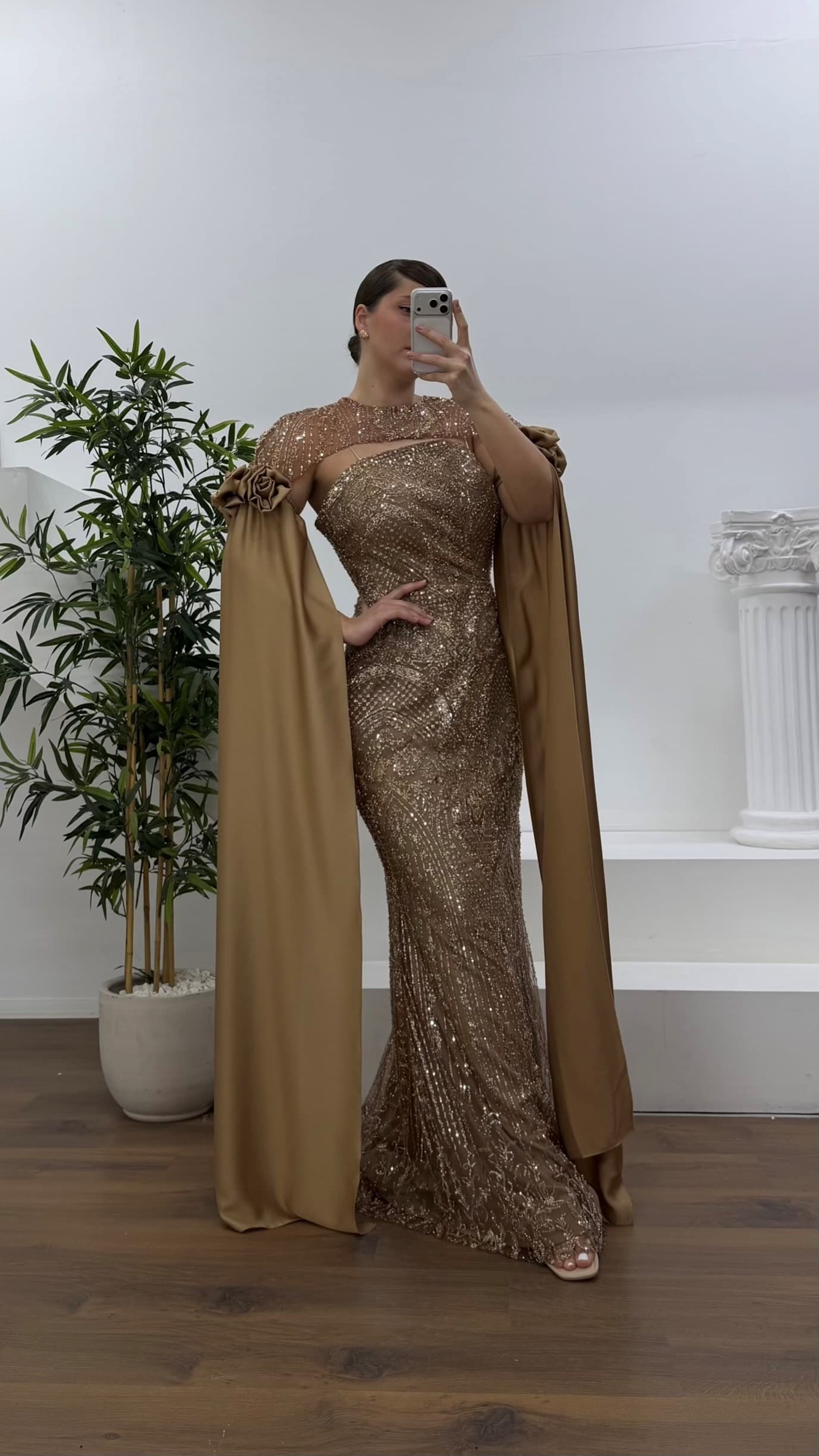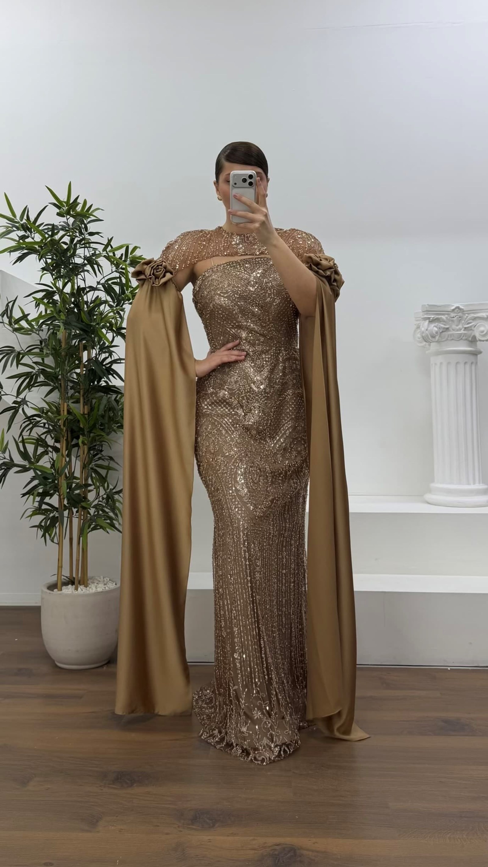• Gold Çiçek Detaylı Uzun Saten Pelerin Kollu Büyük Beden Abiye Elbise