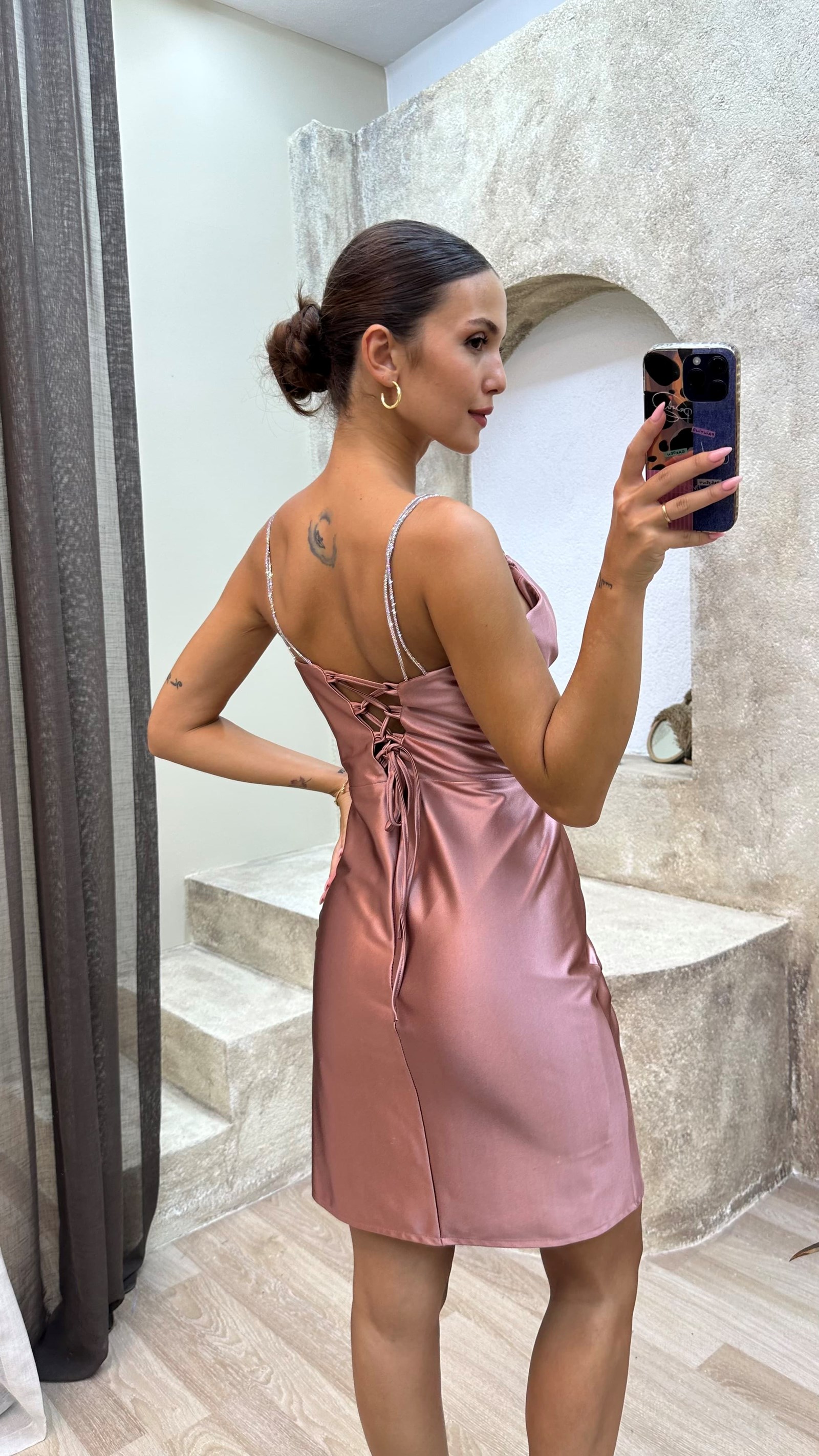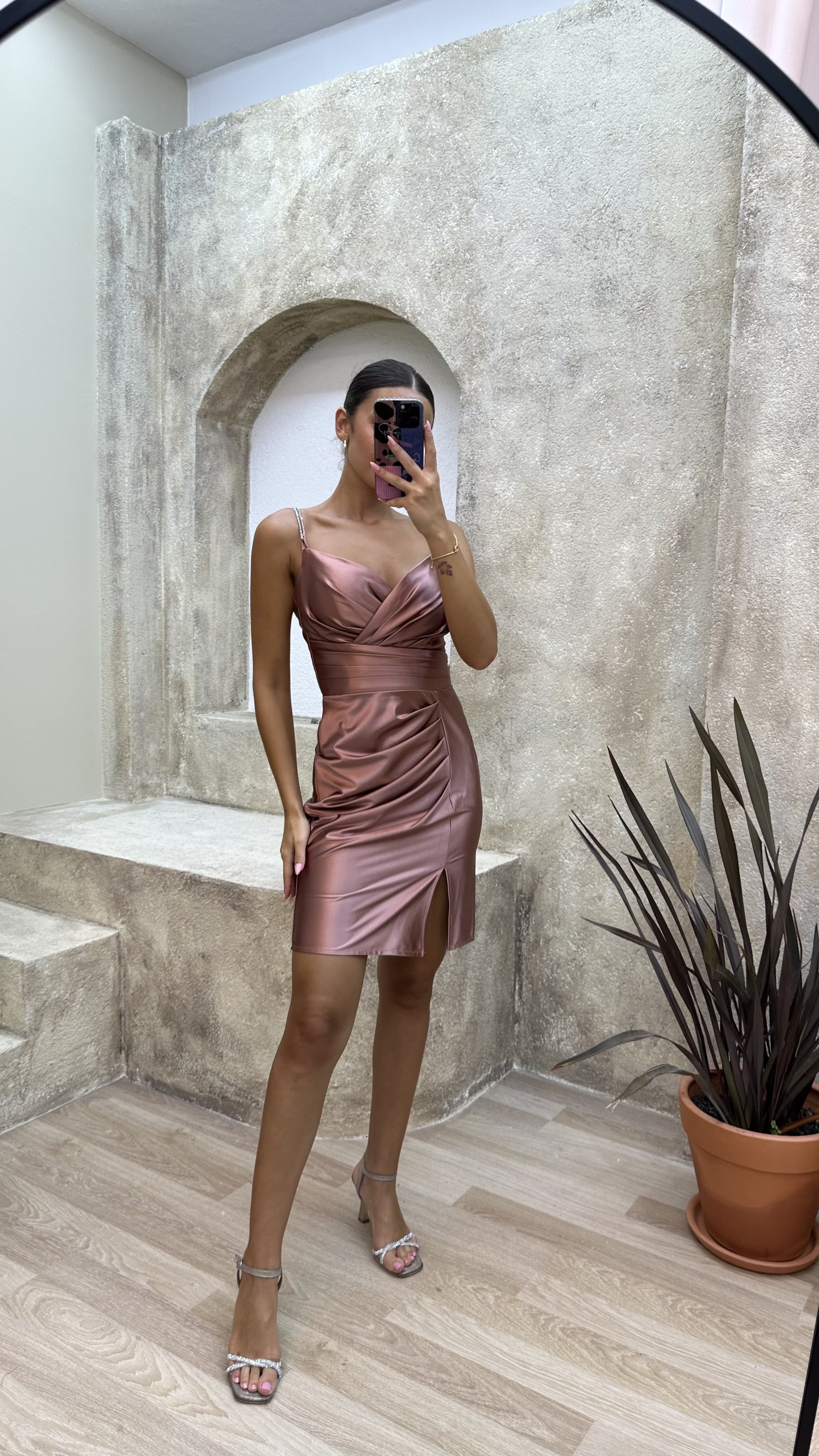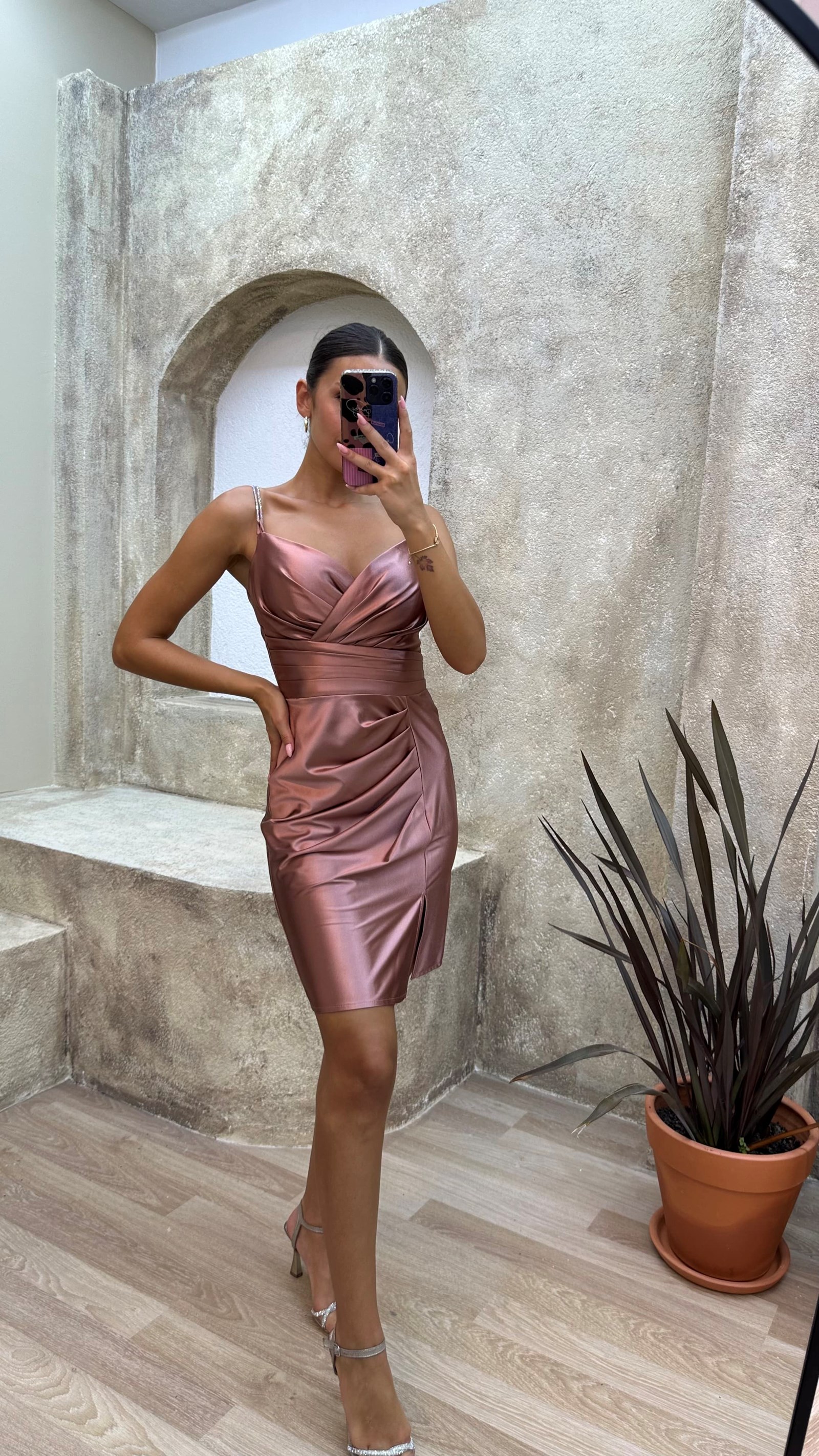 • Kahverengi Drapeli Saten Mini Abiye Elbise