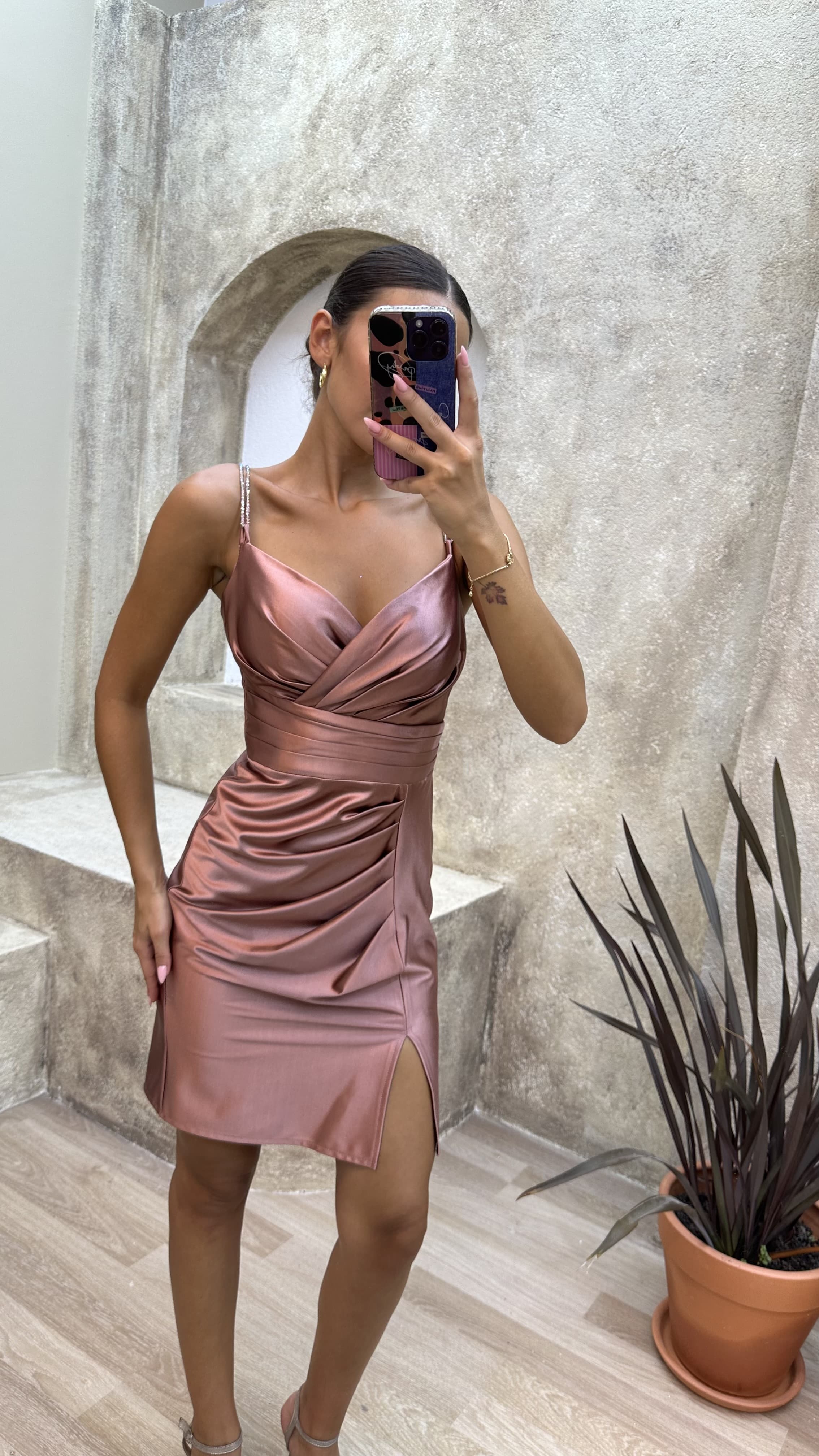 Kahverengi Drapeli Saten Mini Abiye Elbise