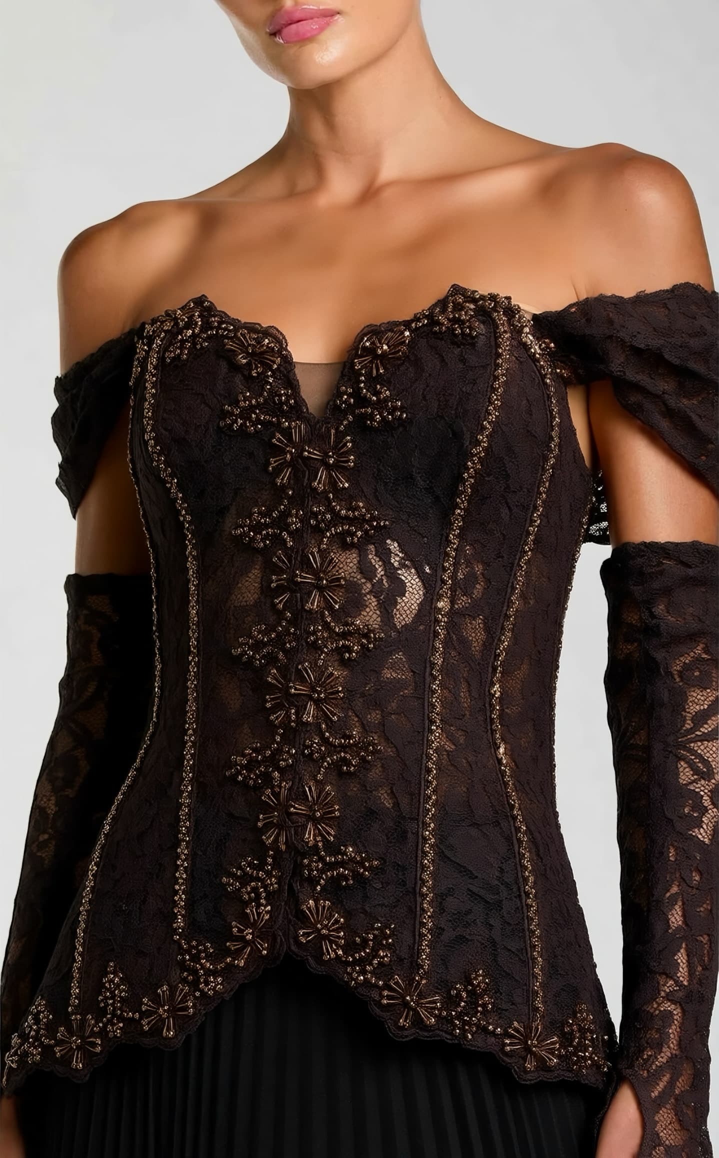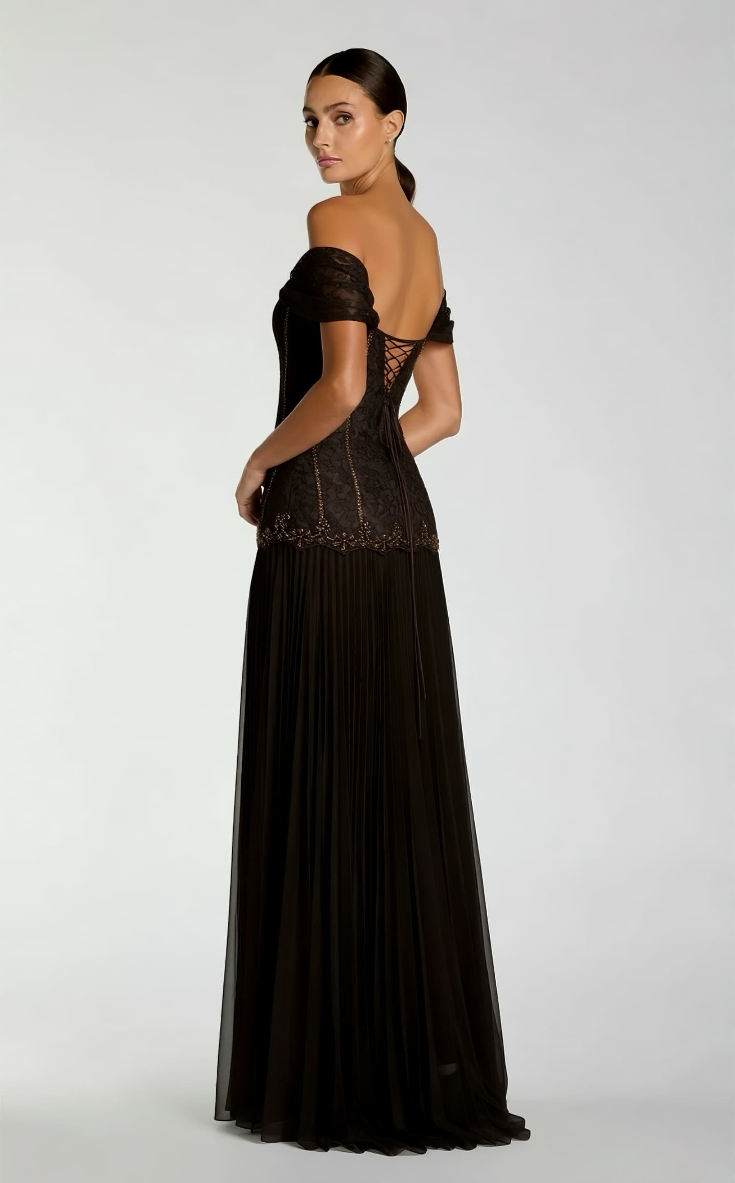 • Kahverengi Düşük Omuzlu Pileli Abiye Elbise