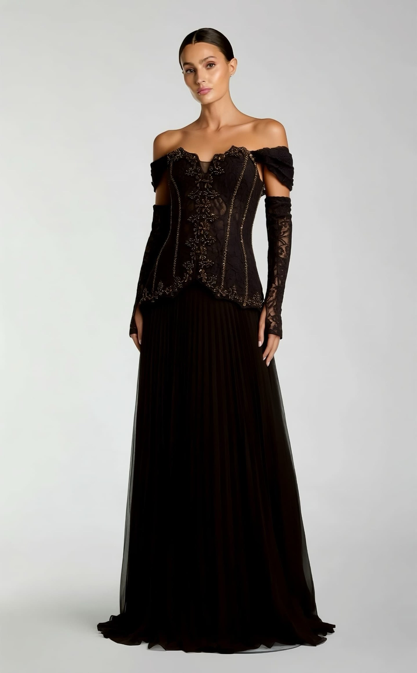 • Siyah Düşük Omuzlu Pileli Abiye Elbise