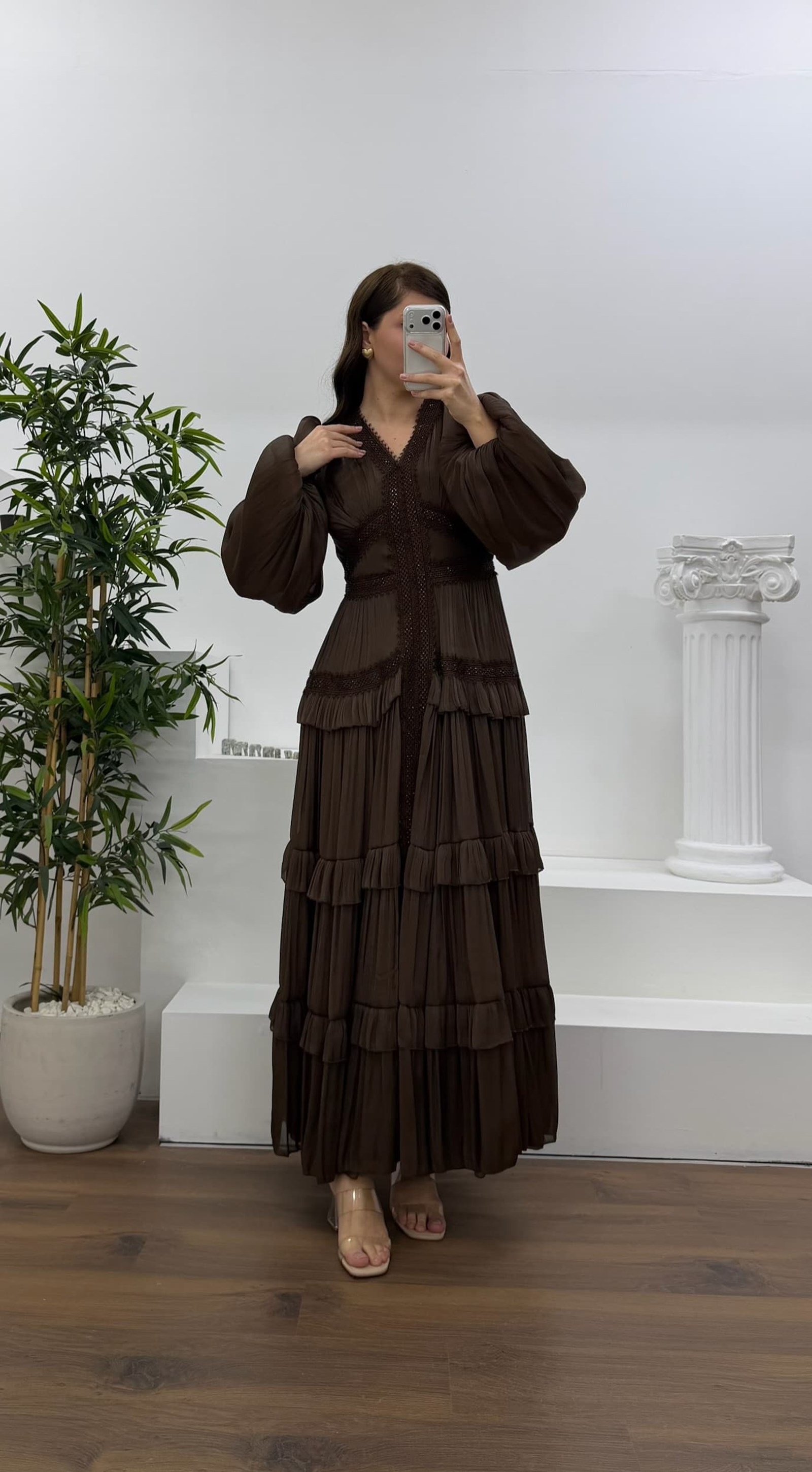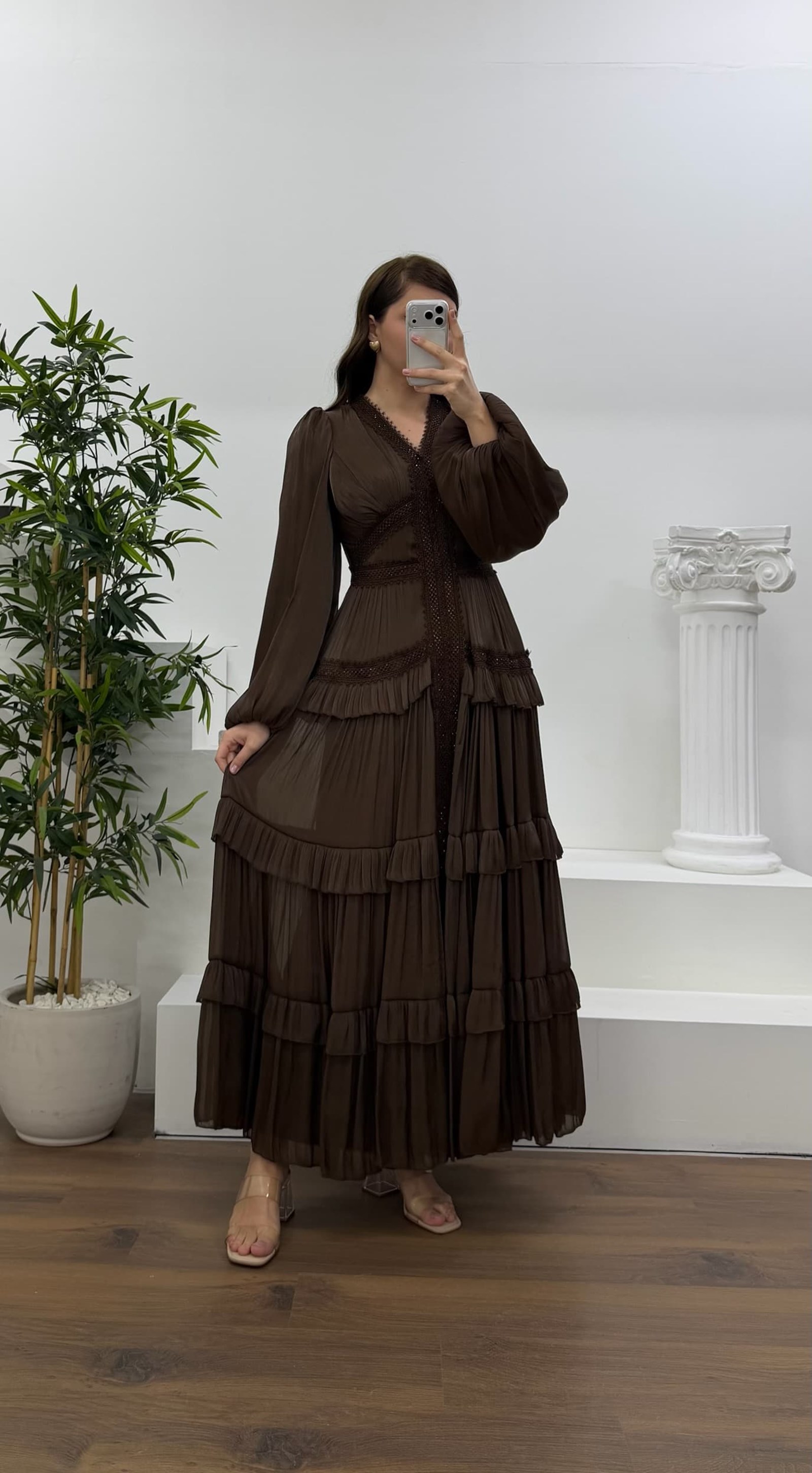 Kahverengi Kat Kat Şifon Büyük Beden Abiye Elbise