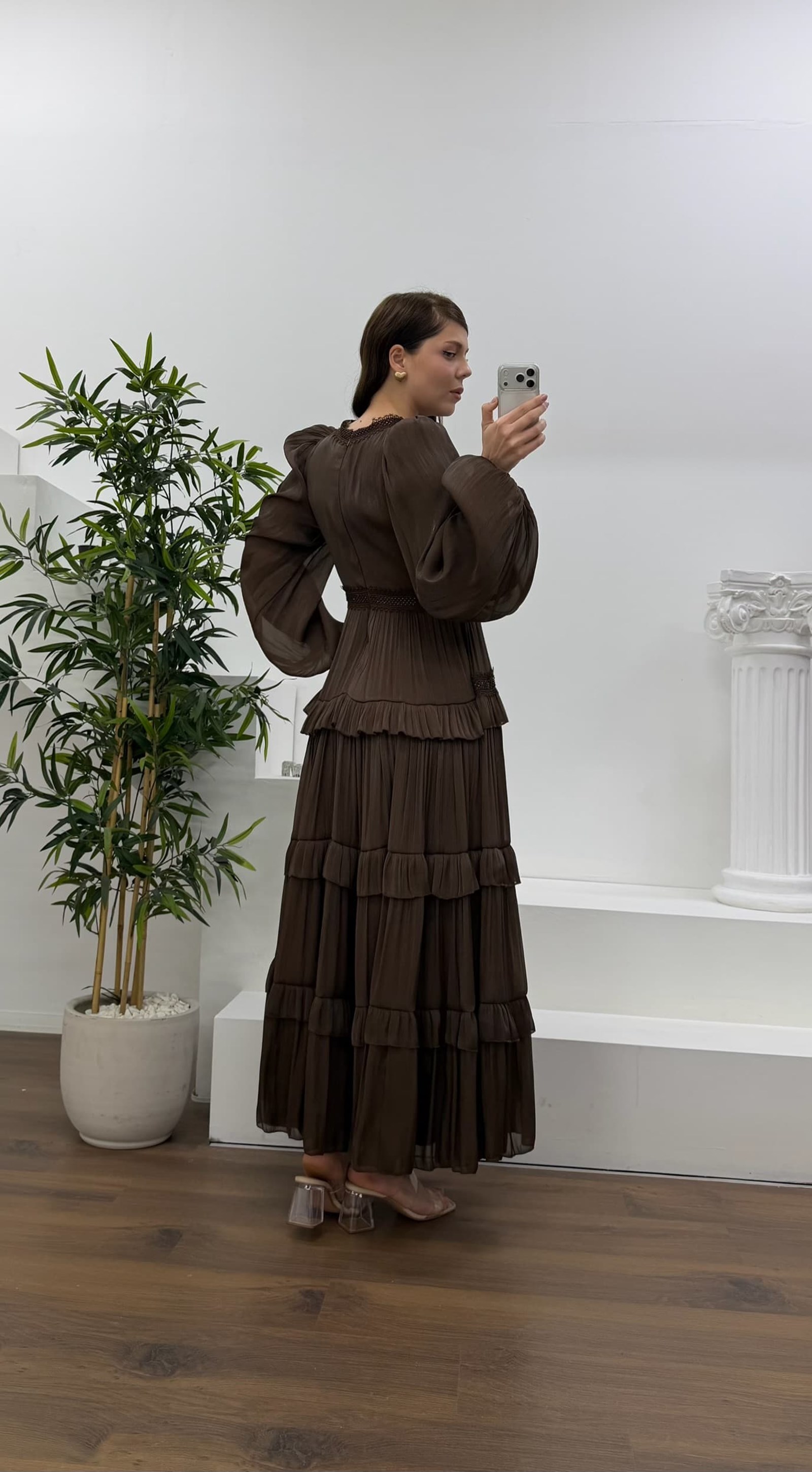 • Kahverengi Kat Kat Şifon Büyük Beden Abiye Elbise