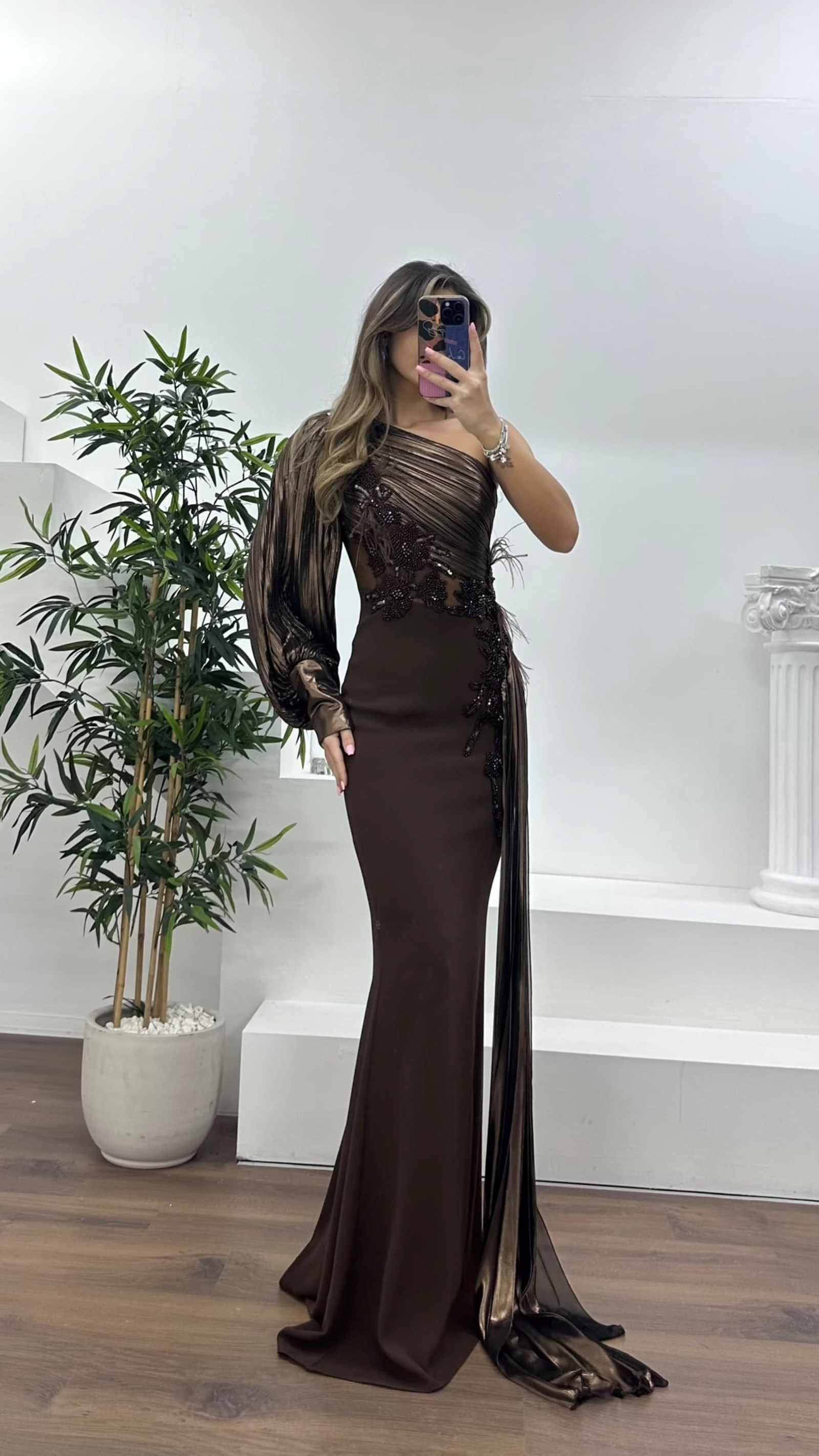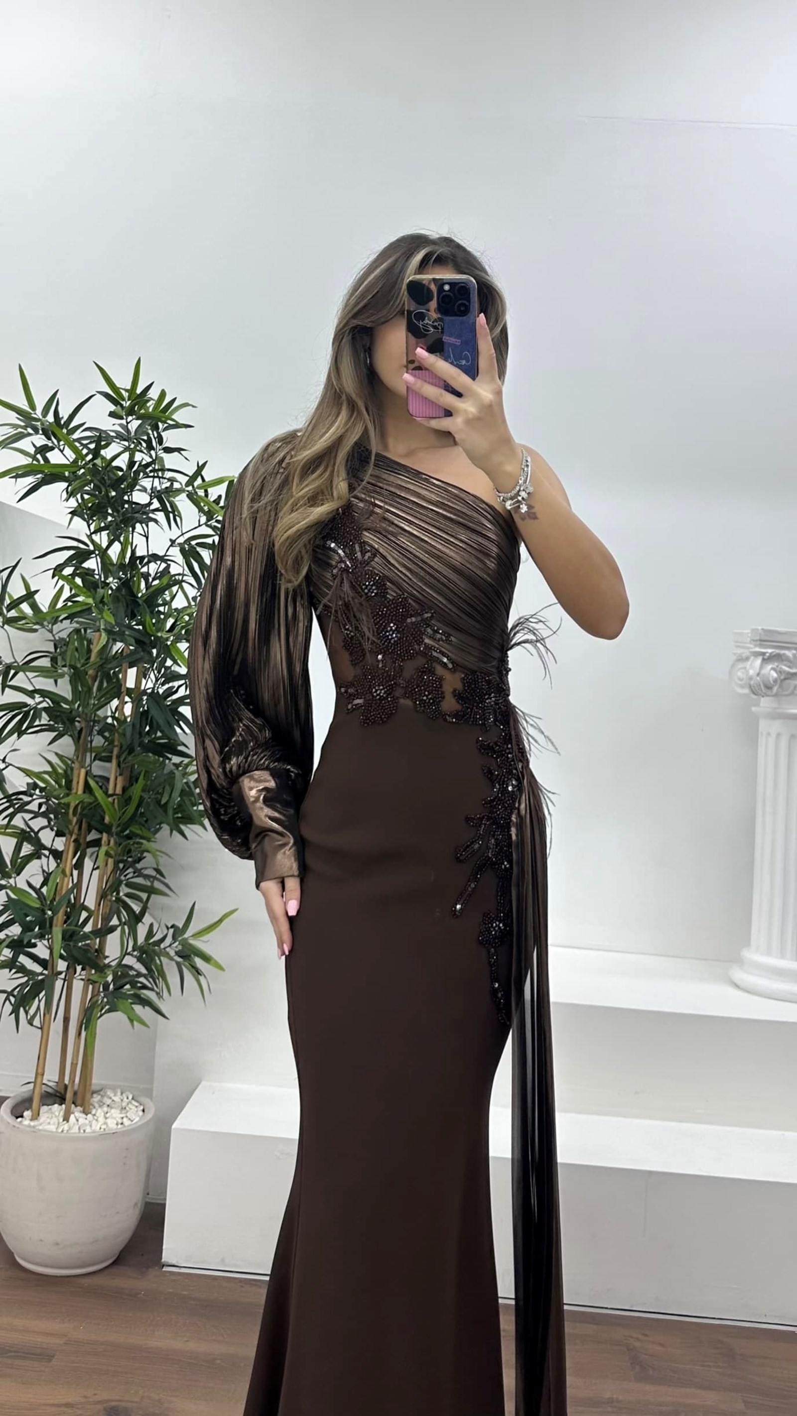 Pileli tek omuz çiçeklerle süslenmiş drapeli abiye elbise