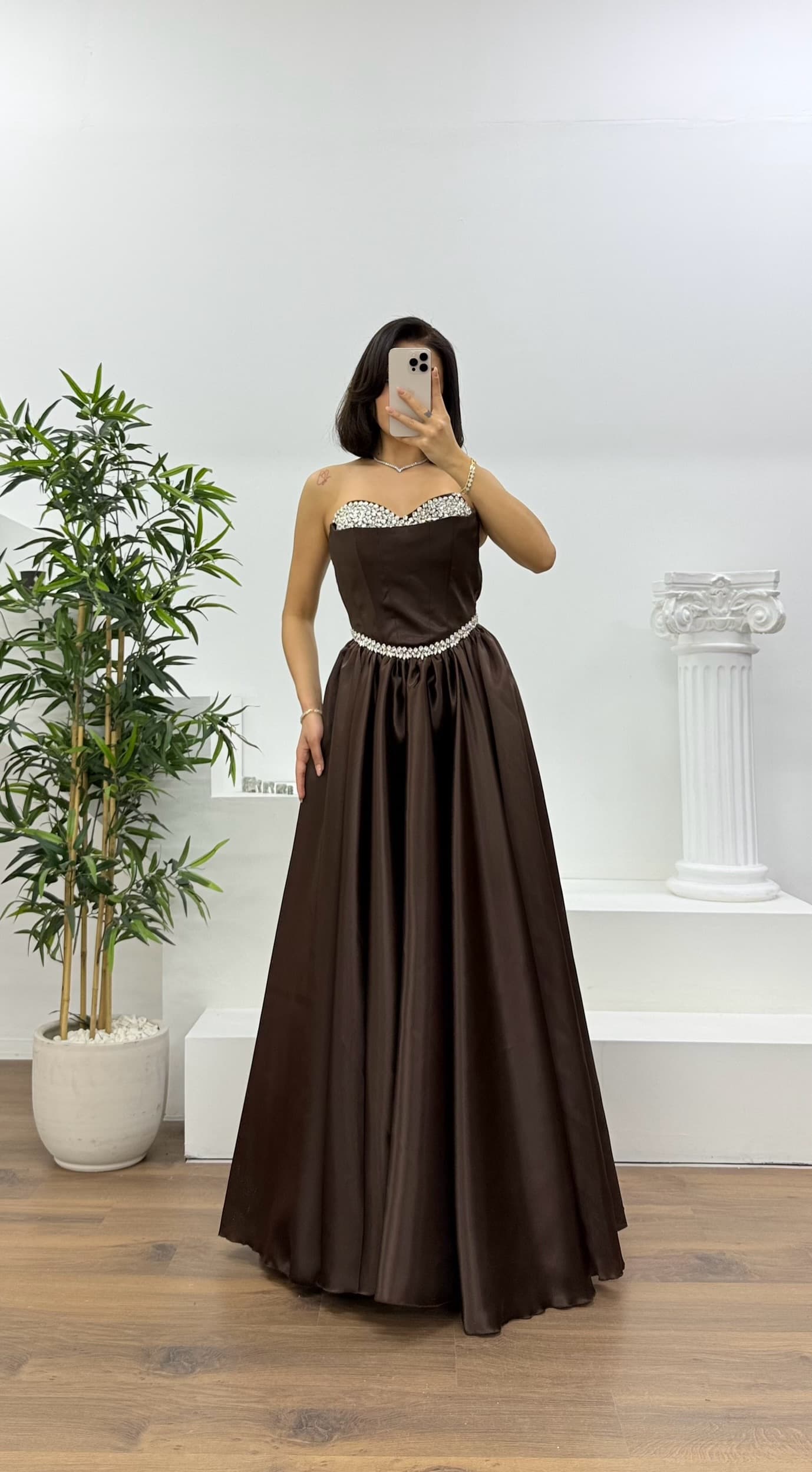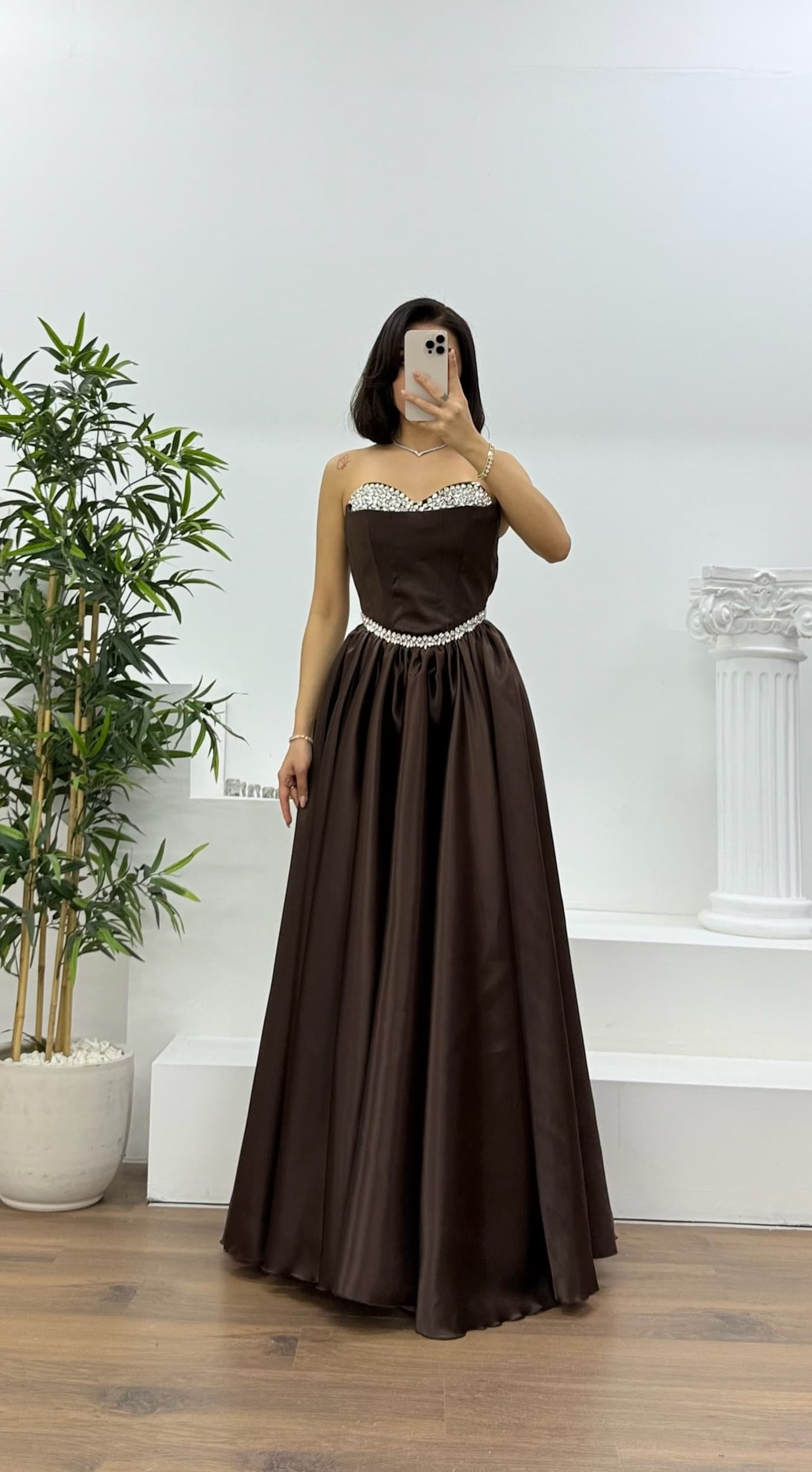 • Kahverengi Prenses Kesim Kabarık Taşlı Straplez Abiye Elbise