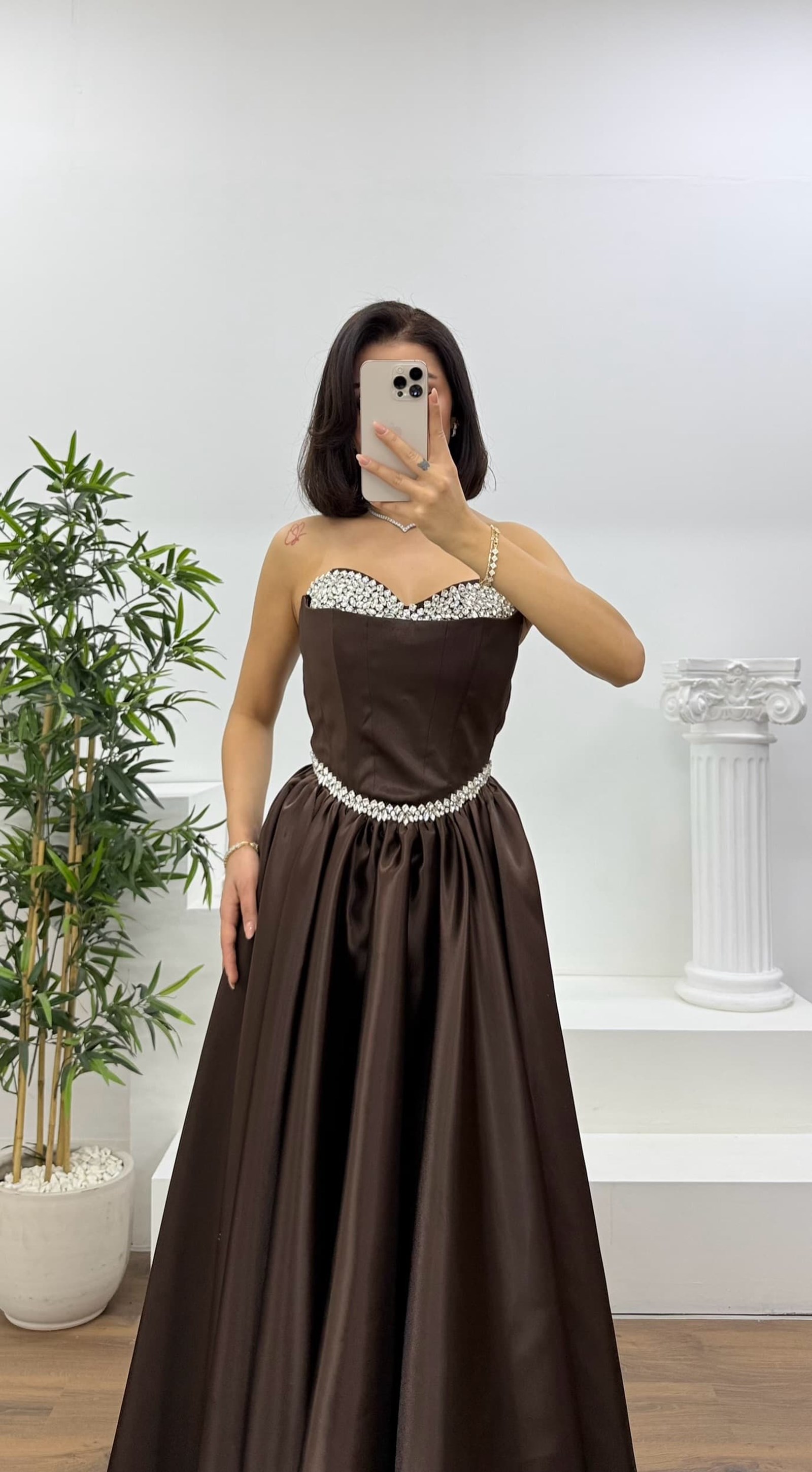 Kahverengi Prenses Kesim Kabarık Taşlı Straplez Abiye Elbise