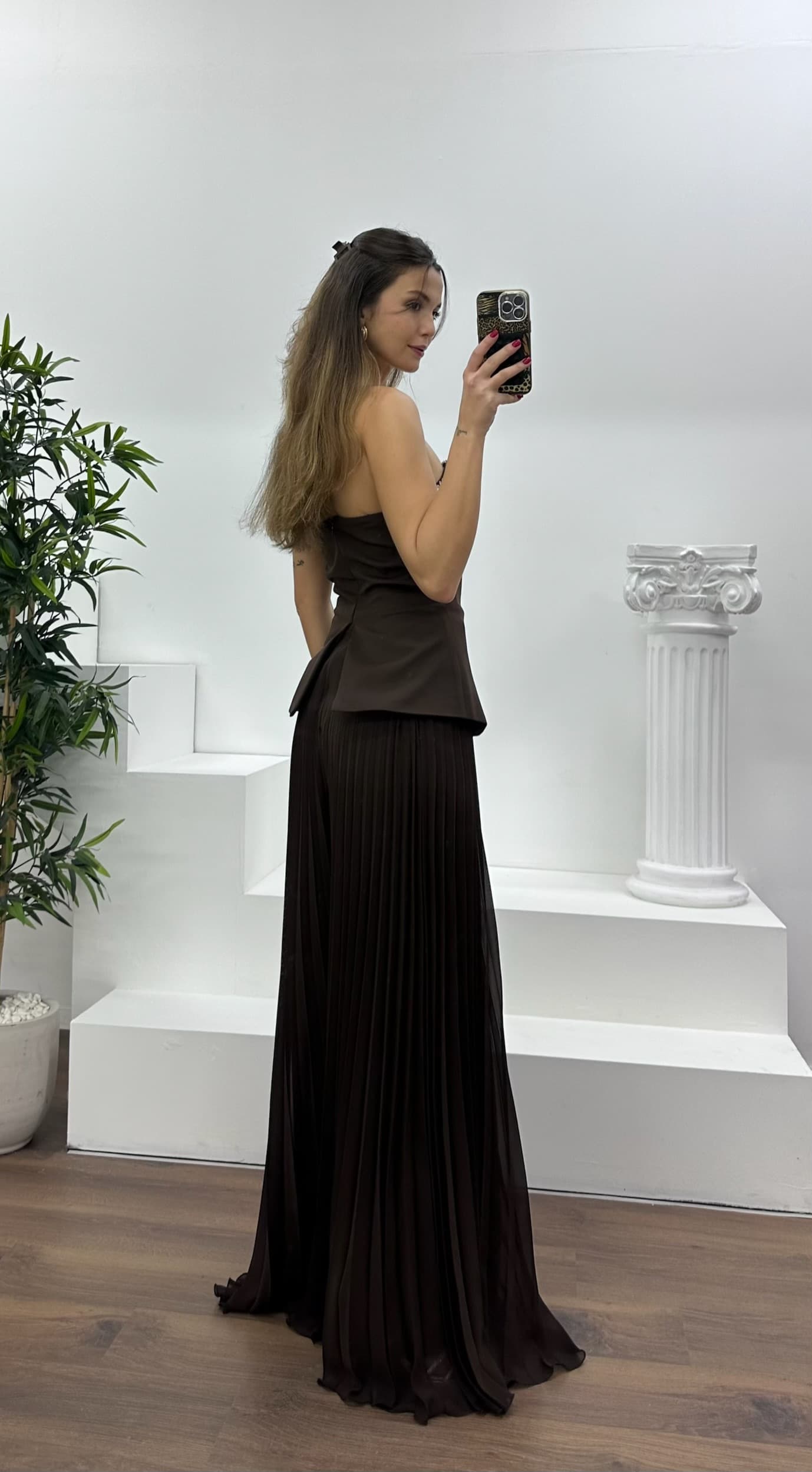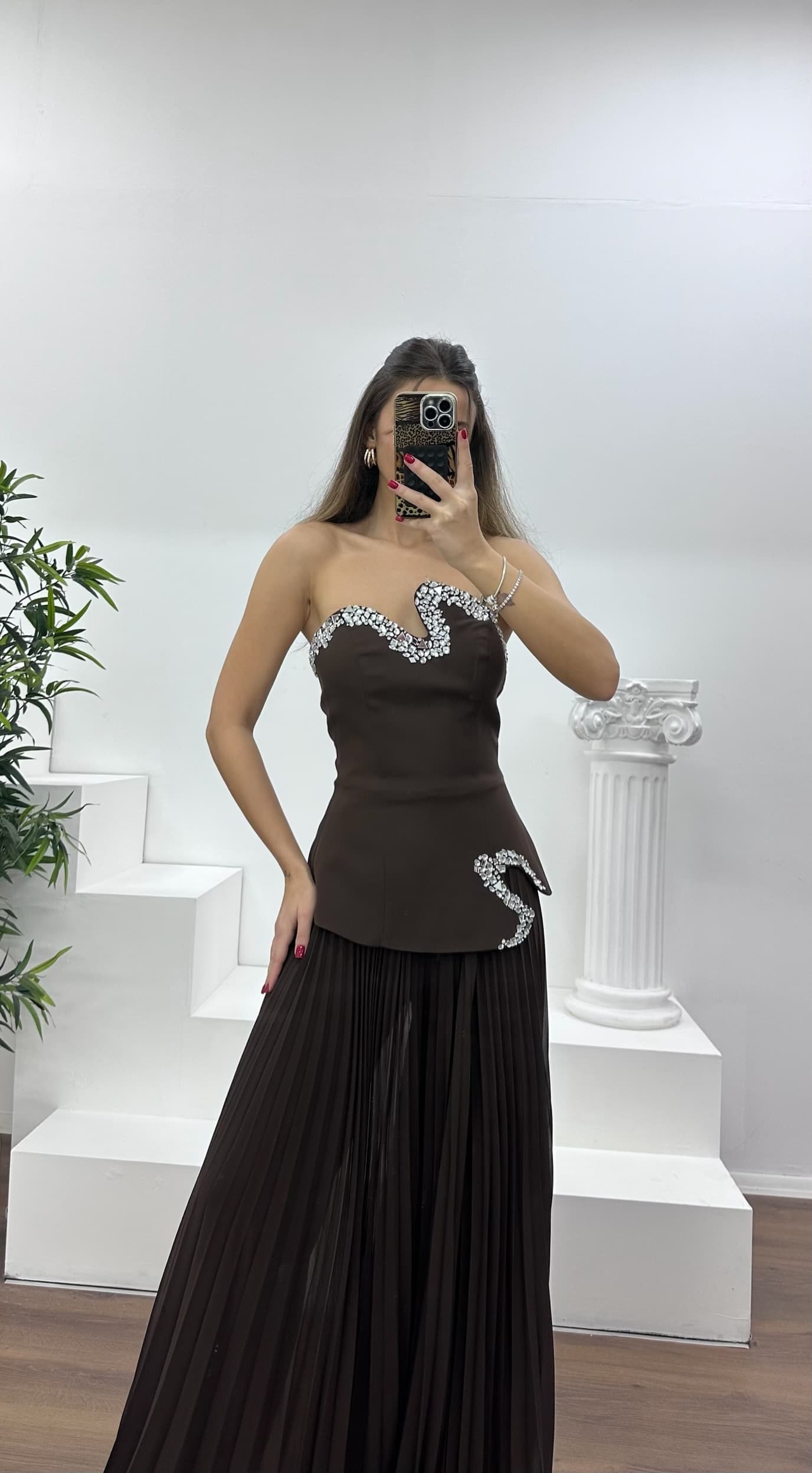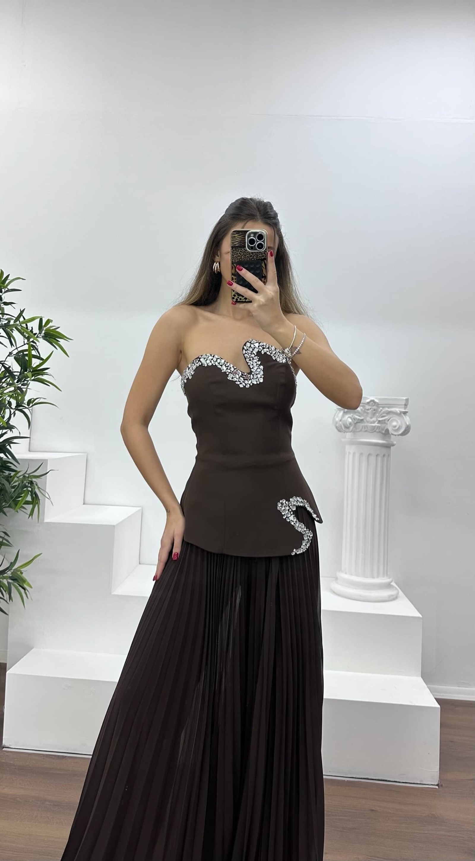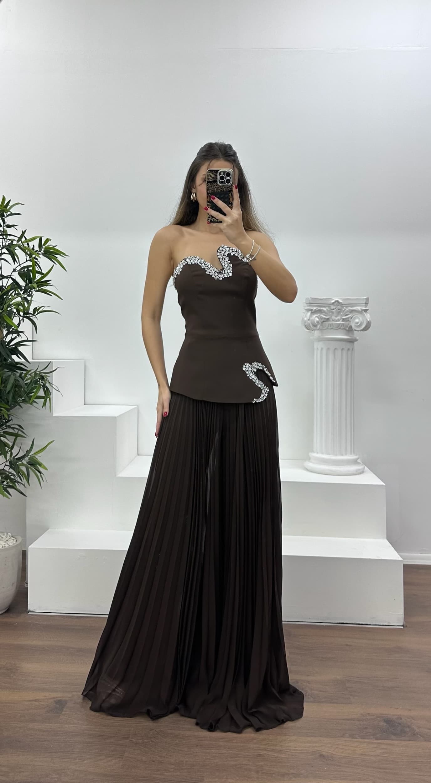 • Kahverengi Straplez  Asimetrik Desen Taşlı Abiye Tulum