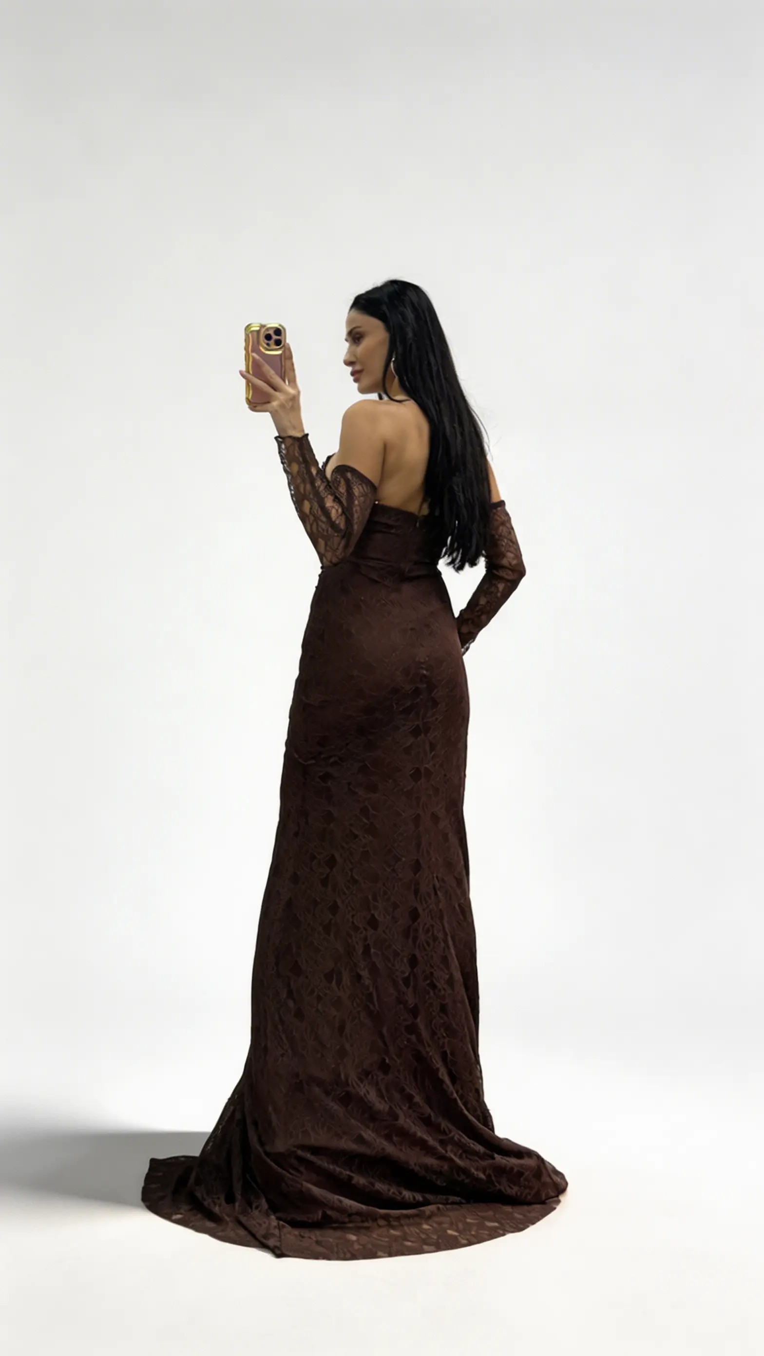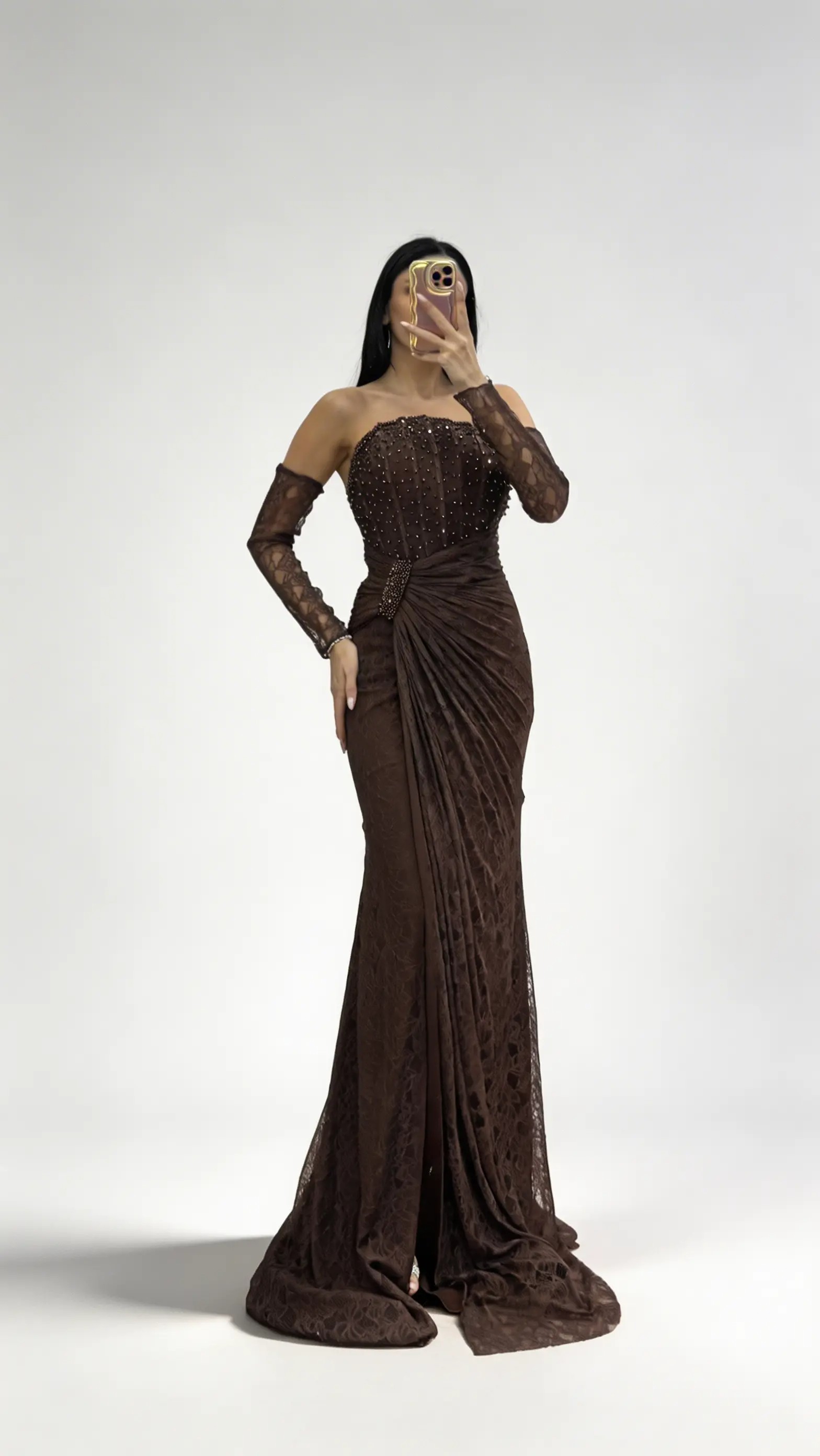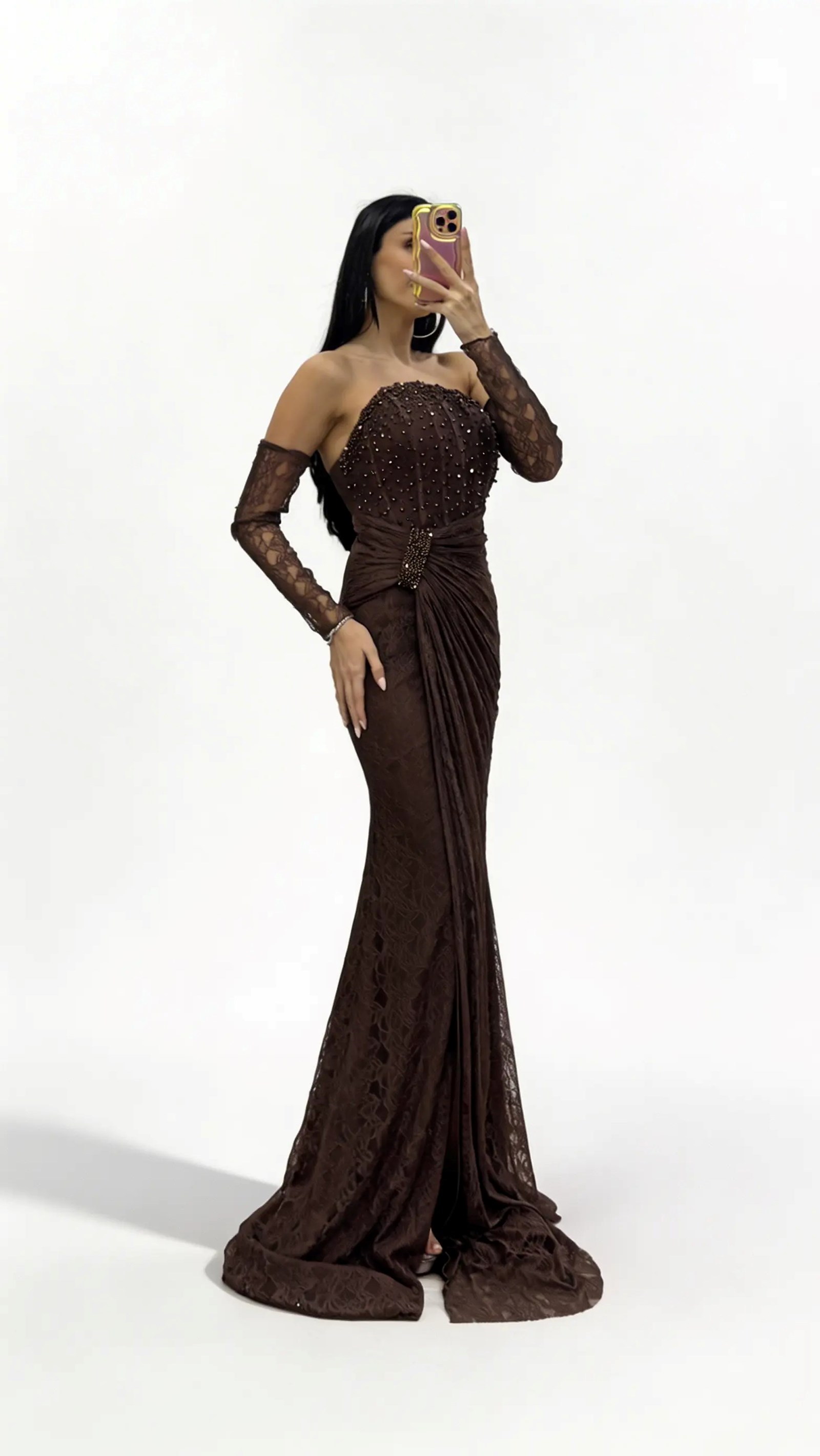 • Kahverengi Straplez Taş Tokalı Dantel Abiye Elbise