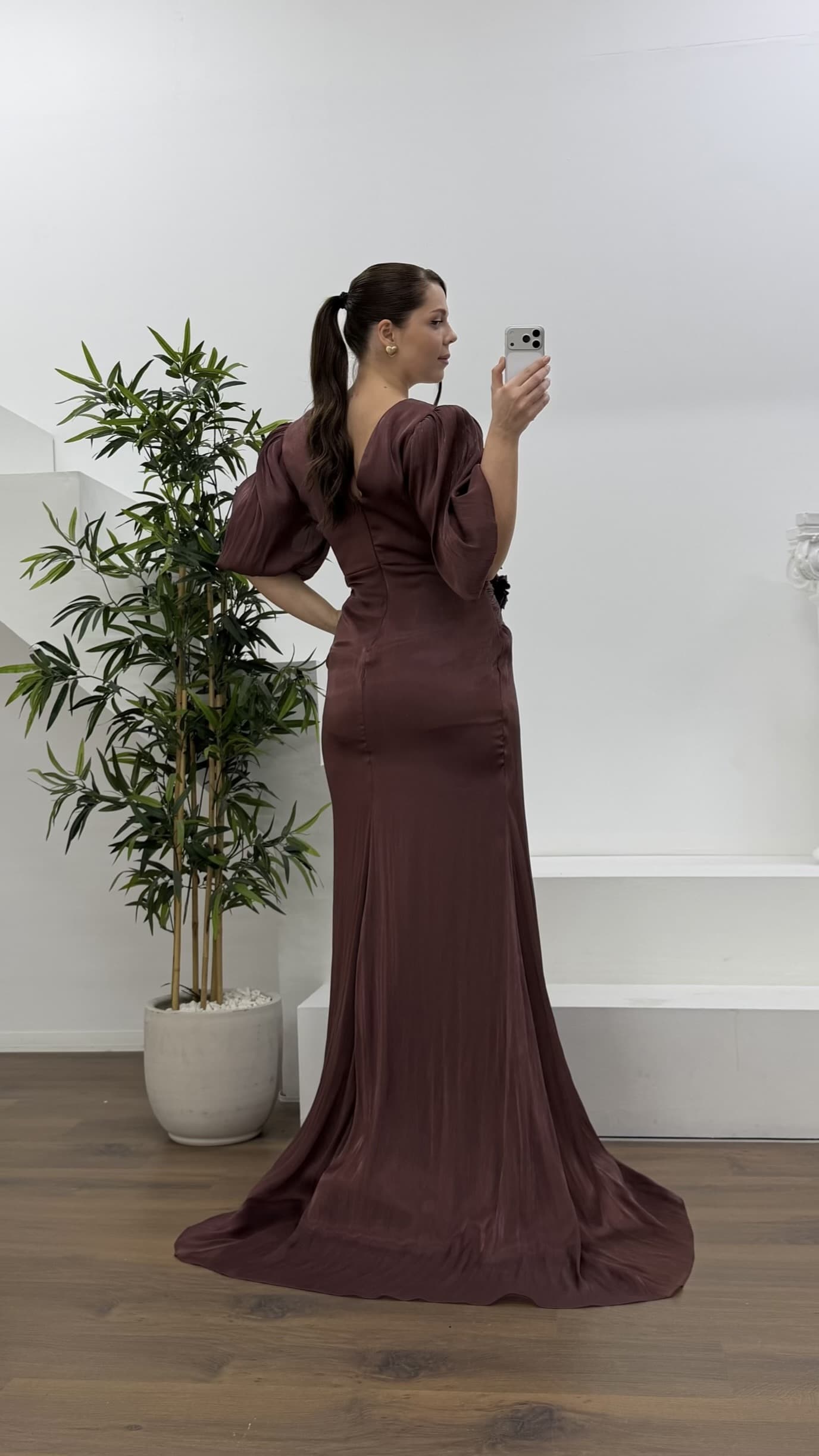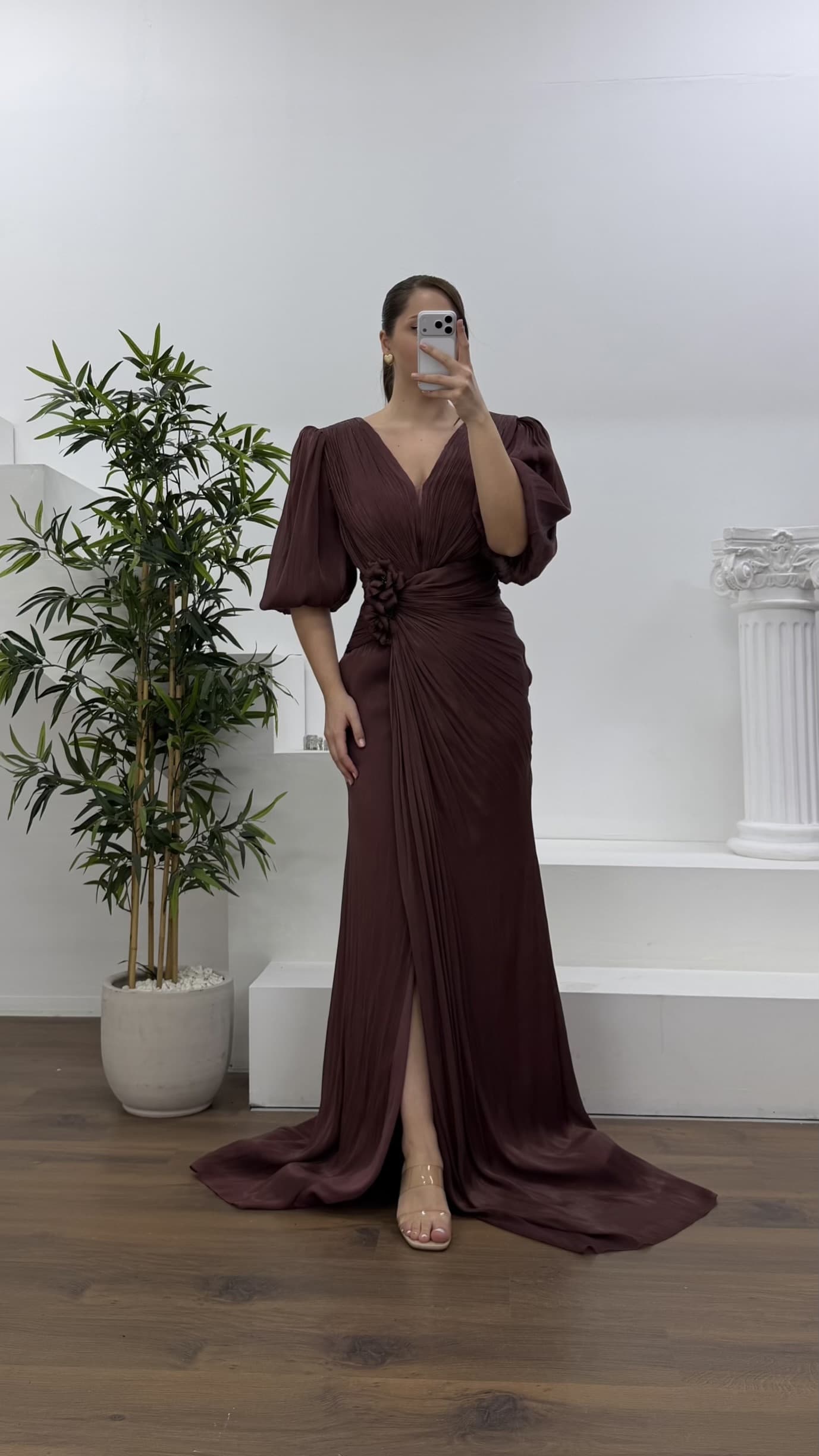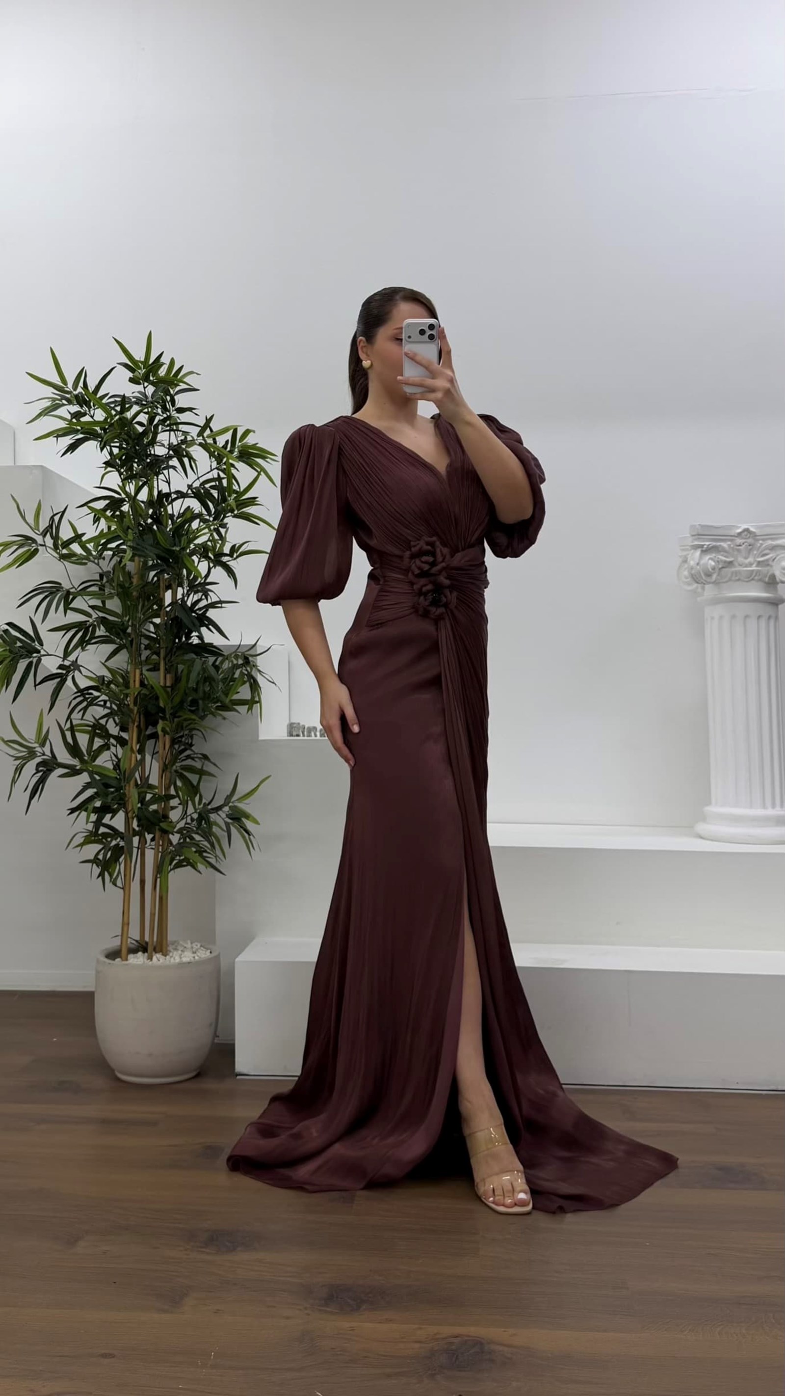 • Kahverengi V Yaka Şifon Büyük Beden Abiye Elbise