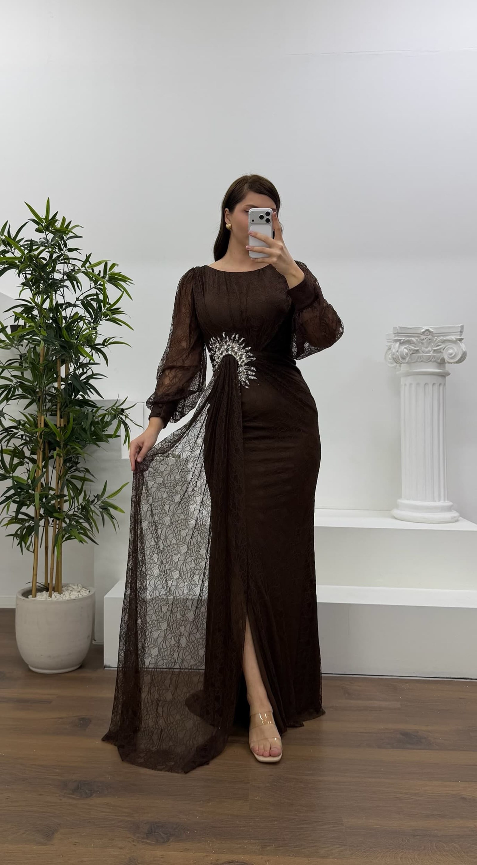 Ürün 44-50 bedene kadar uyumludur. göğüs pedli, astarlı, arka kapama fermuar, yırtmaçlı, kolları düğmeli abiye olarak tasarlanmıştır.