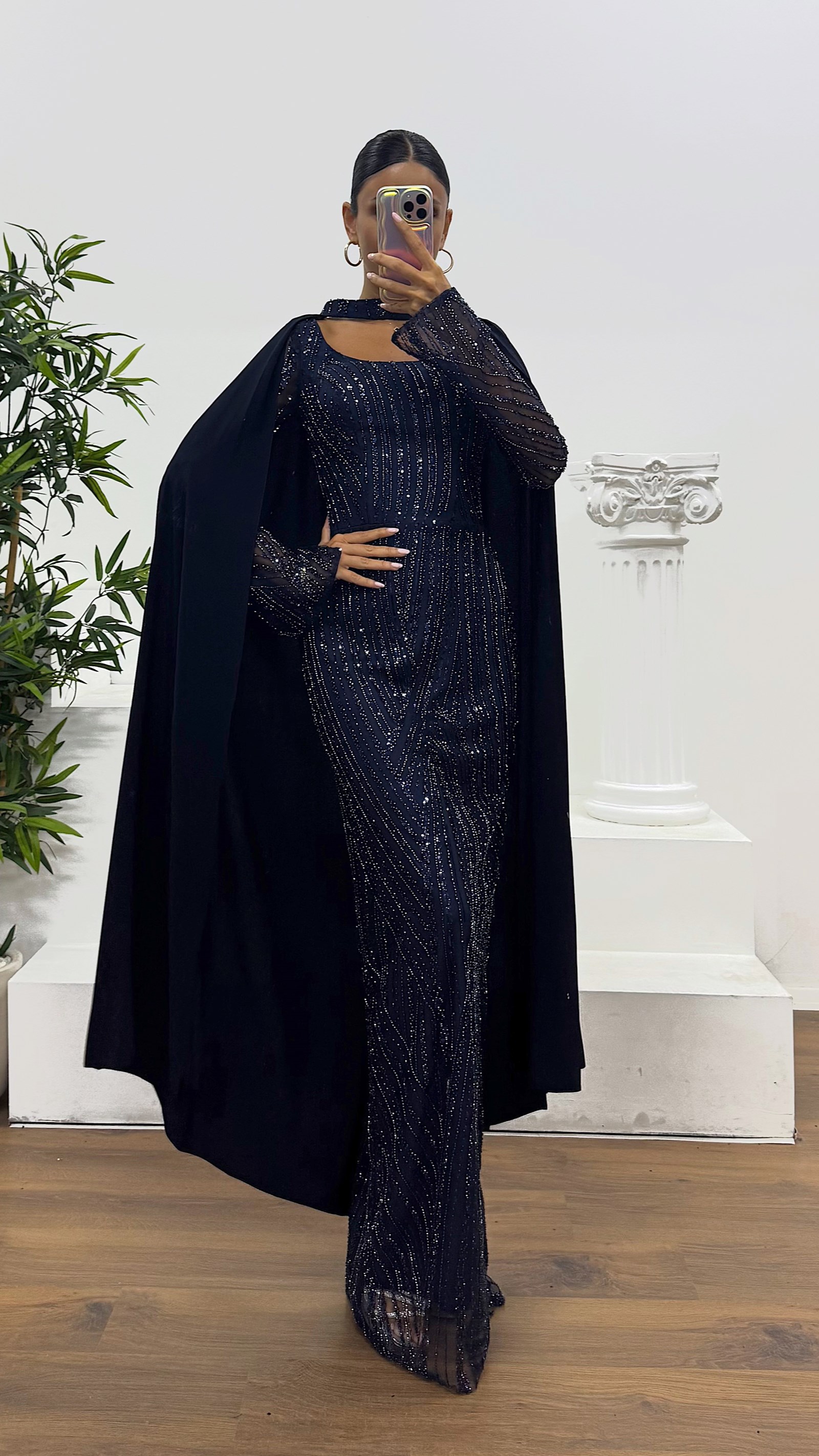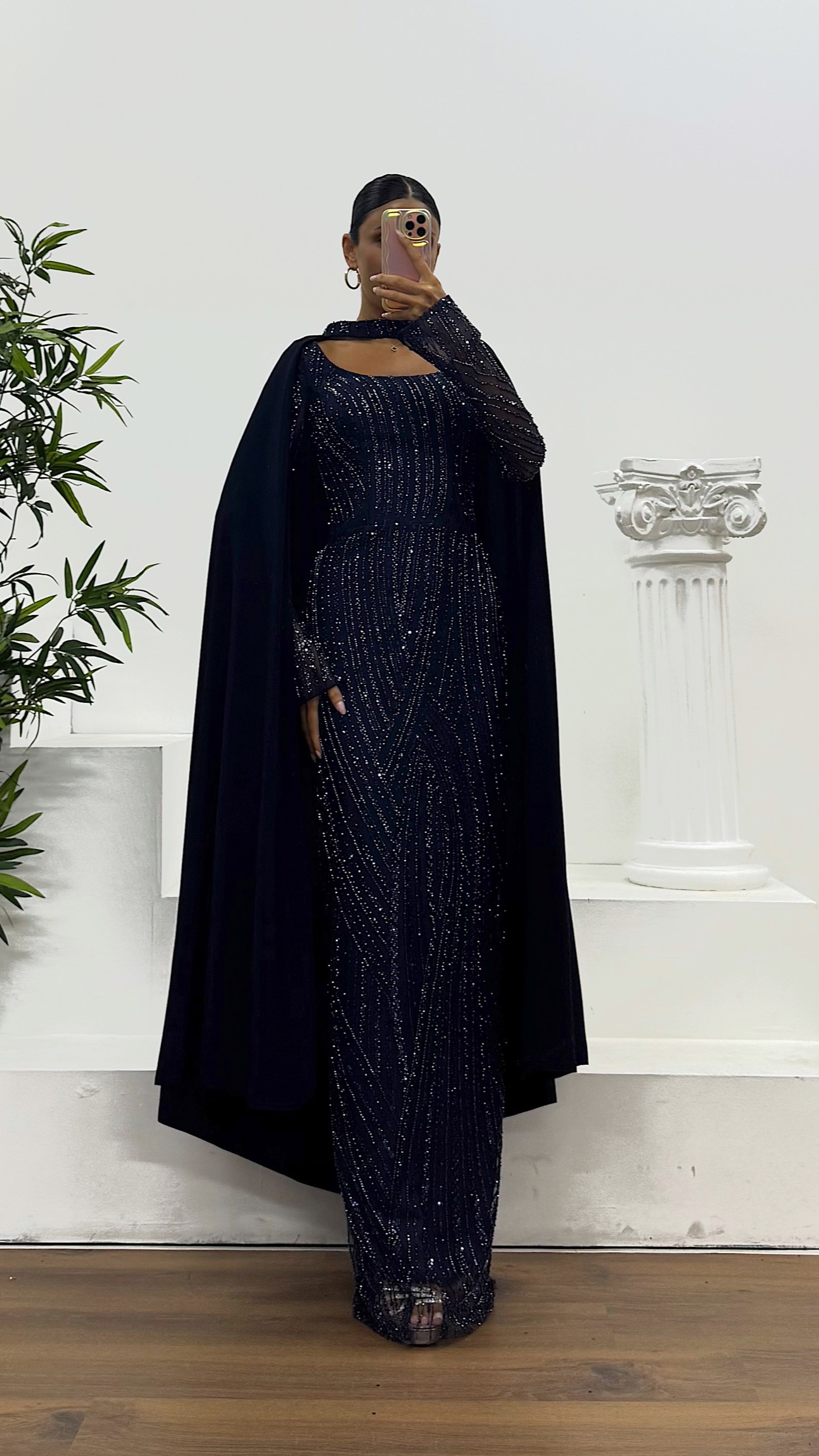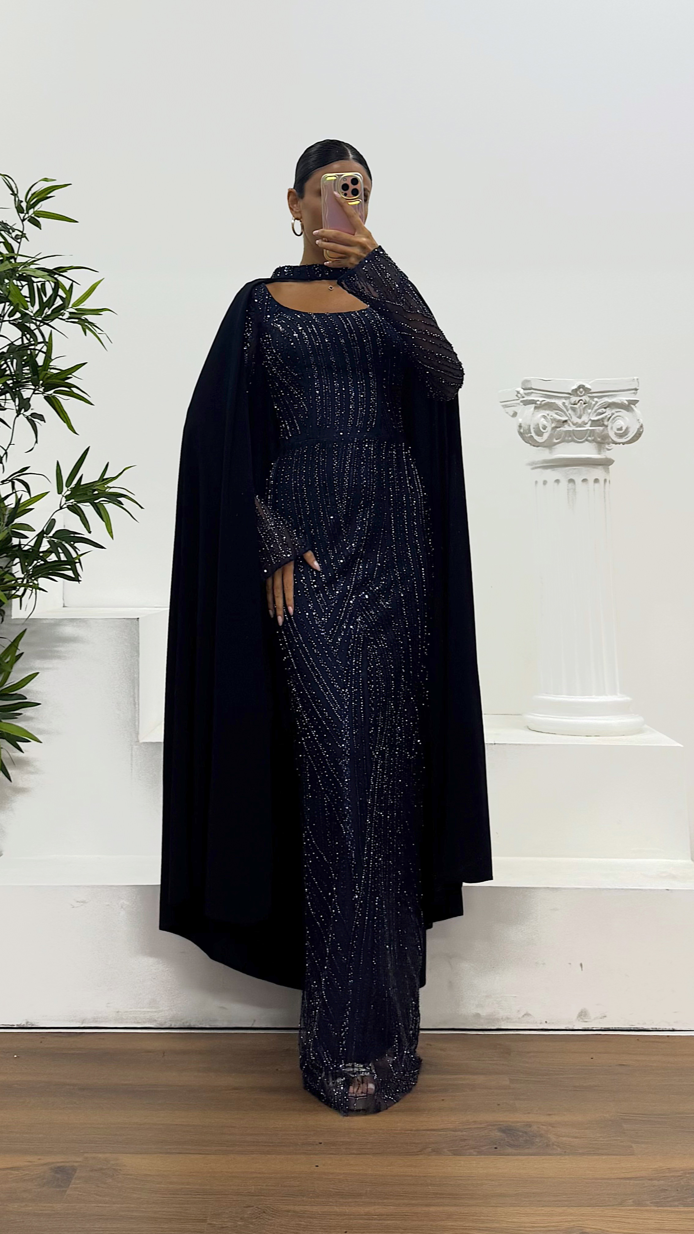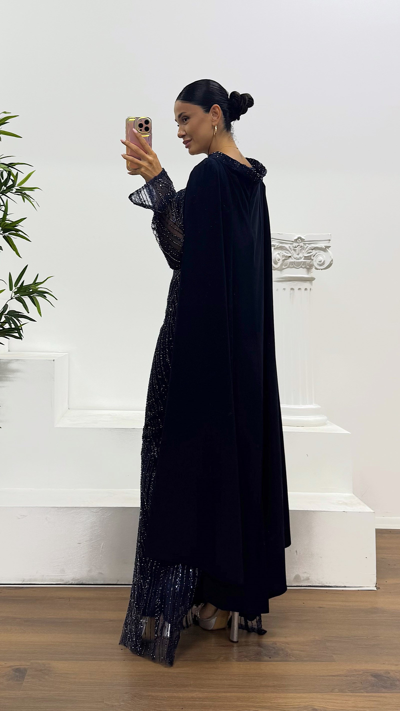 • Siyah Pelerinli İşlemeli Abiye Elbise