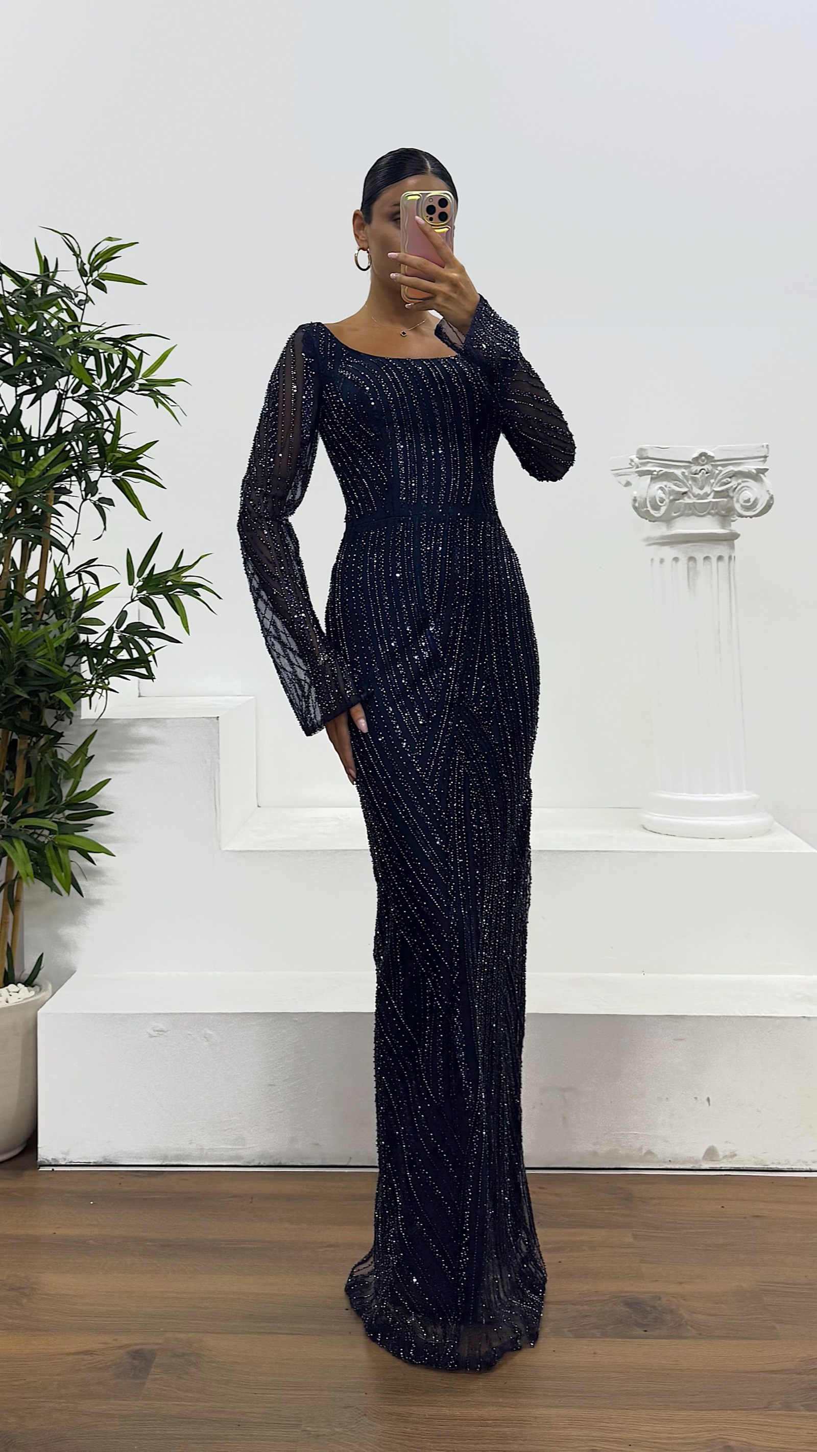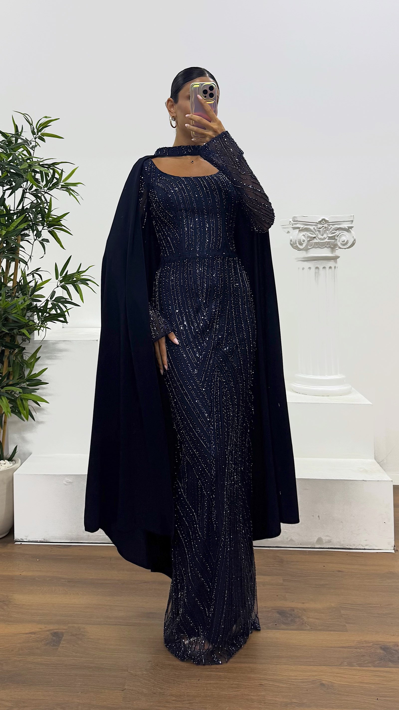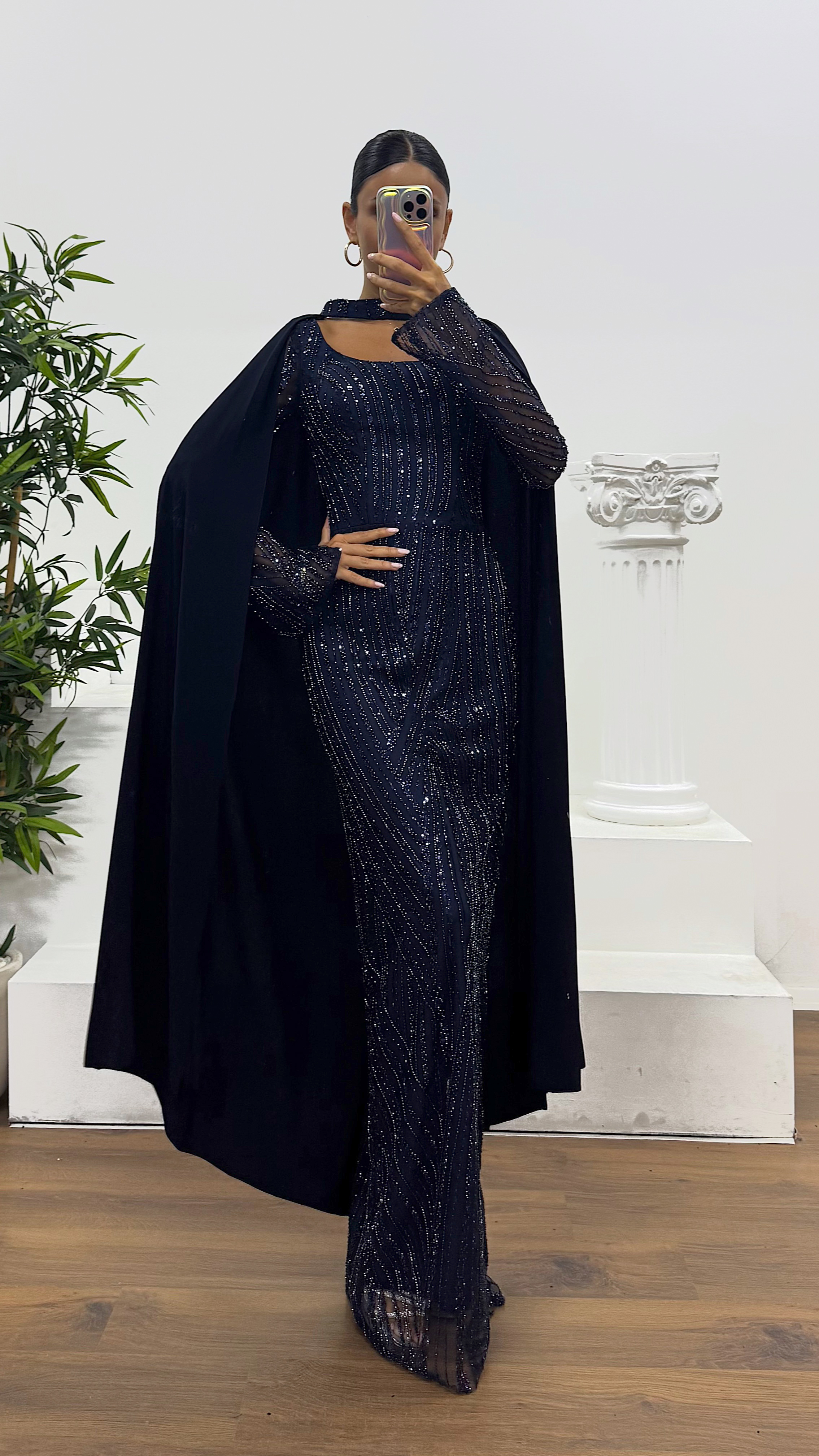 • İndigo Pelerinli İşlemeli Abiye Elbise