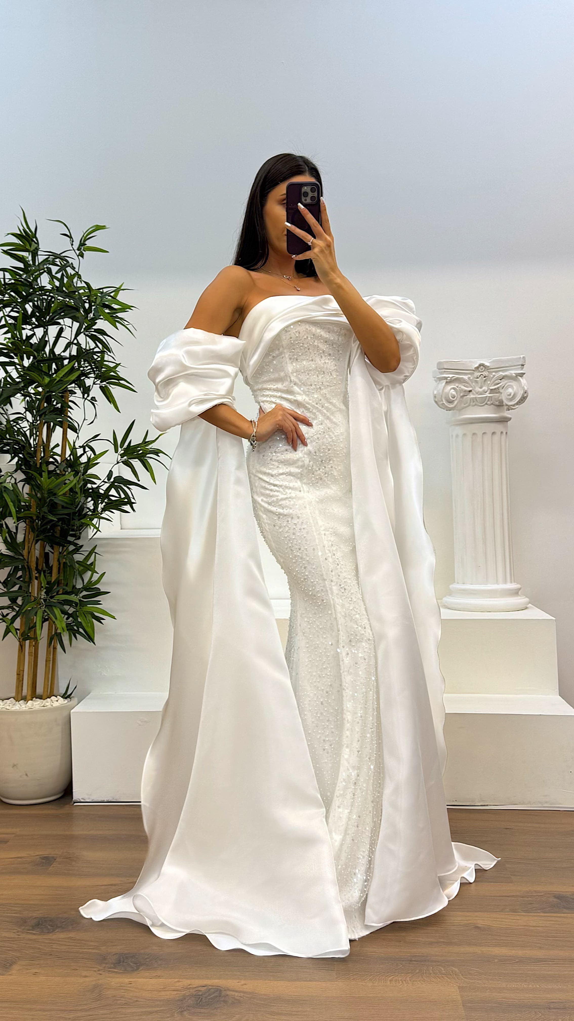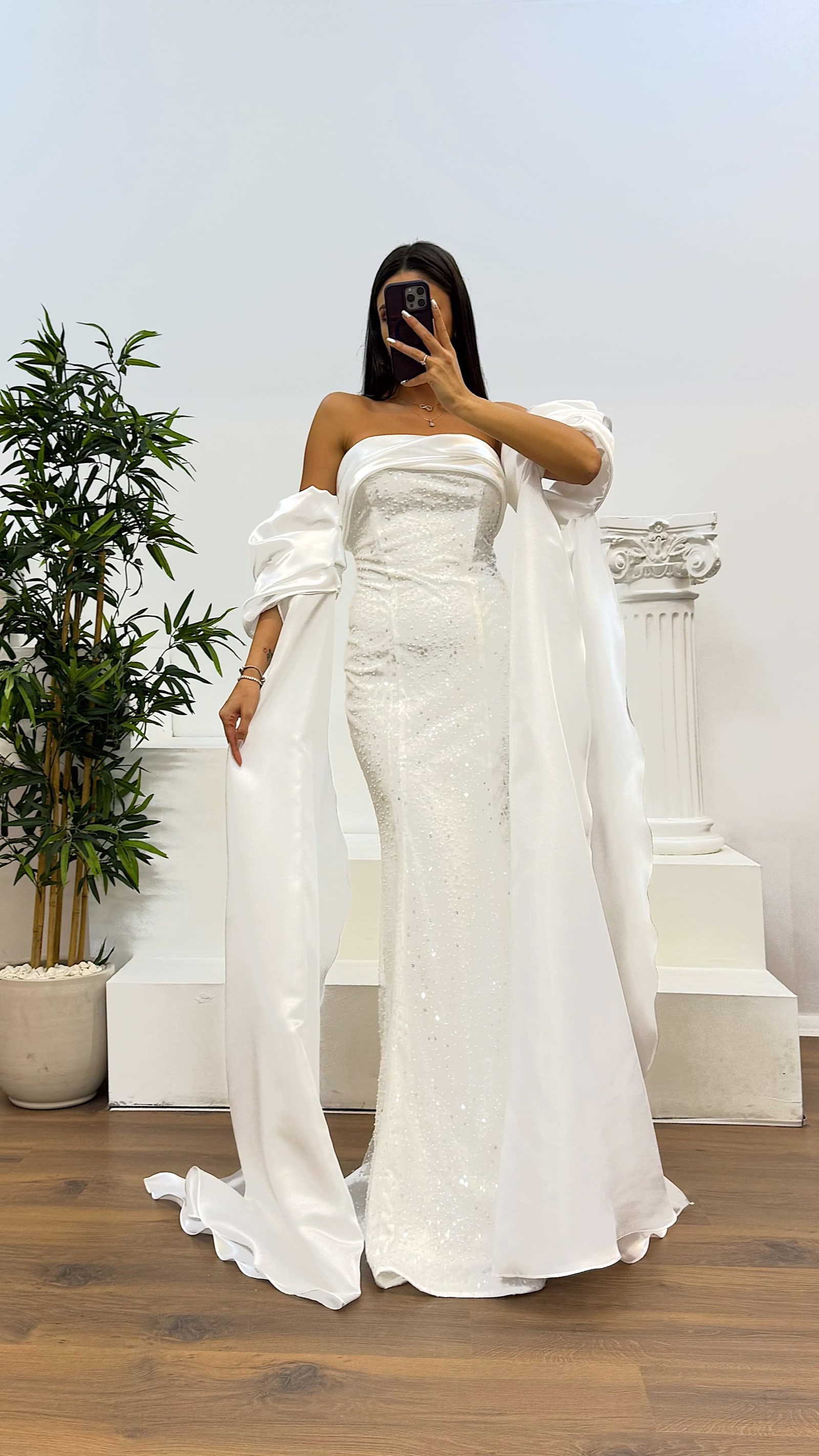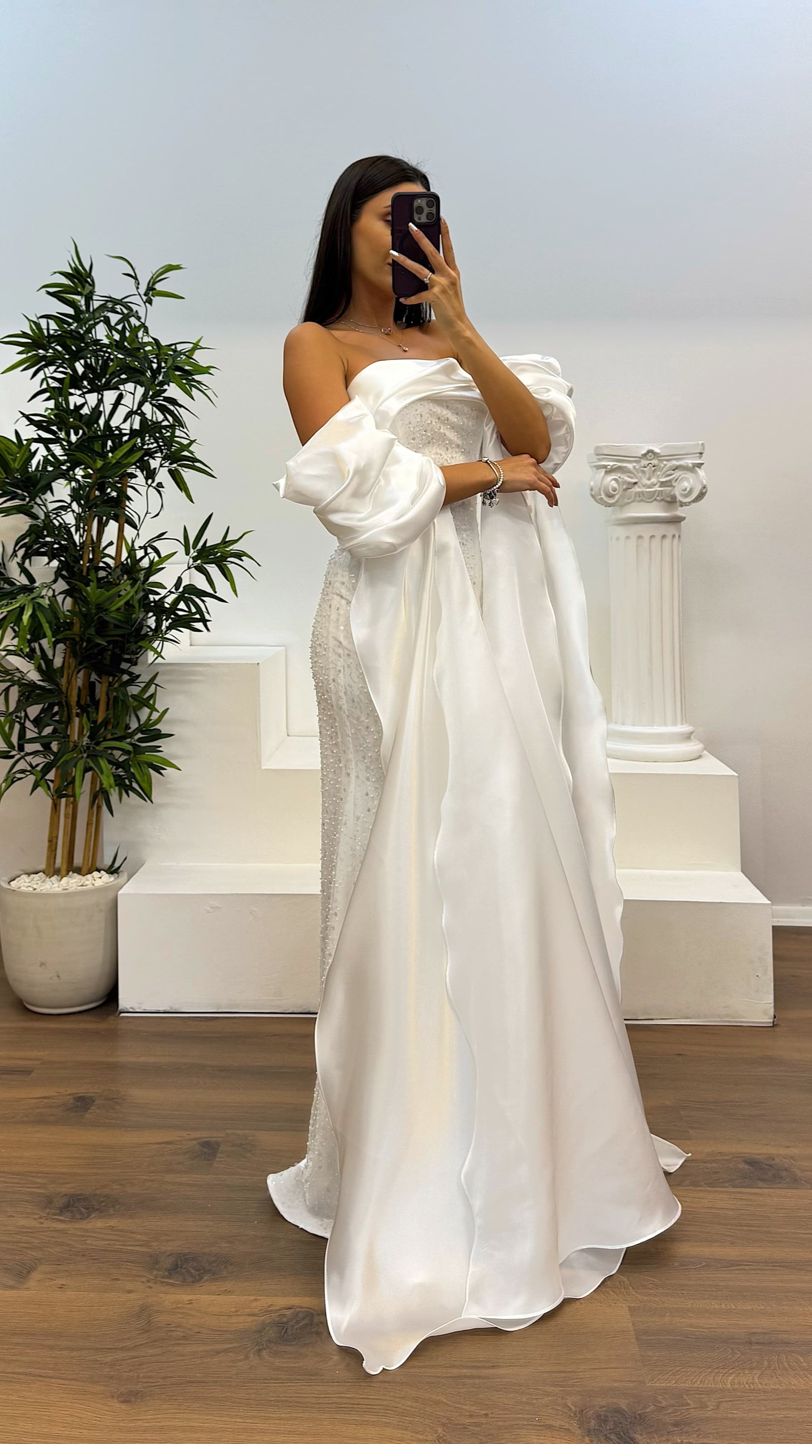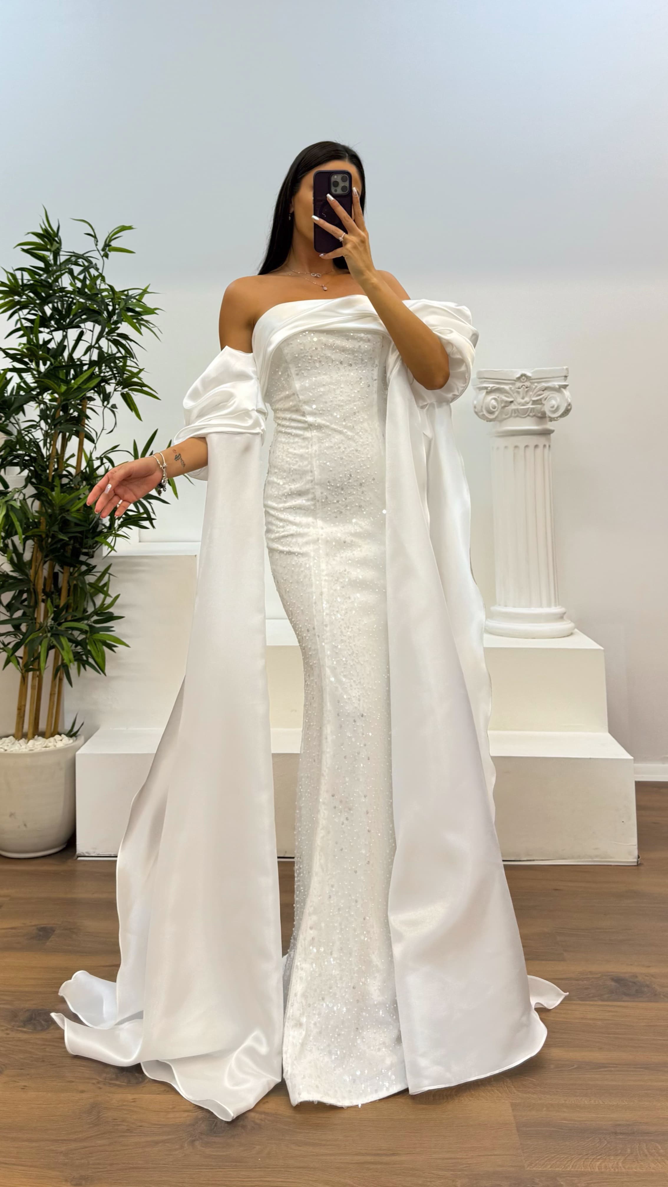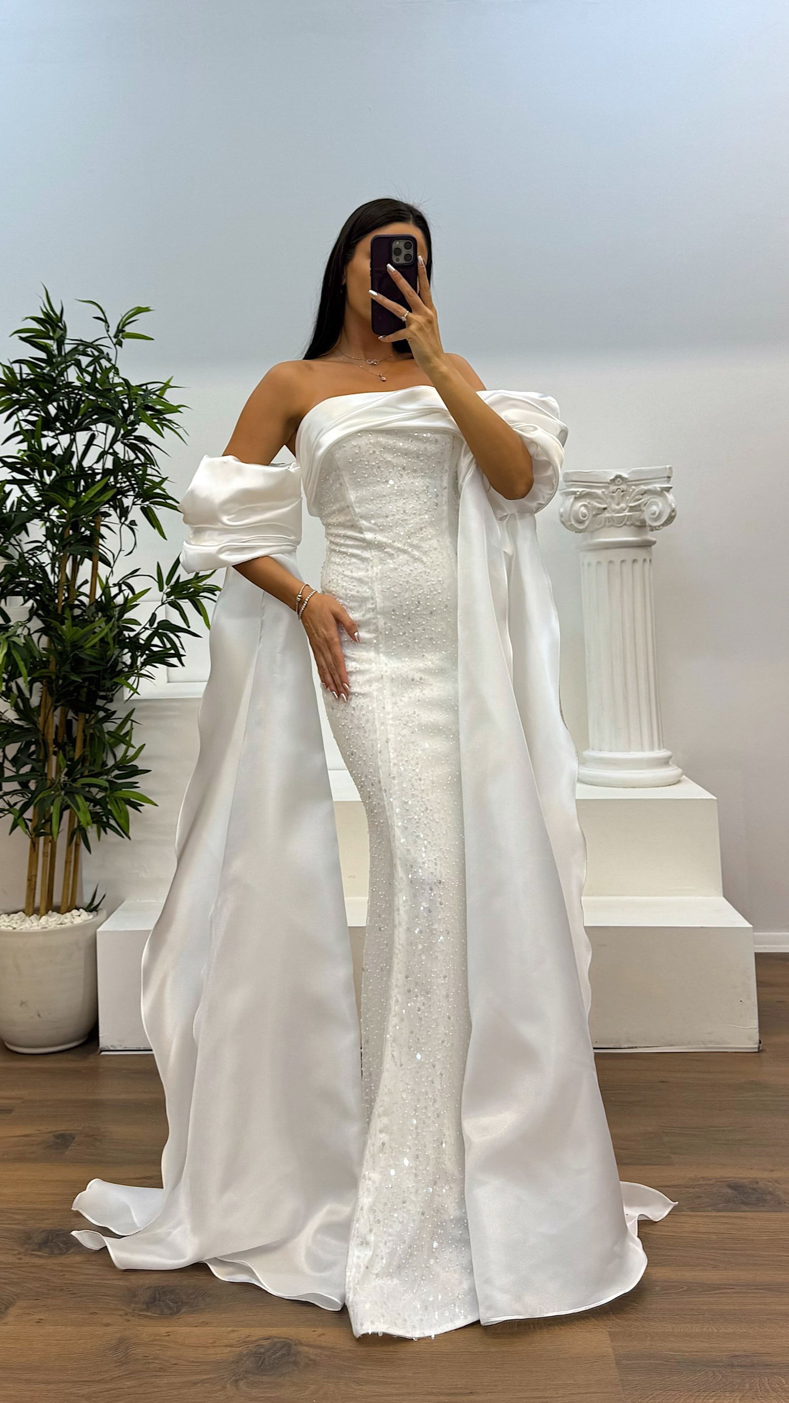 Ürün 36-42 bedene kadar uyumlu, göğüs pedli, astarlı, arka kapama fermuar, balon kol, işlemeli abiye olarak tasarlanmıştır.