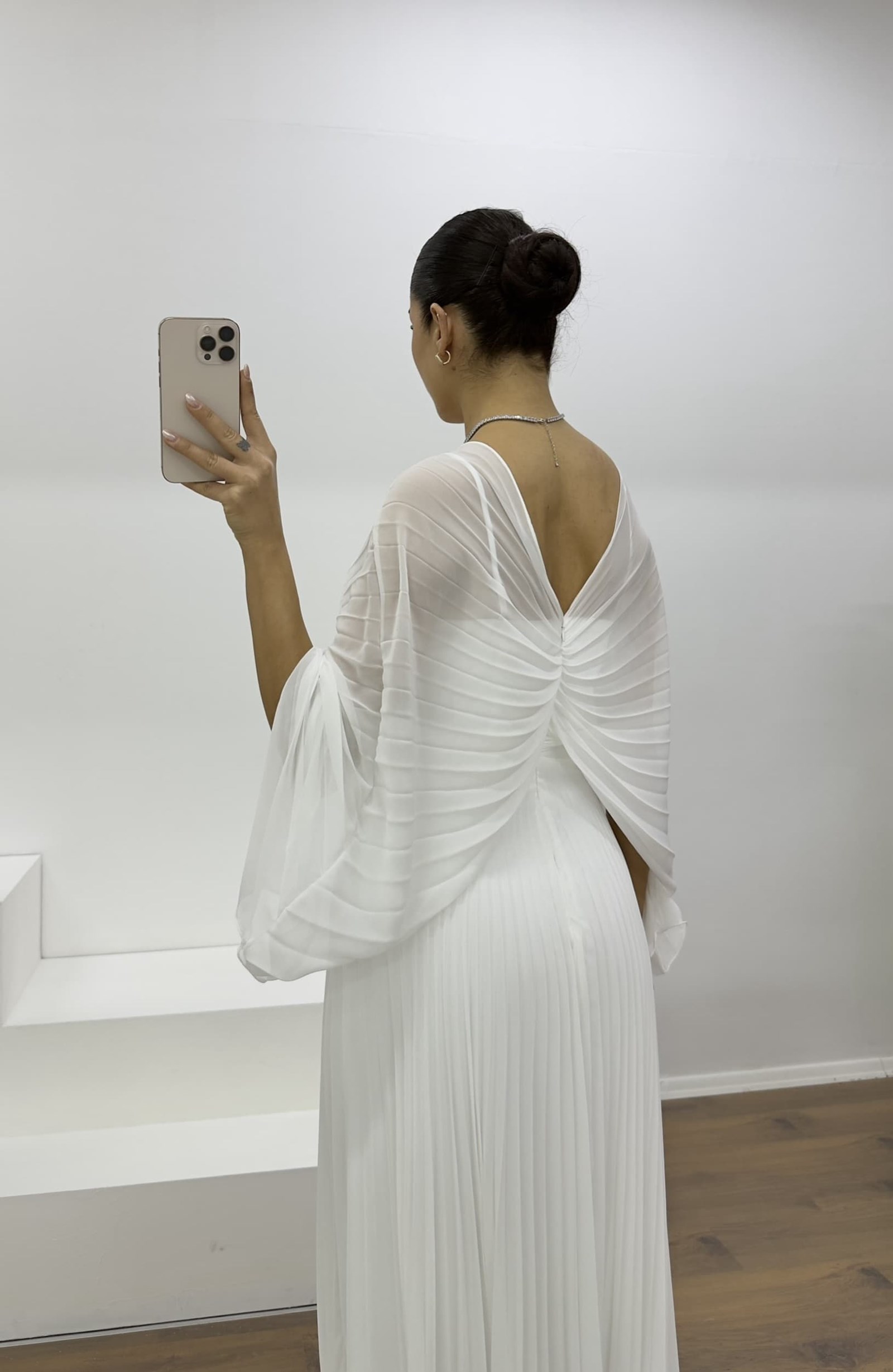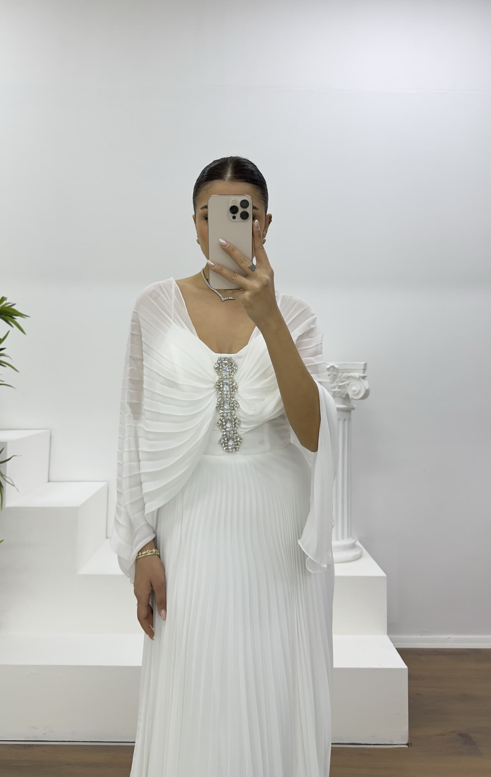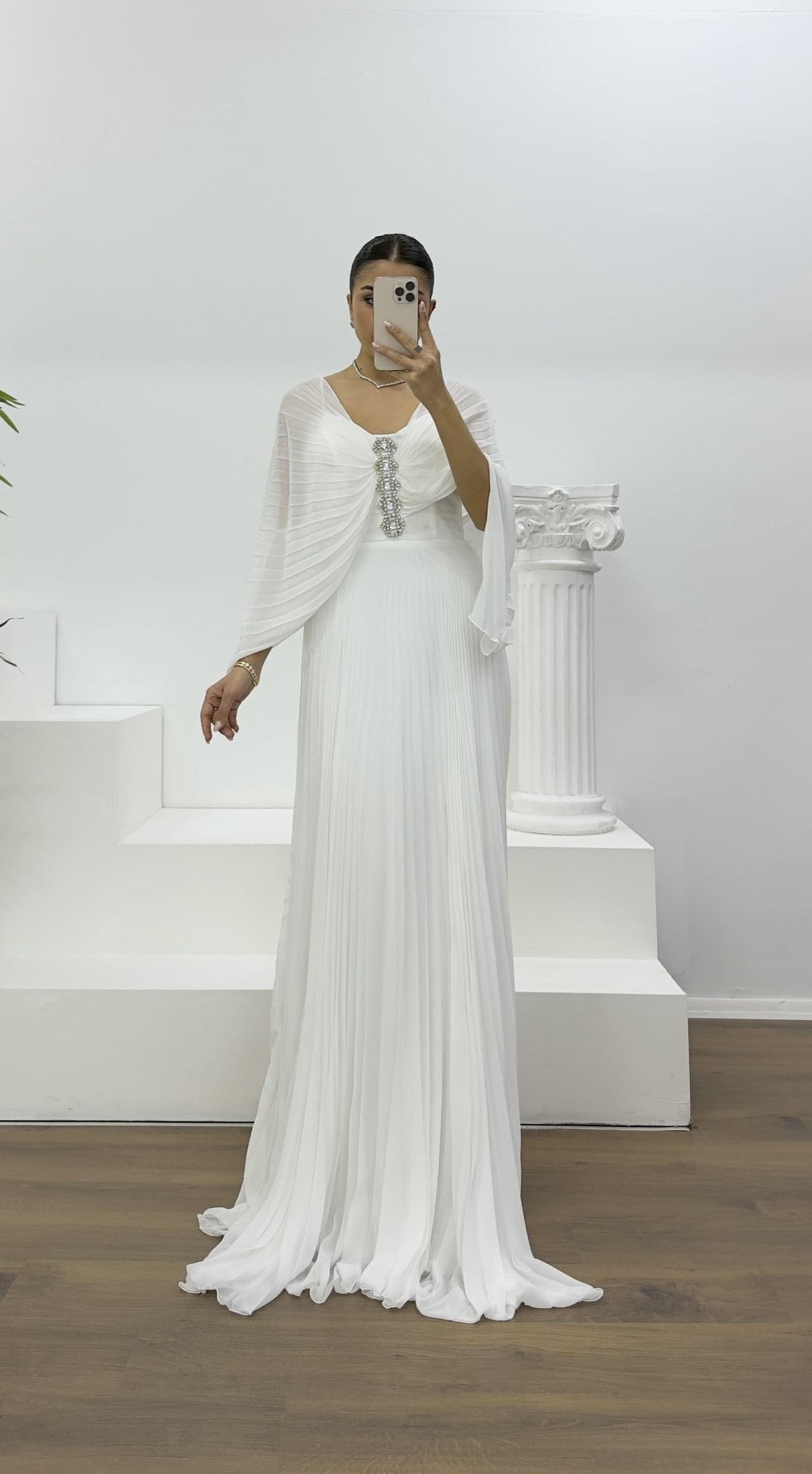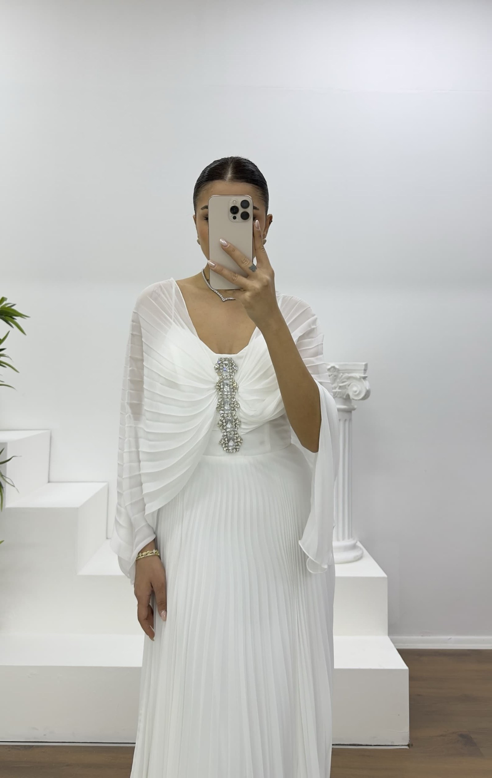• Kemik Broş Detaylı Melek Kanadı Şifon Abiye Elbise