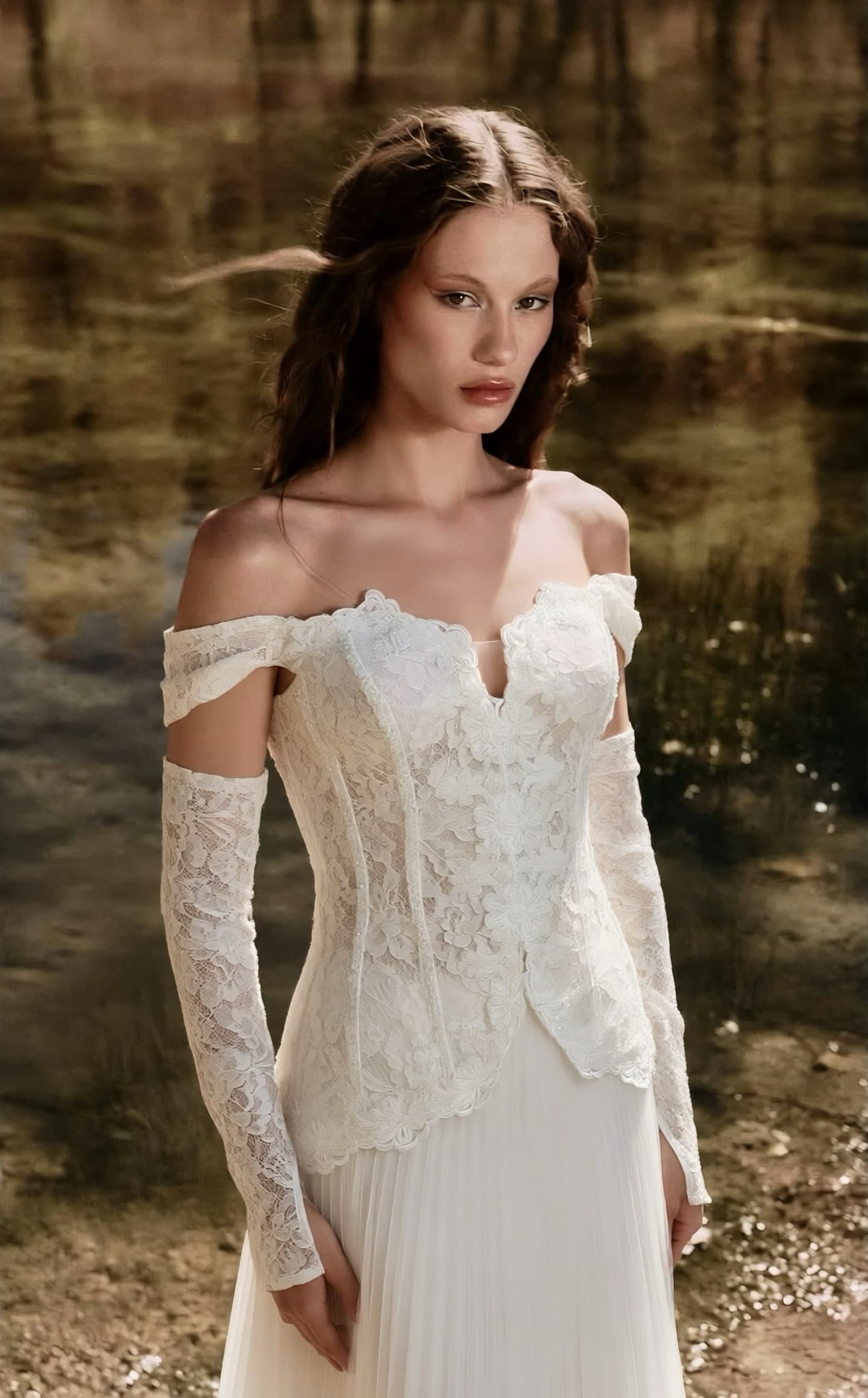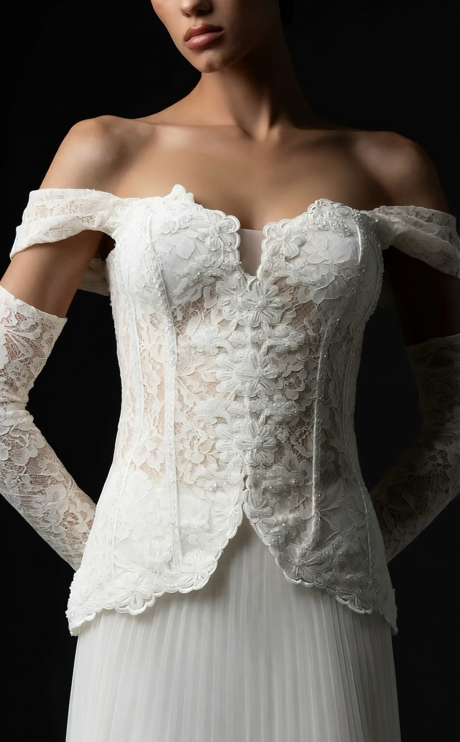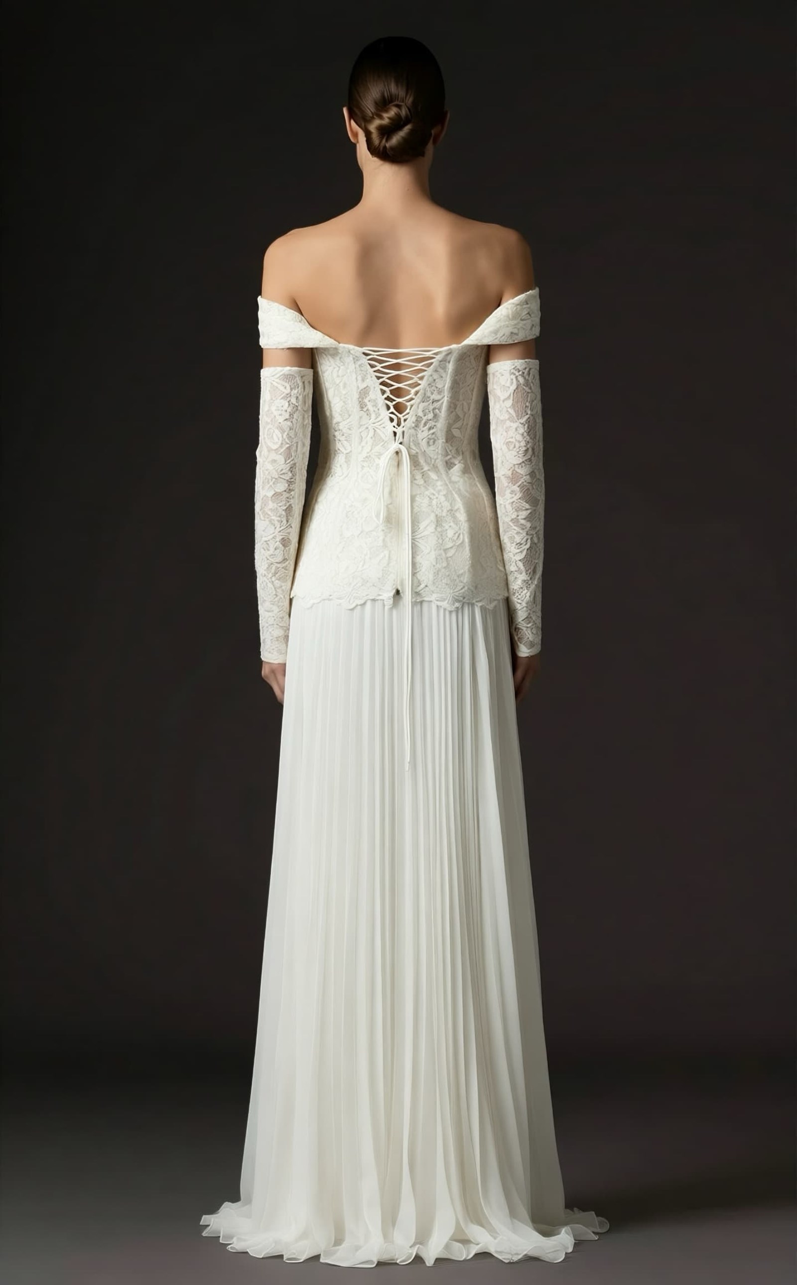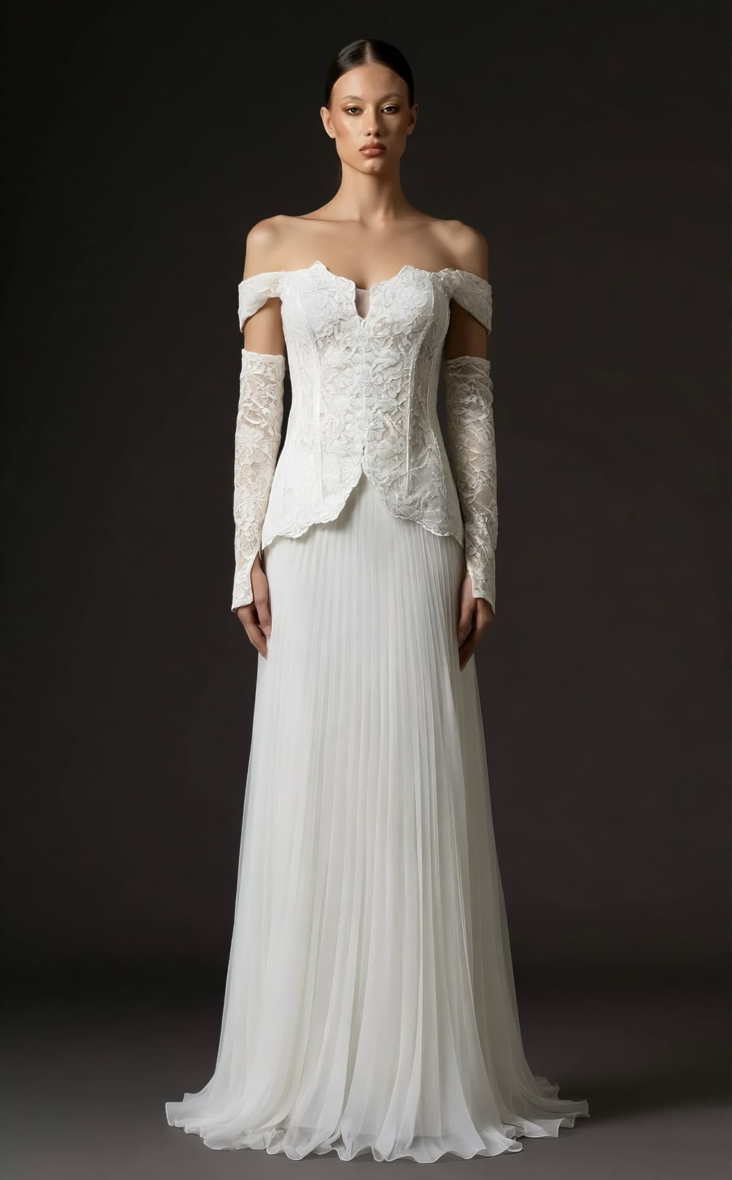• Kemik Düşük Omuzlu Pileli Abiye Elbise