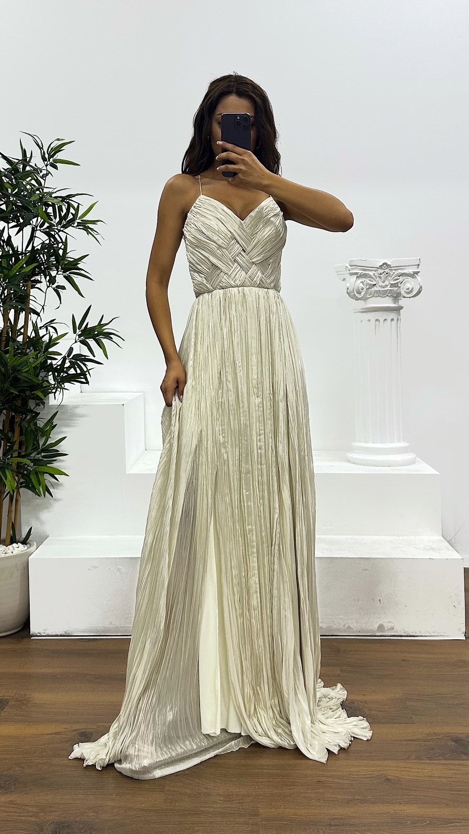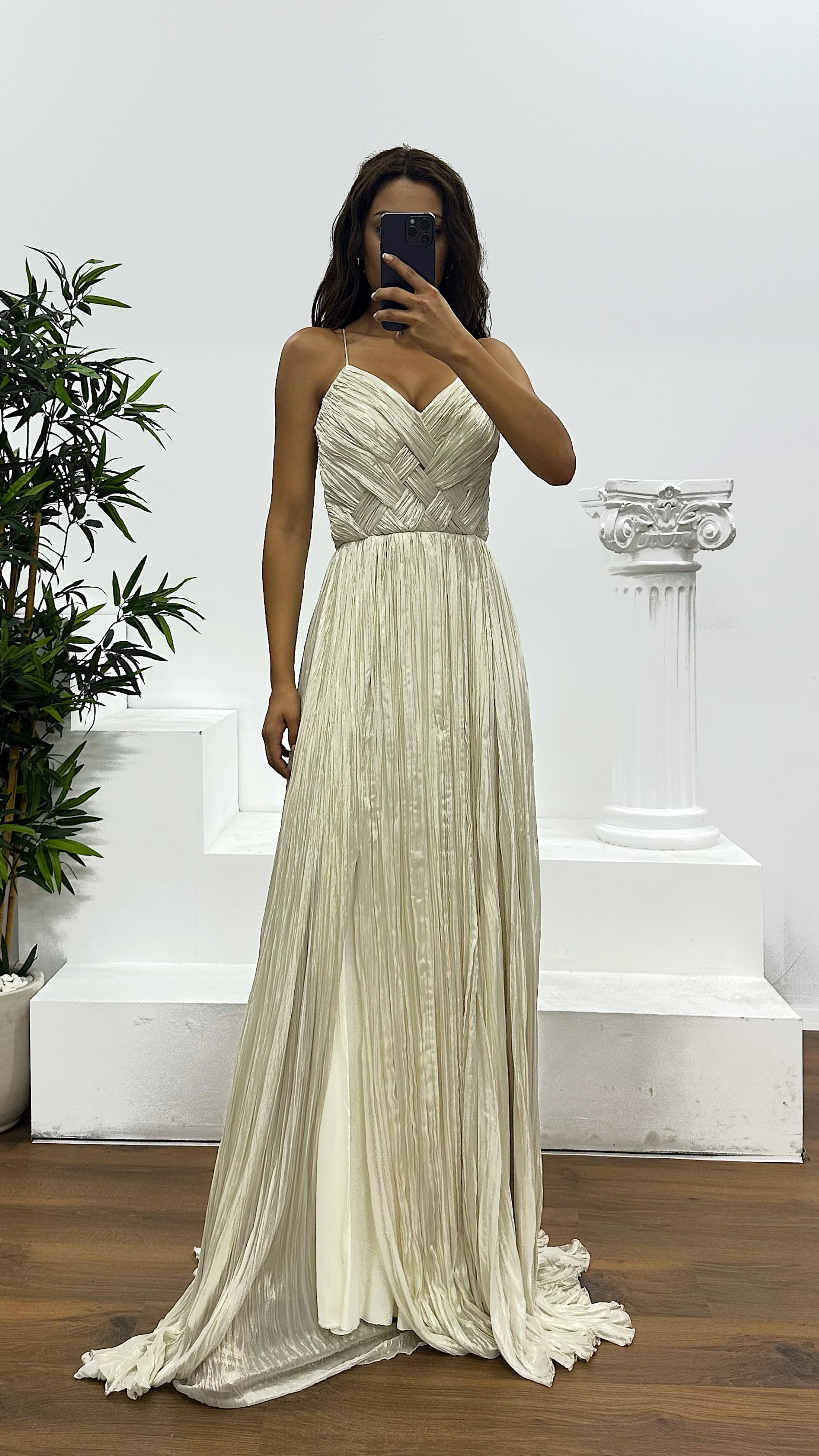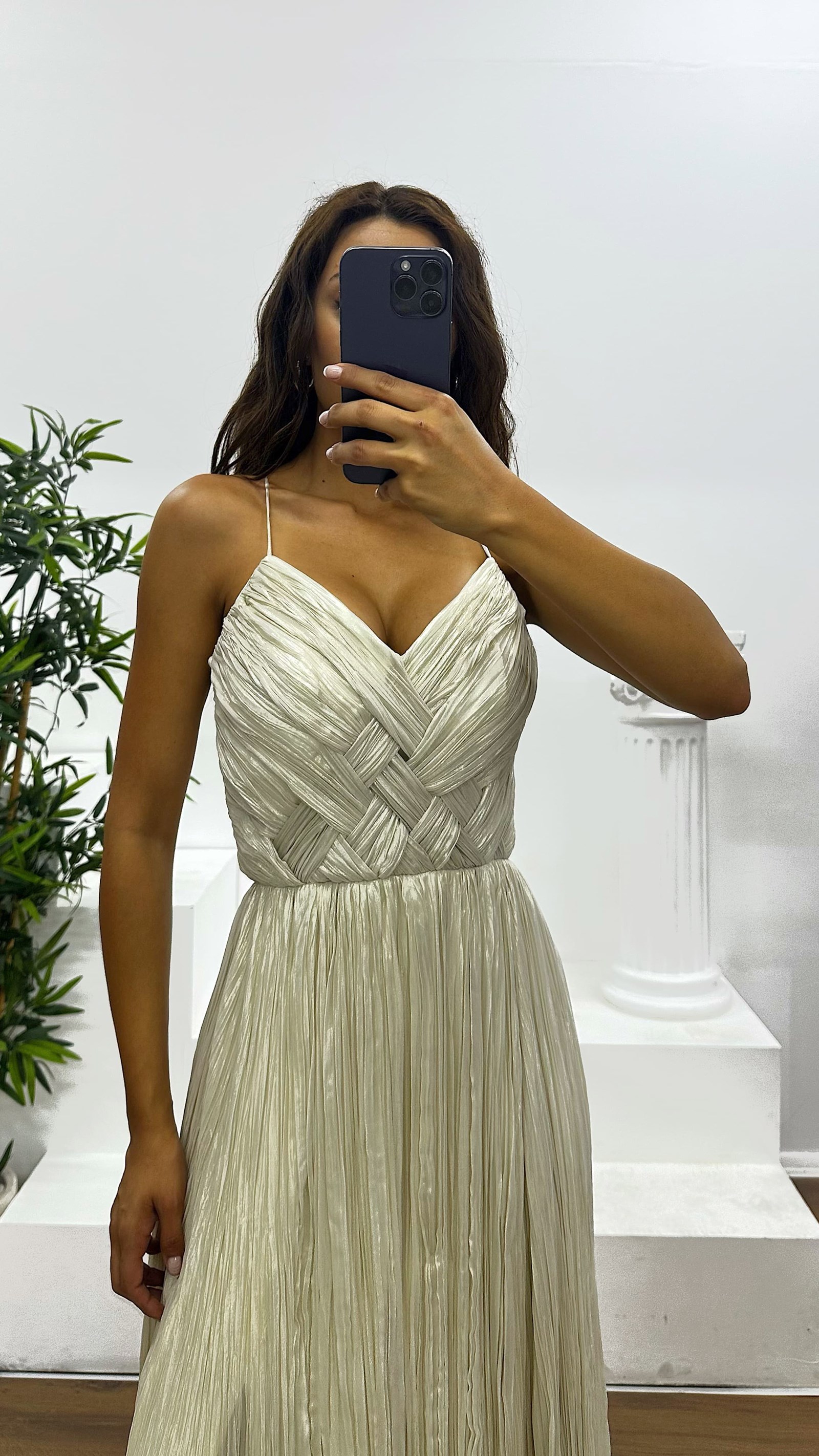 Kemik Gold İp Askılı Piliseli Abiye Elbise