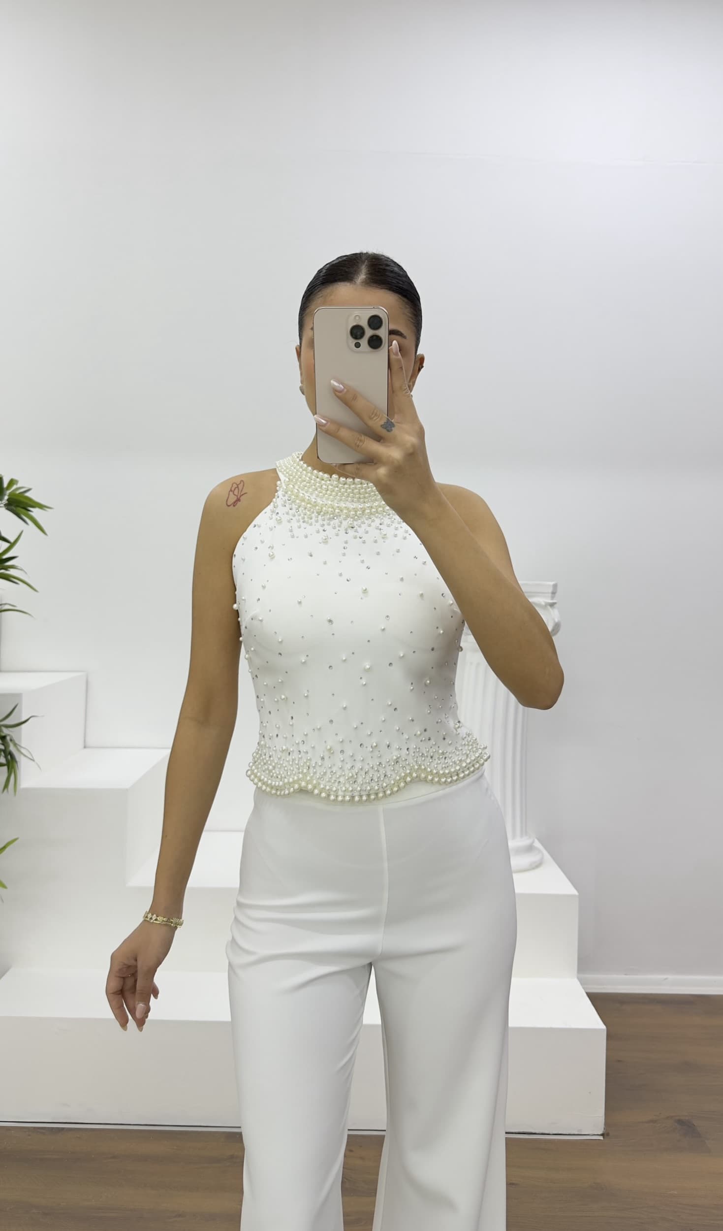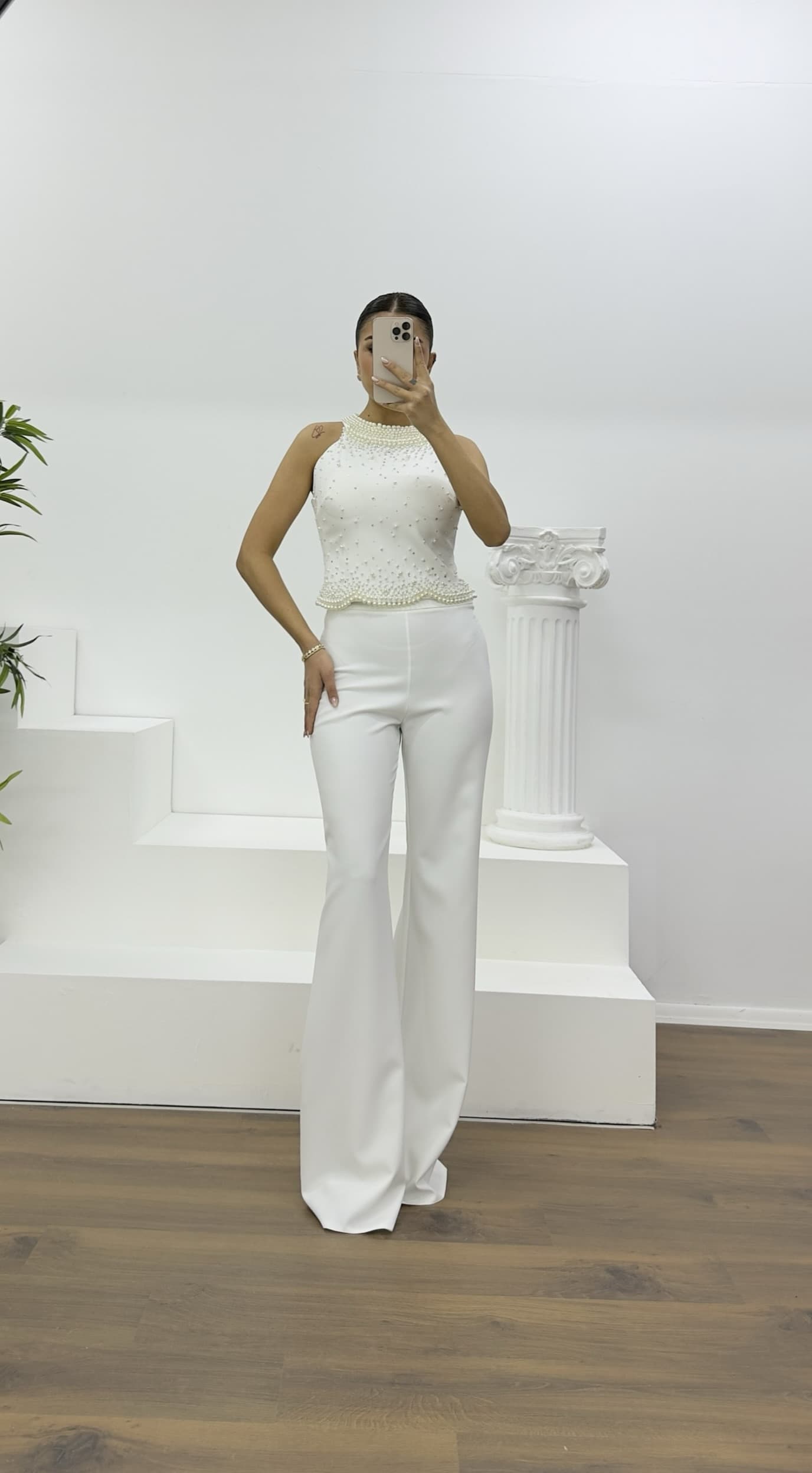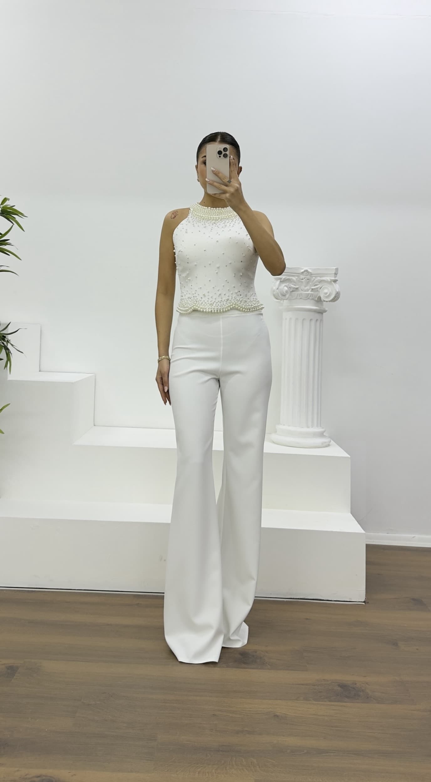 Ürün 36-42 bedene kadar uyumludur. göğüs pedli, astarlı, bluz halter yaka, düğmeli ve fermuarlı, pantolon yüksek bel , bol paça kesim, inci detaylı abiye olarak tasarlanmıştır.