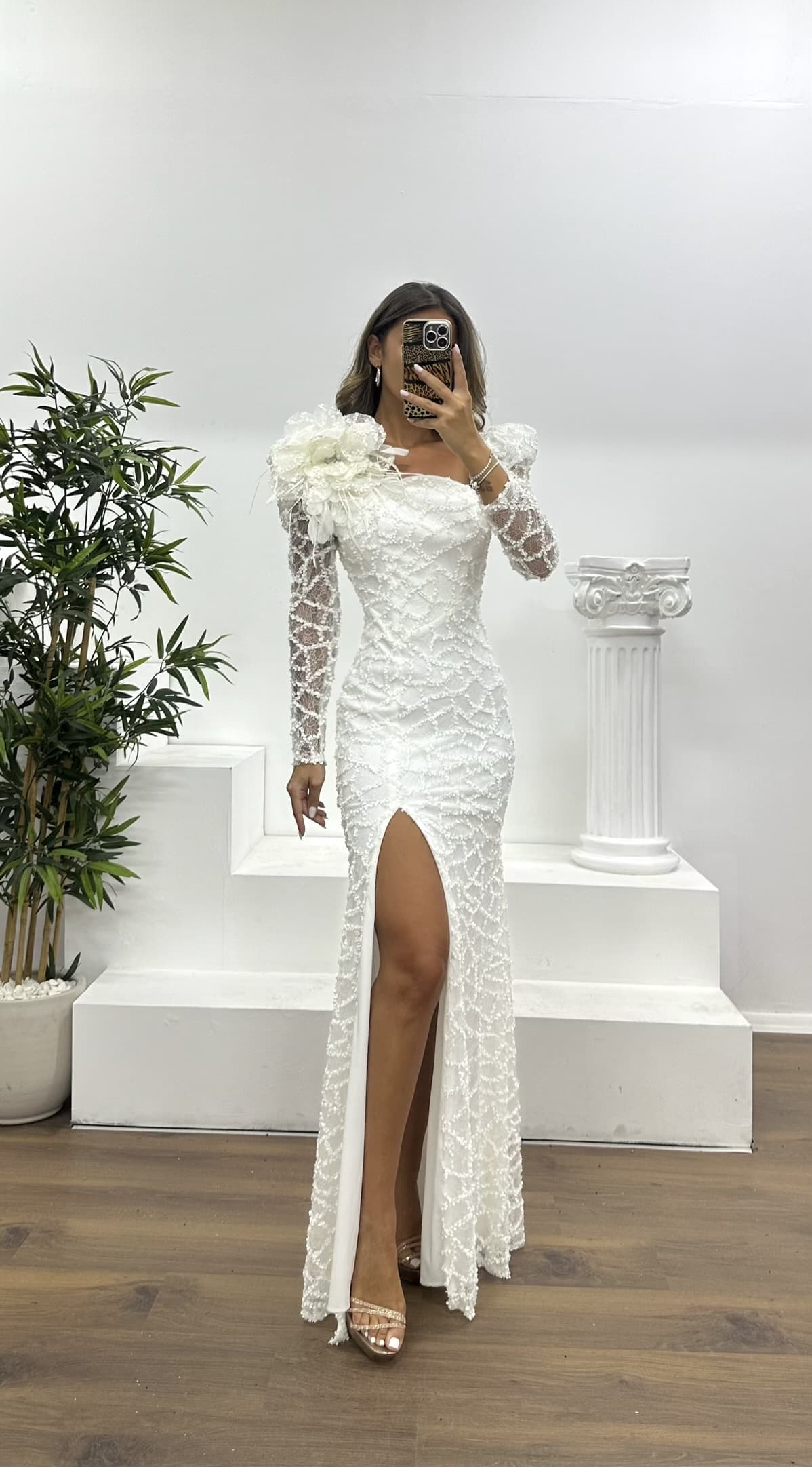 • Kemik Kare Yaka Pullu Abiye Elbise