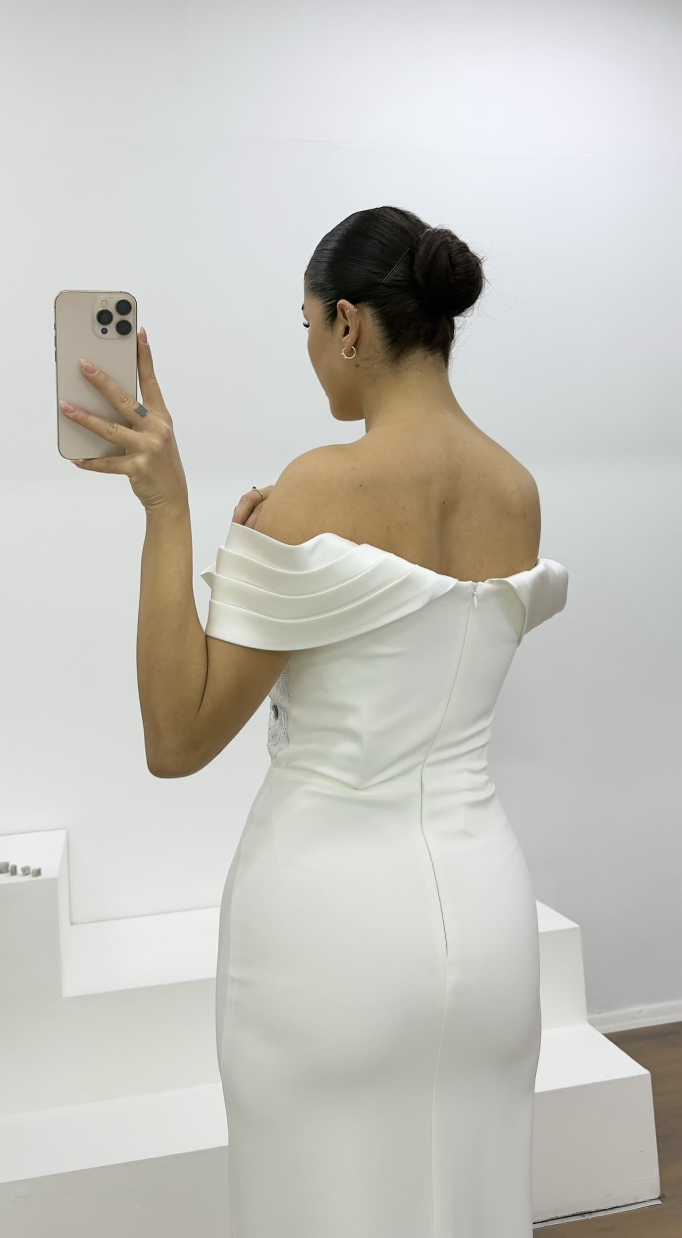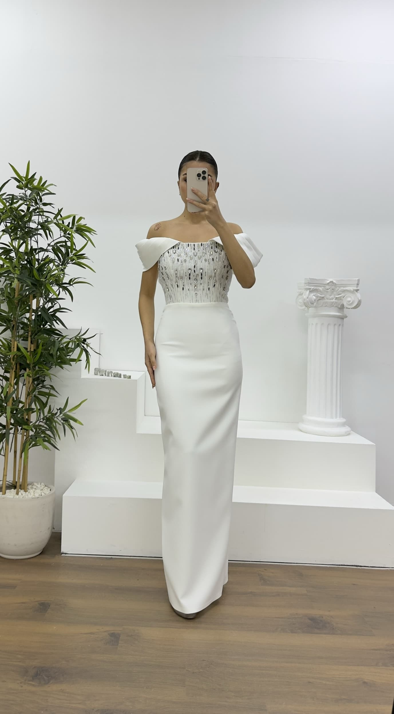 Kemik Kristal Işıltılı Omuz Detaylı Abiye Elbise