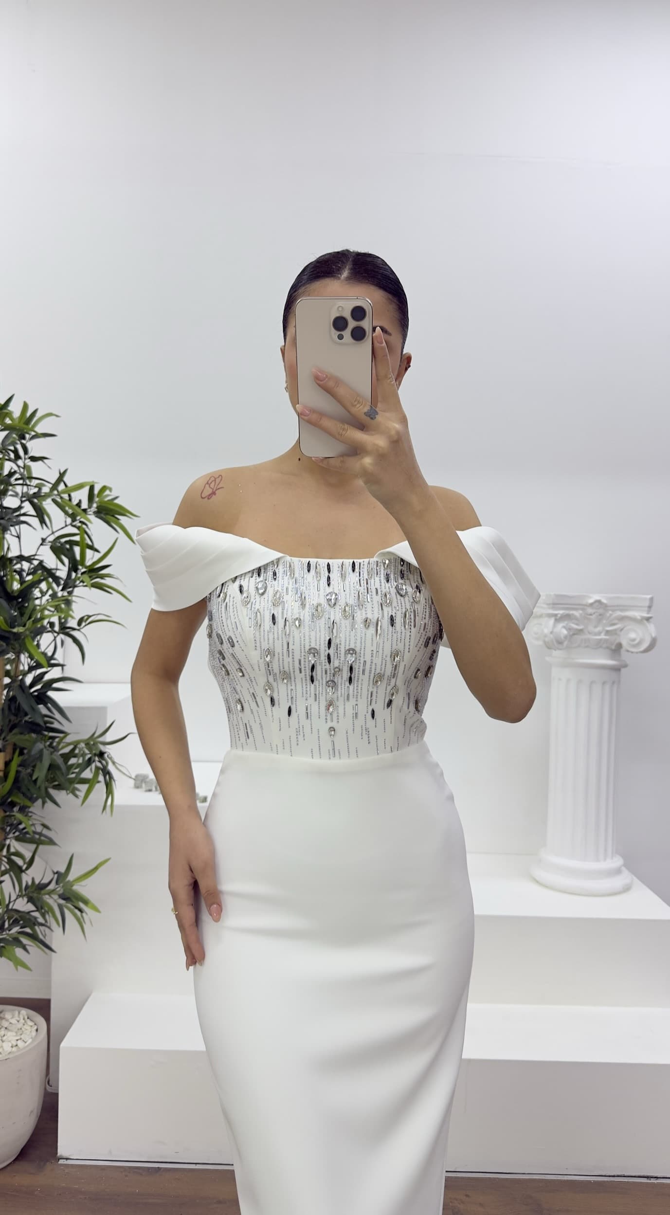 • Kemik Kristal Işıltılı Omuz Detaylı Abiye Elbise