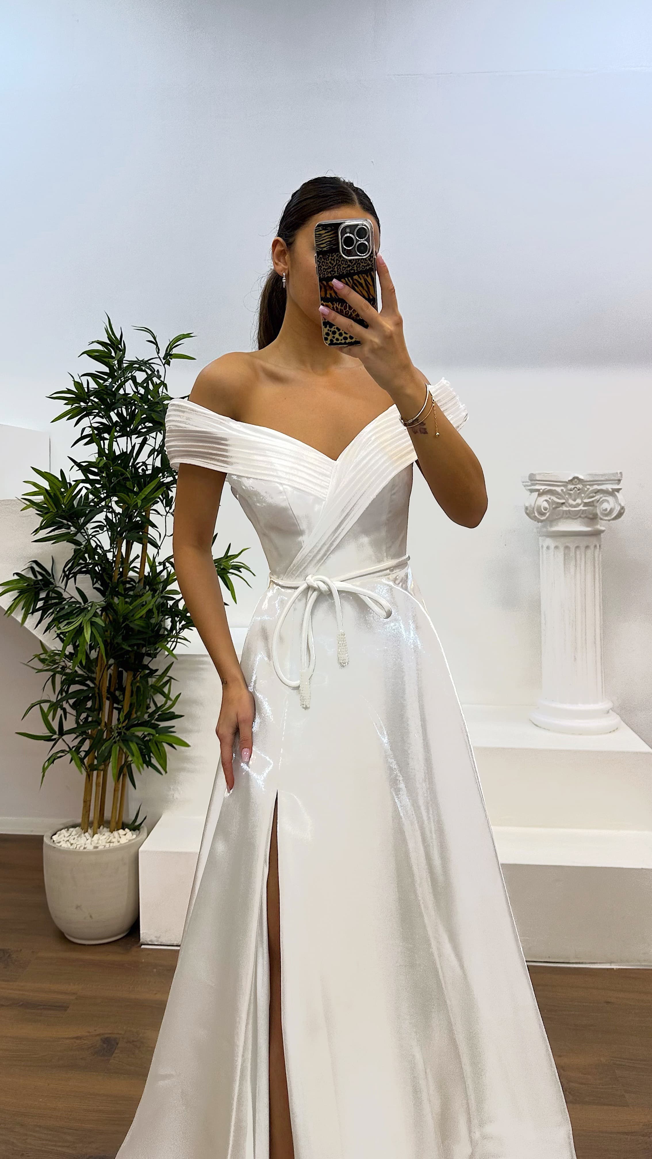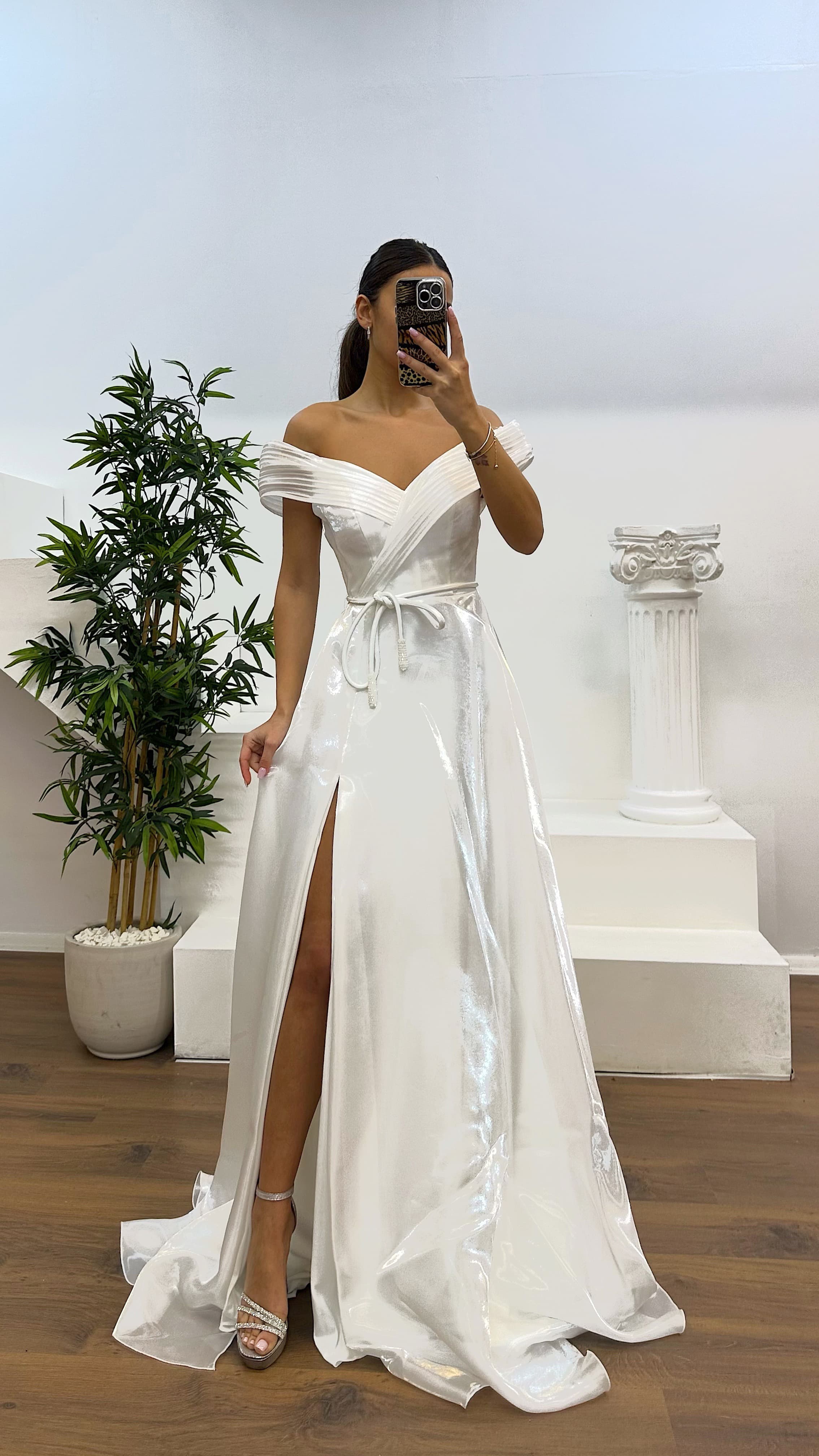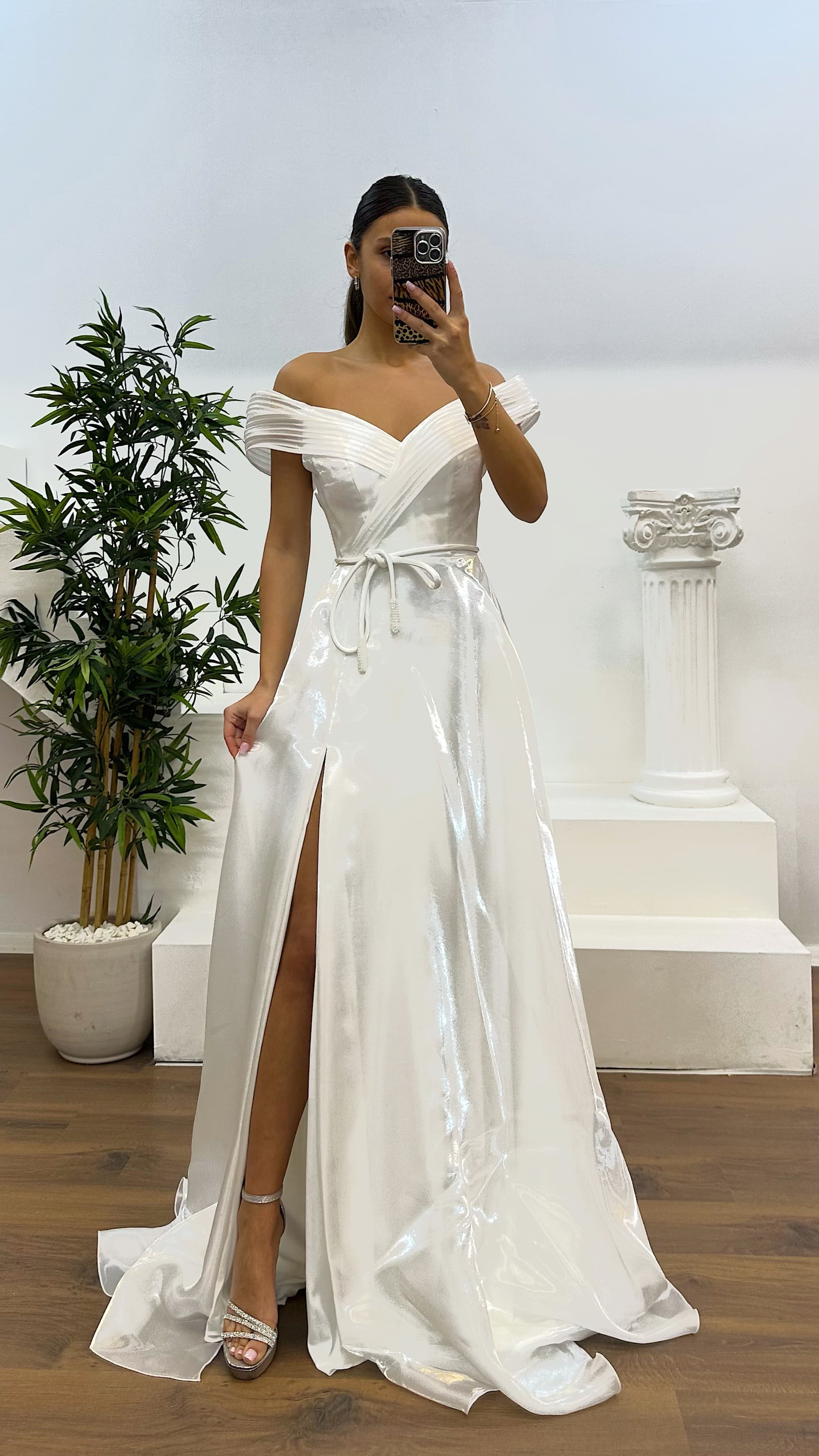 Ürün 36-44 bedene kadar uyumlu, göğüs pedli, astarlı, arka kapama fermuar, yırtmaçlı abiye olarak tasarlanmıştır.