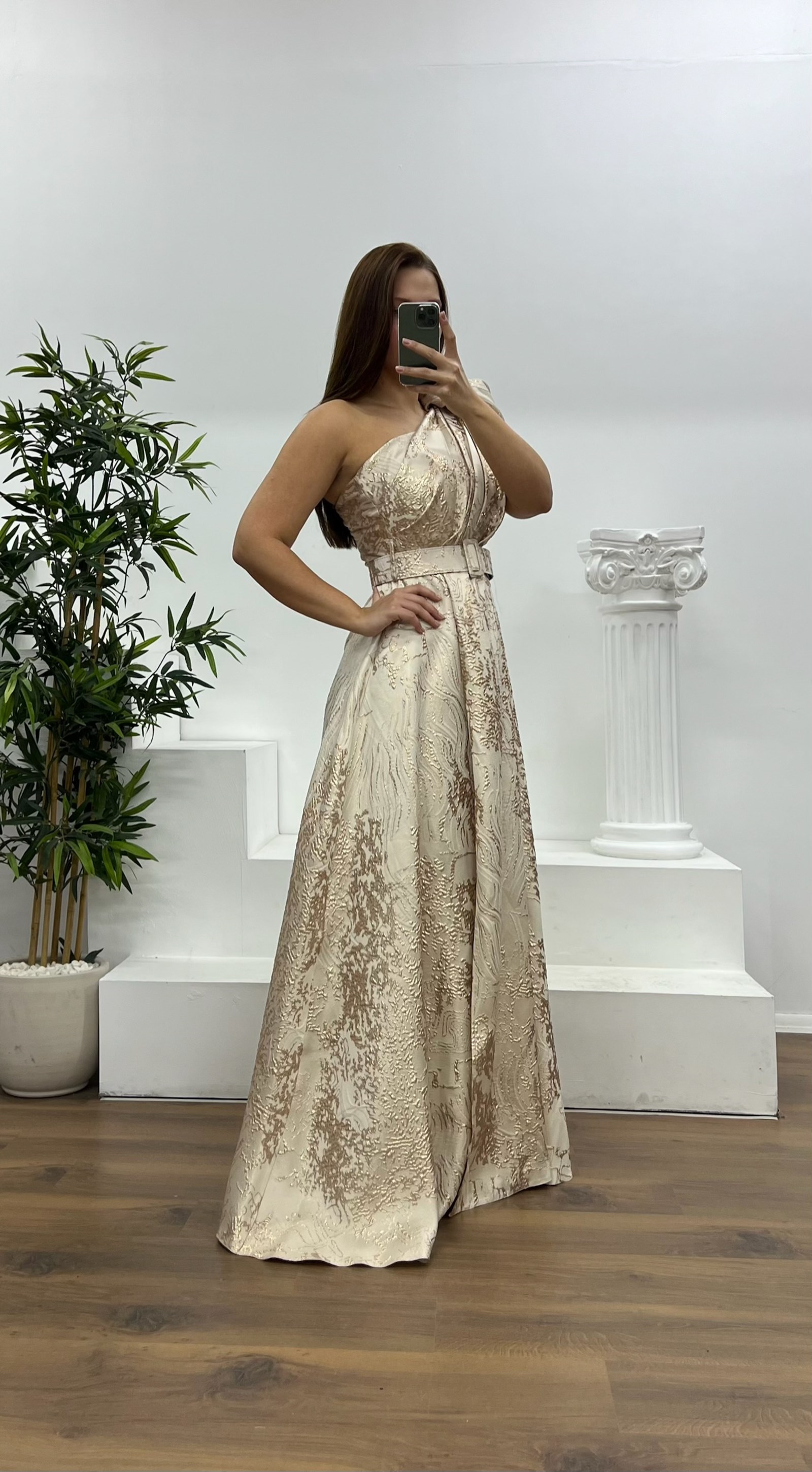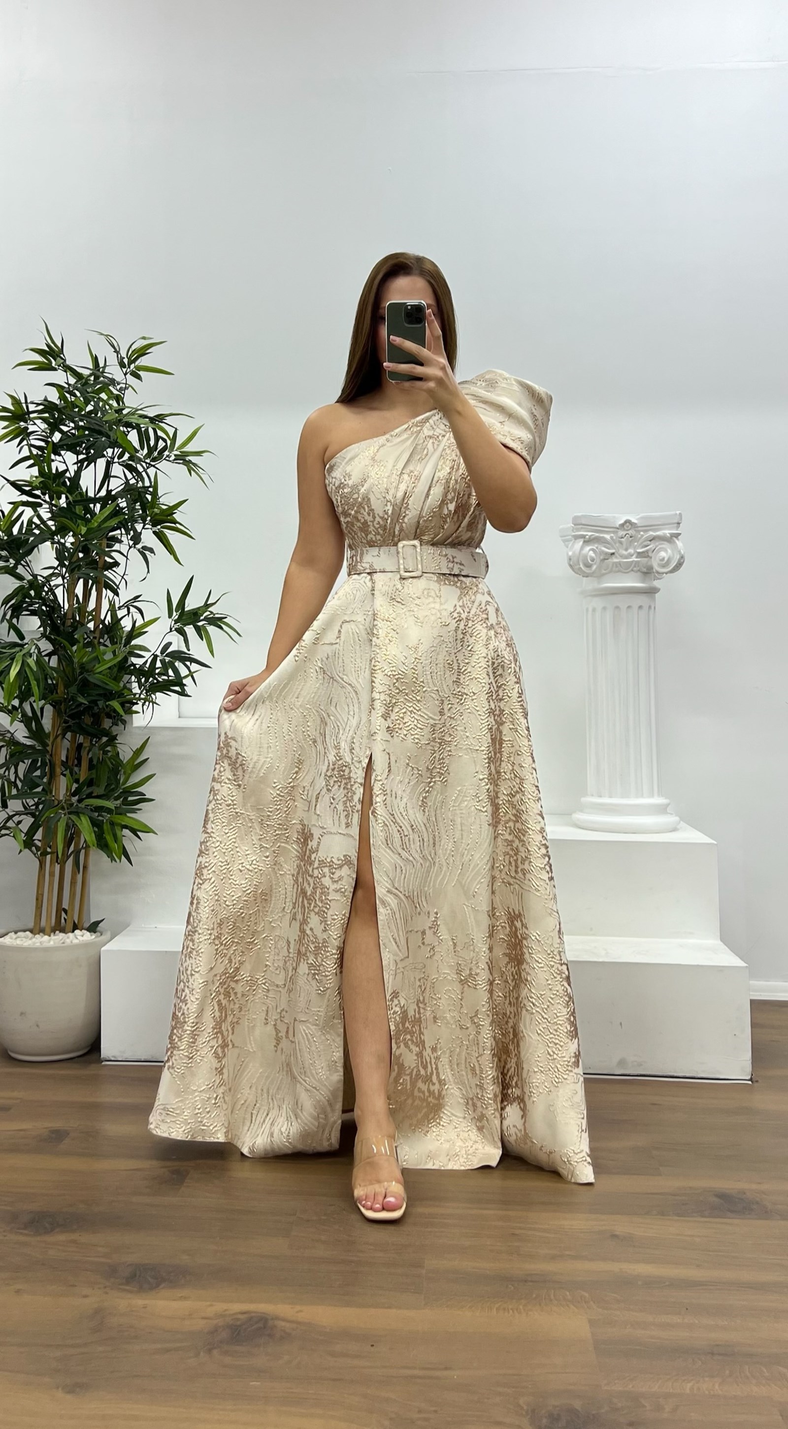 Ürün 44-48 bedene kadar uyumlu, göğüs pedli, astarlı, kemerli, yırtmaçlı, arka kapama fermuar abiye olarak tasarlanmıştır.