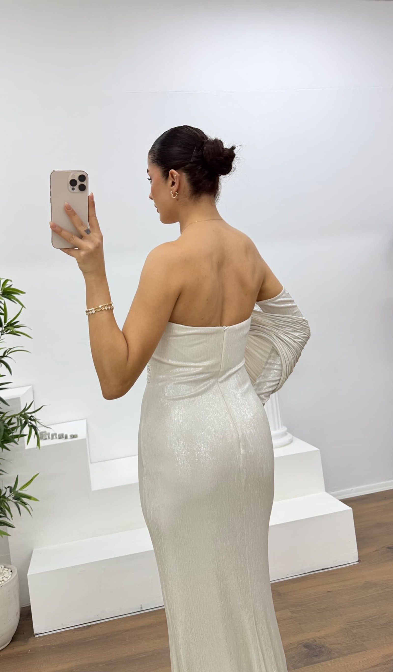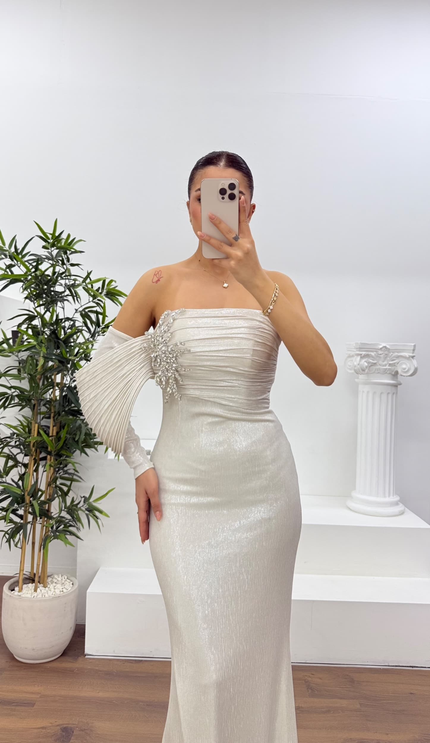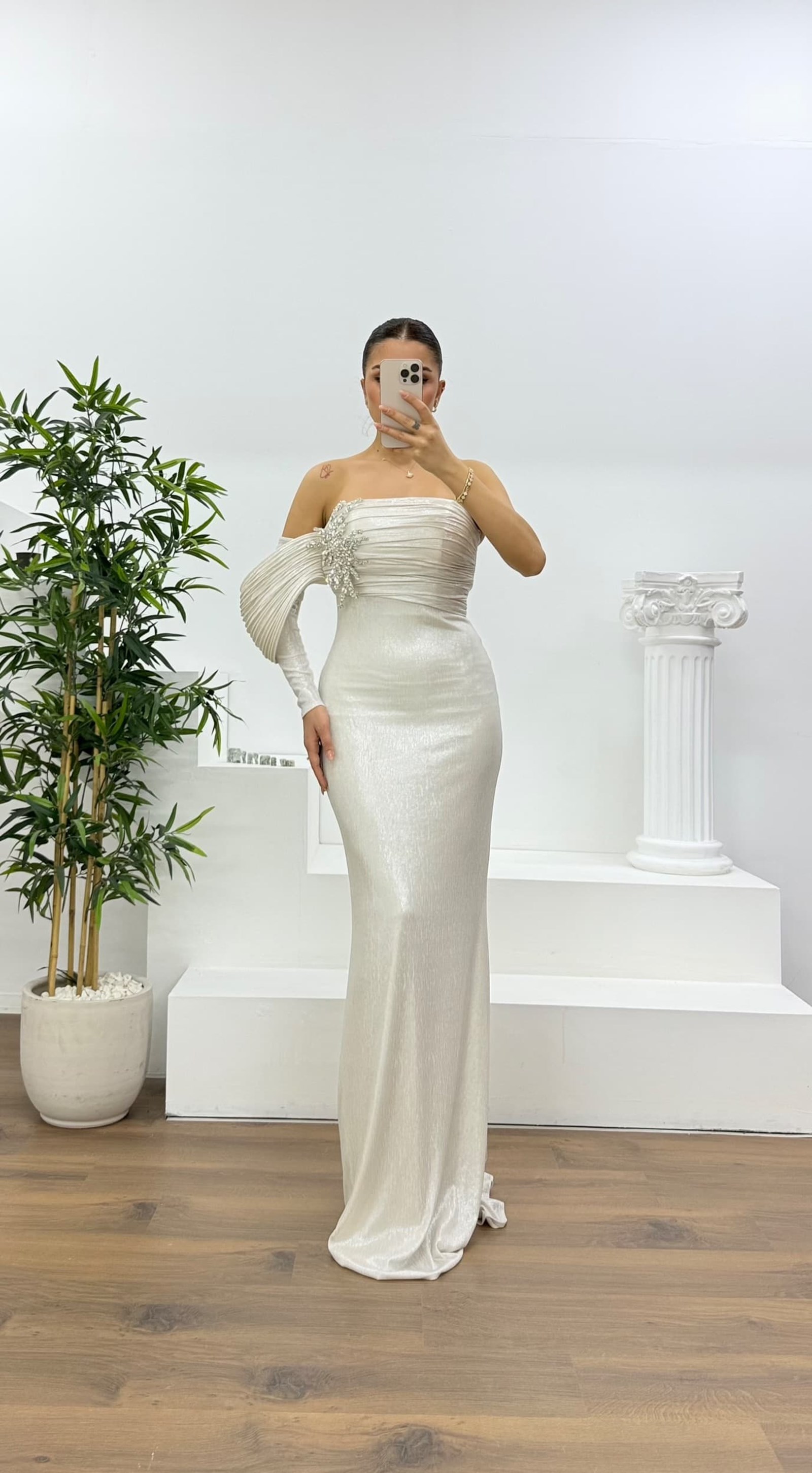 Kemik Tek Omuz Pile Kollu Taş Aplikeli Abiye Elbise