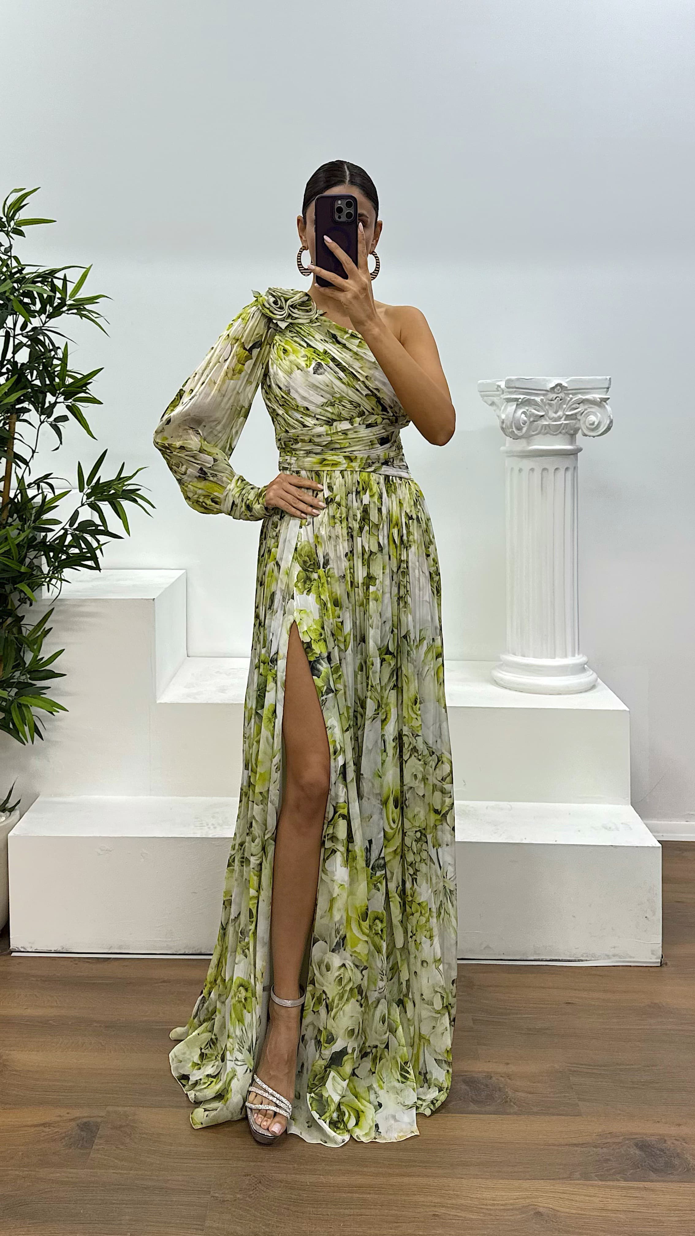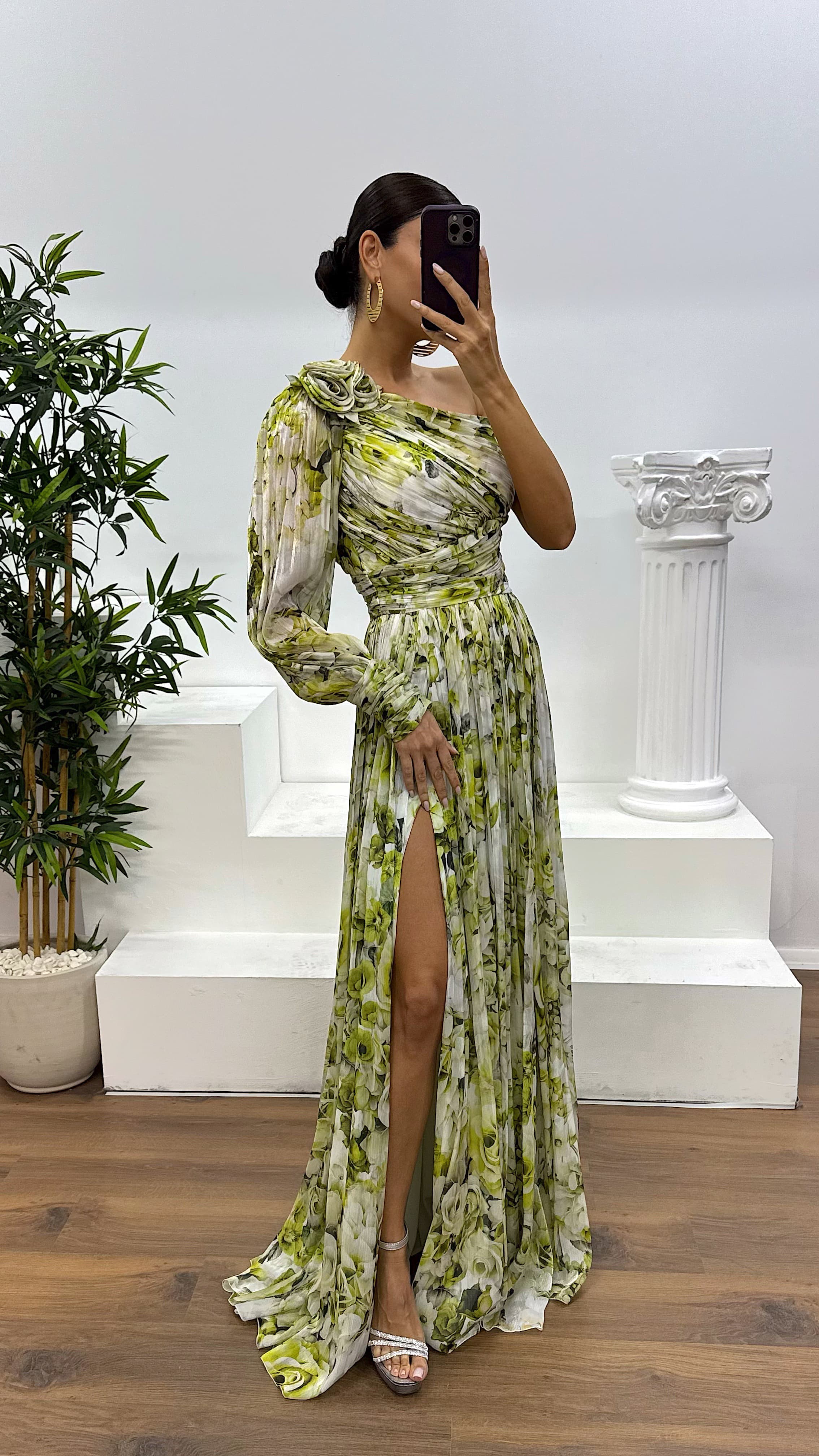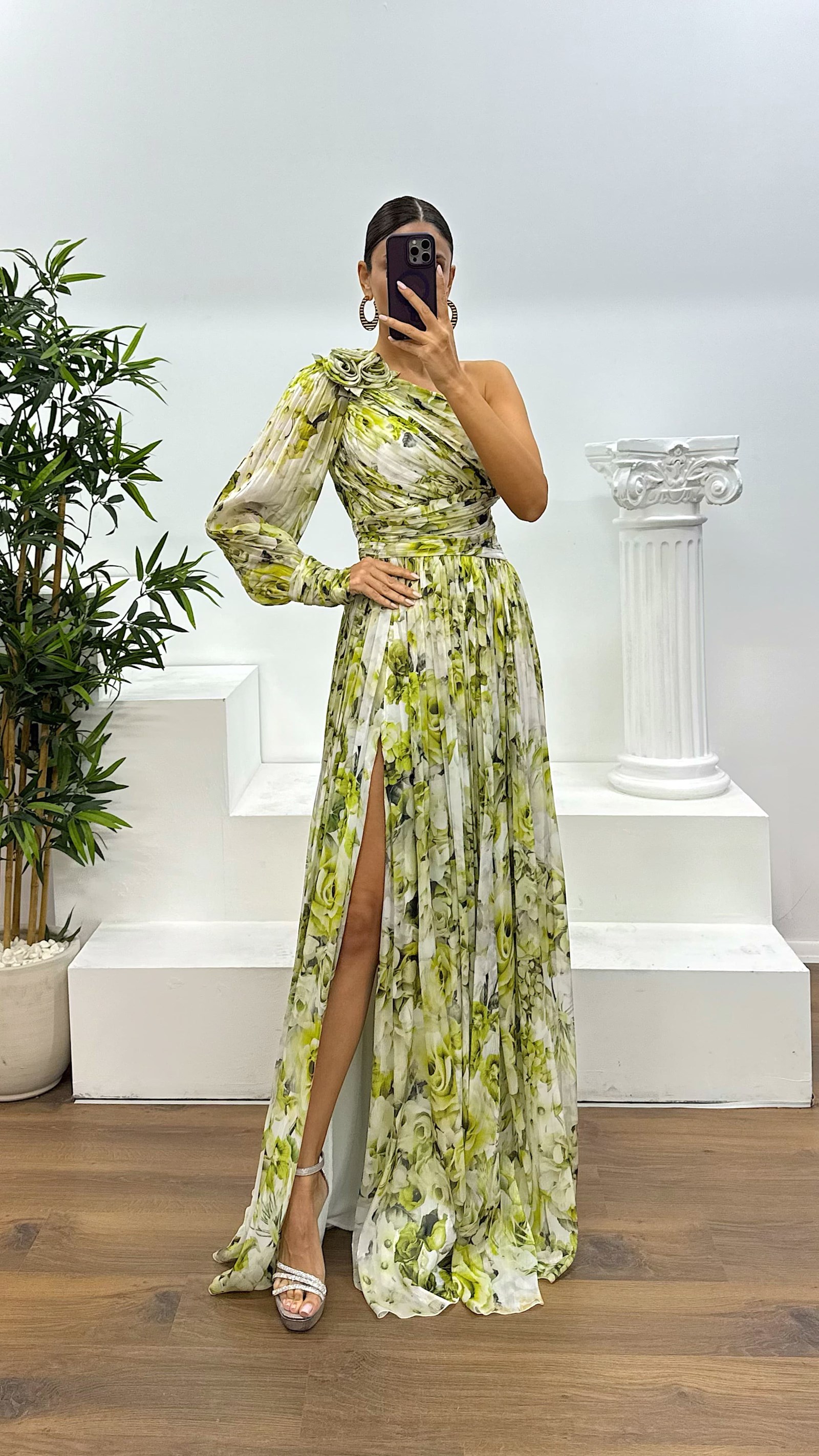 • Kemik Yeşil Tek Kol Desenli Abiye Elbise