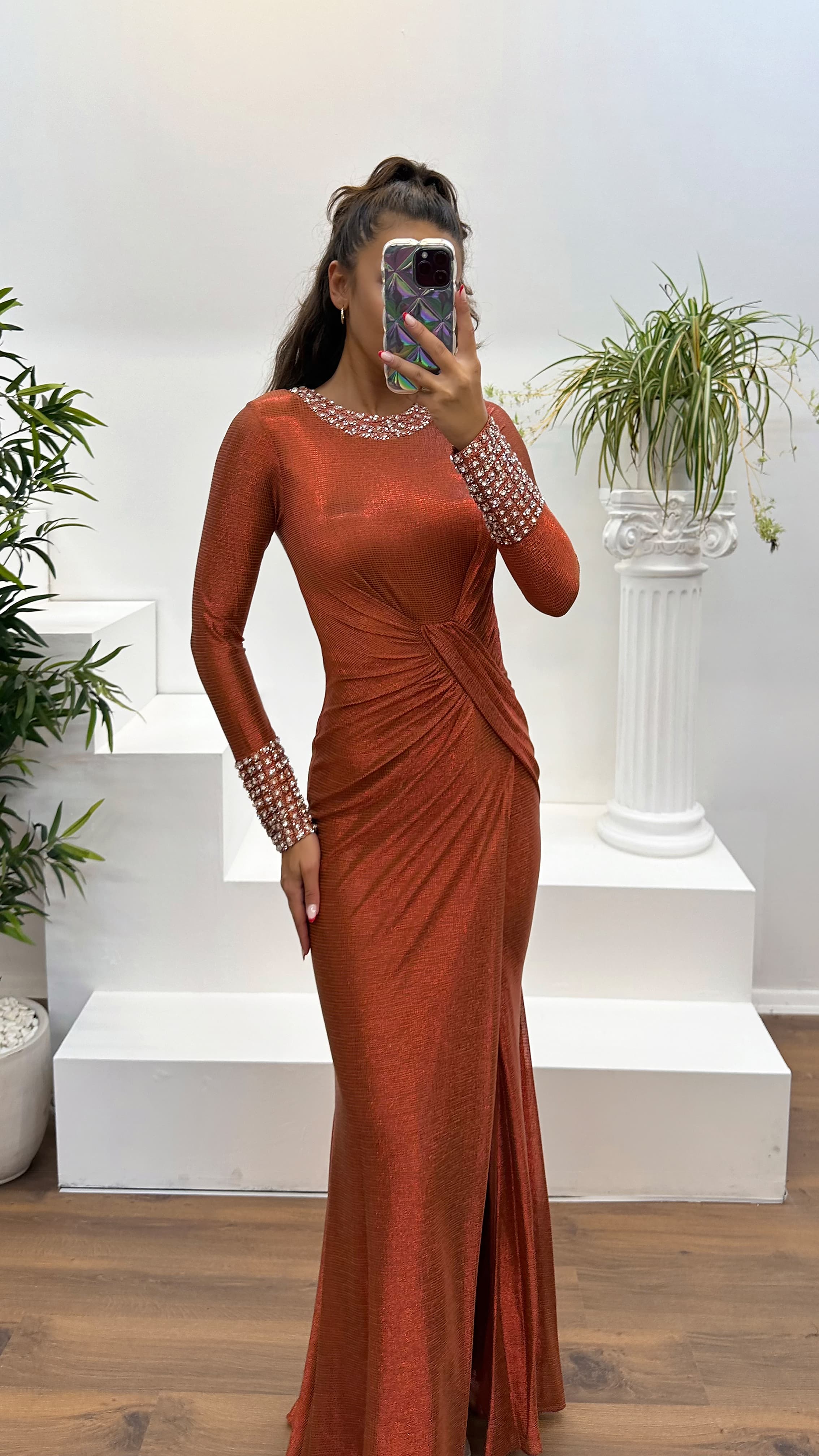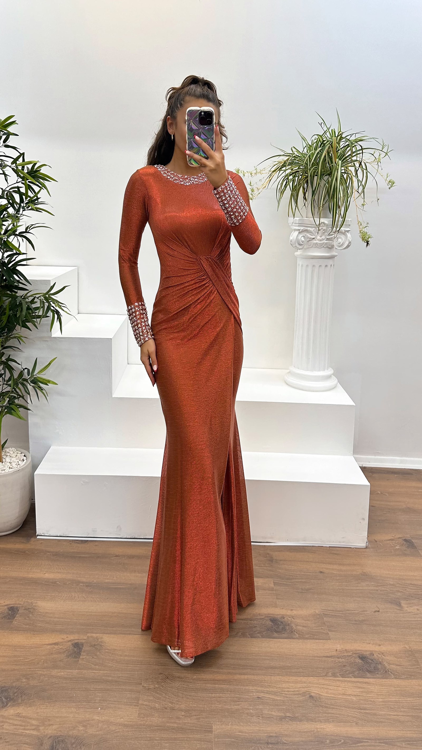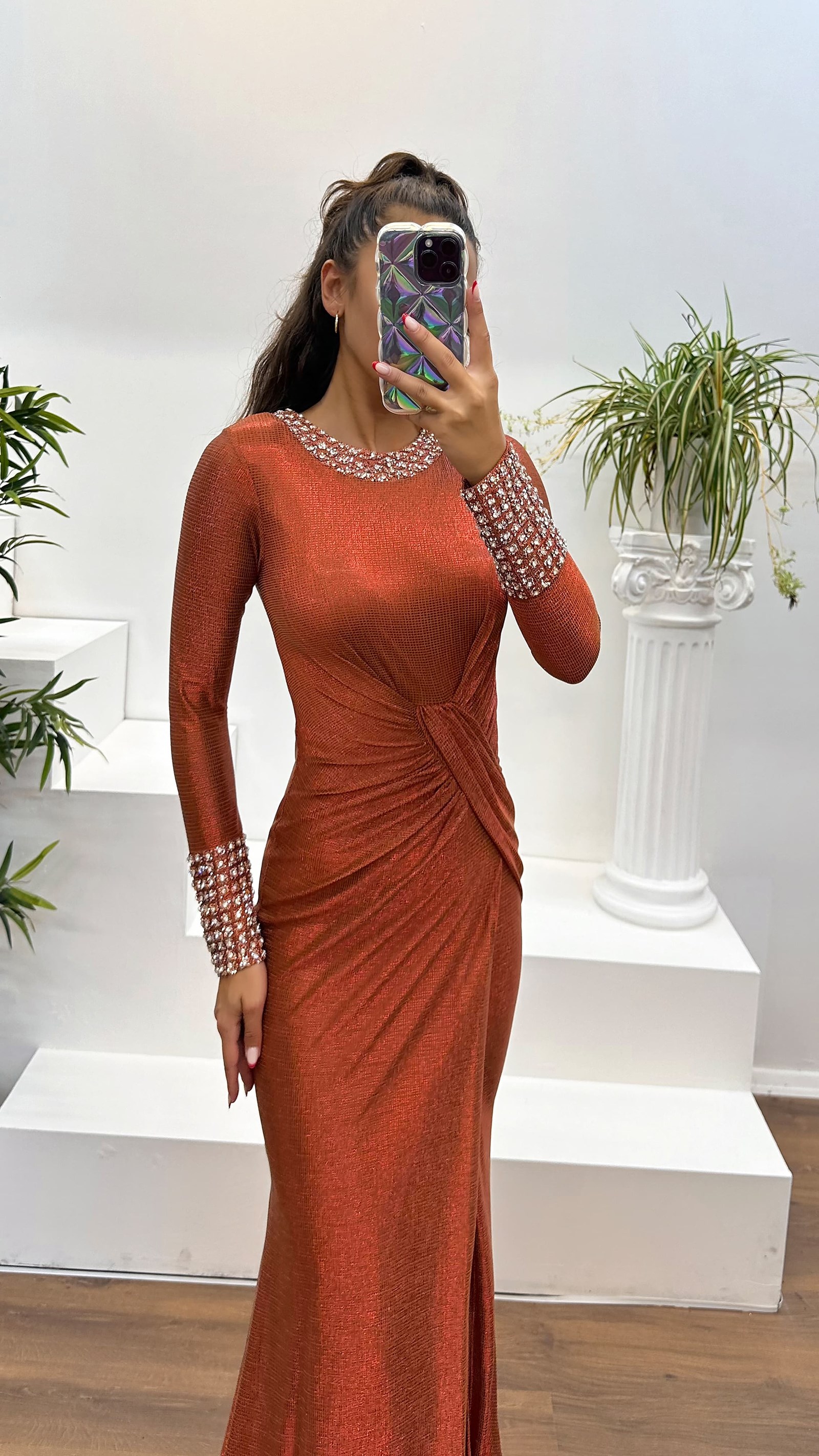 • Kiremit Kol ve Yaka Taş Detay Abiye Elbise
