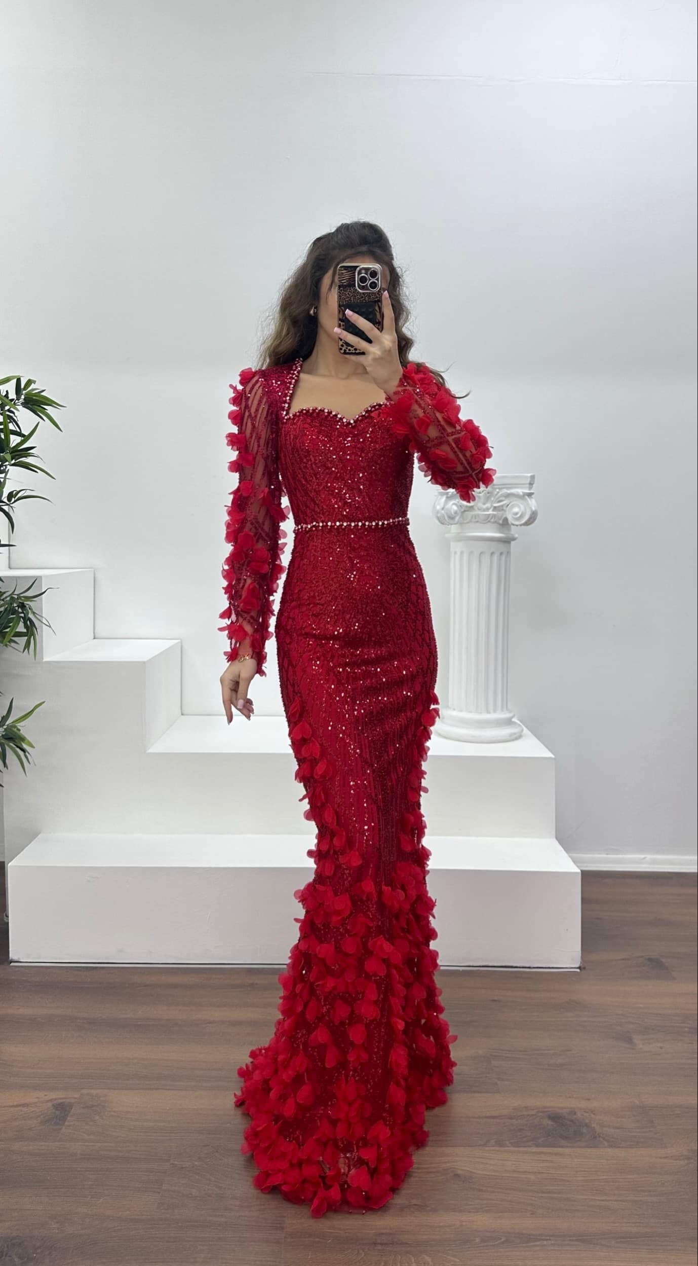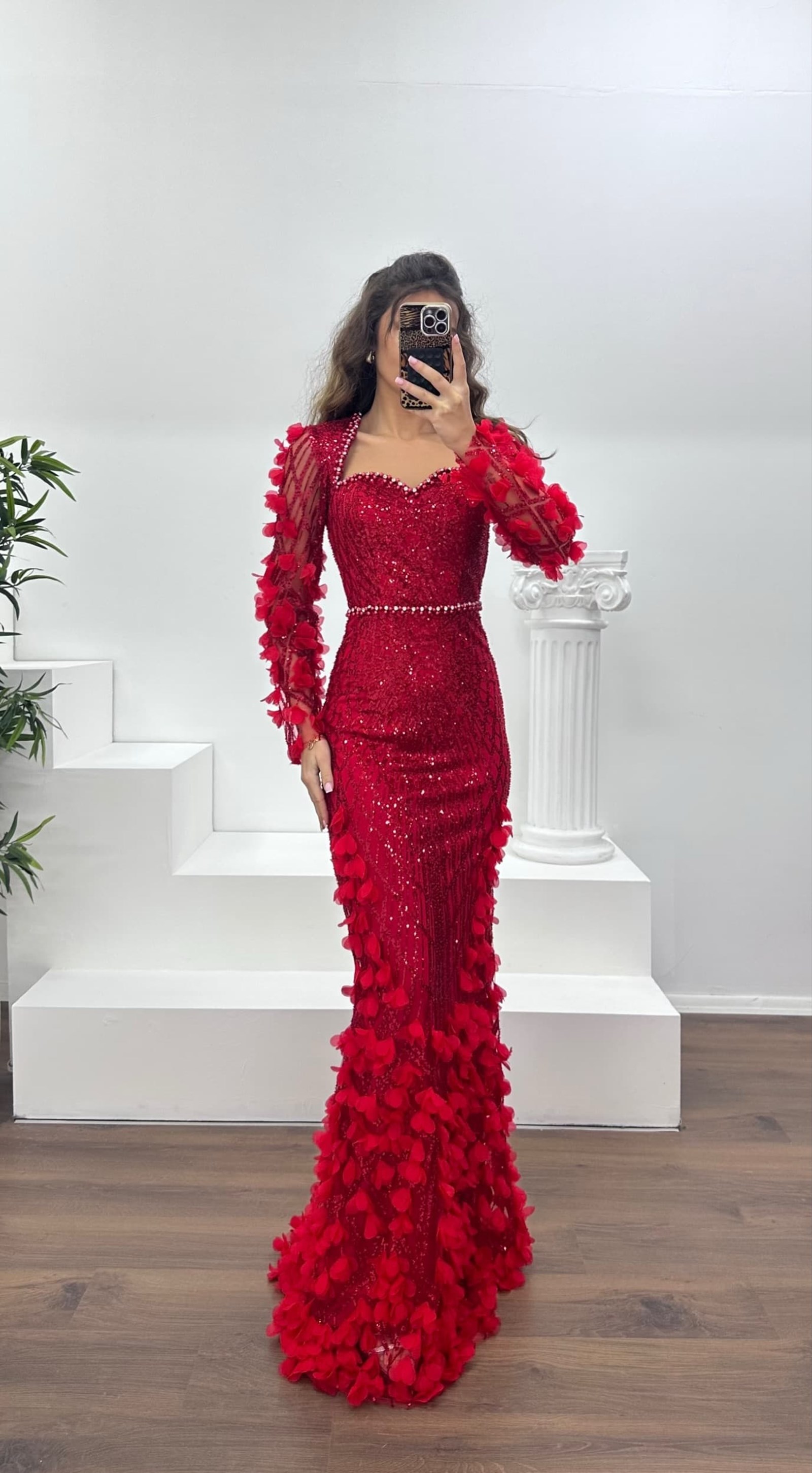 3D çiçek detaylı abiye elbise