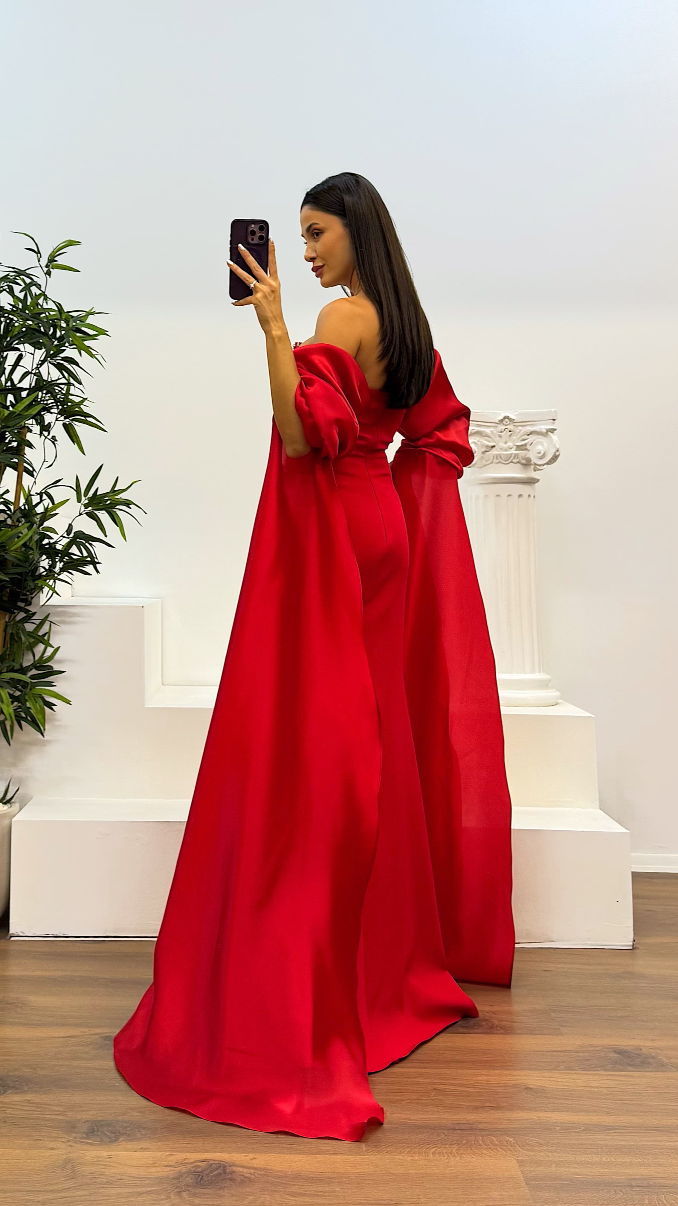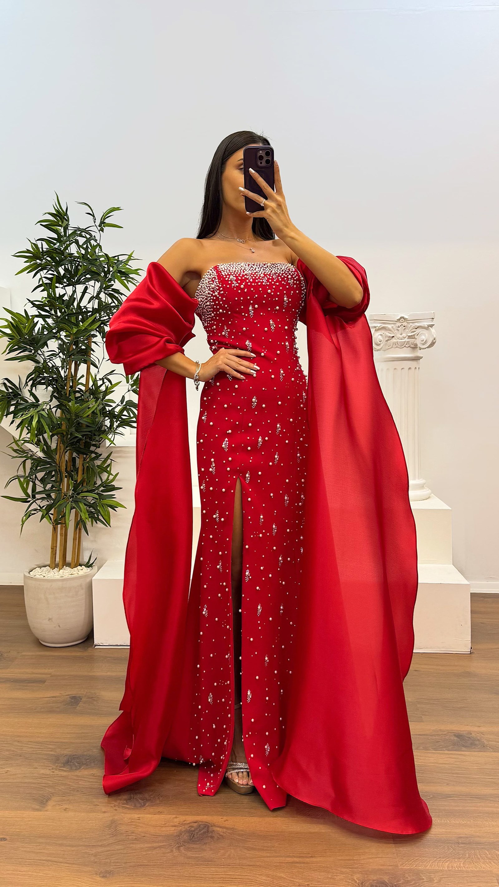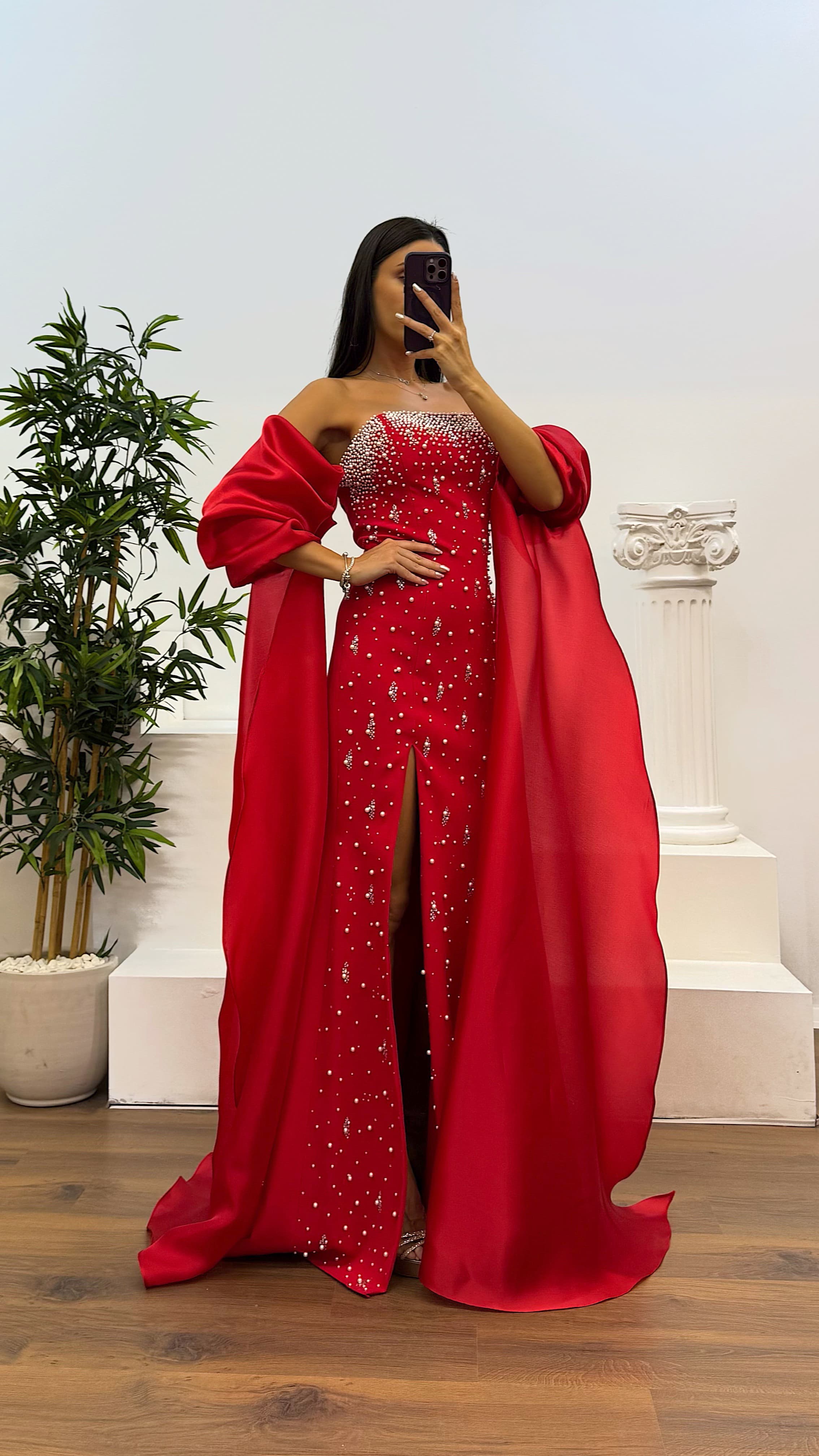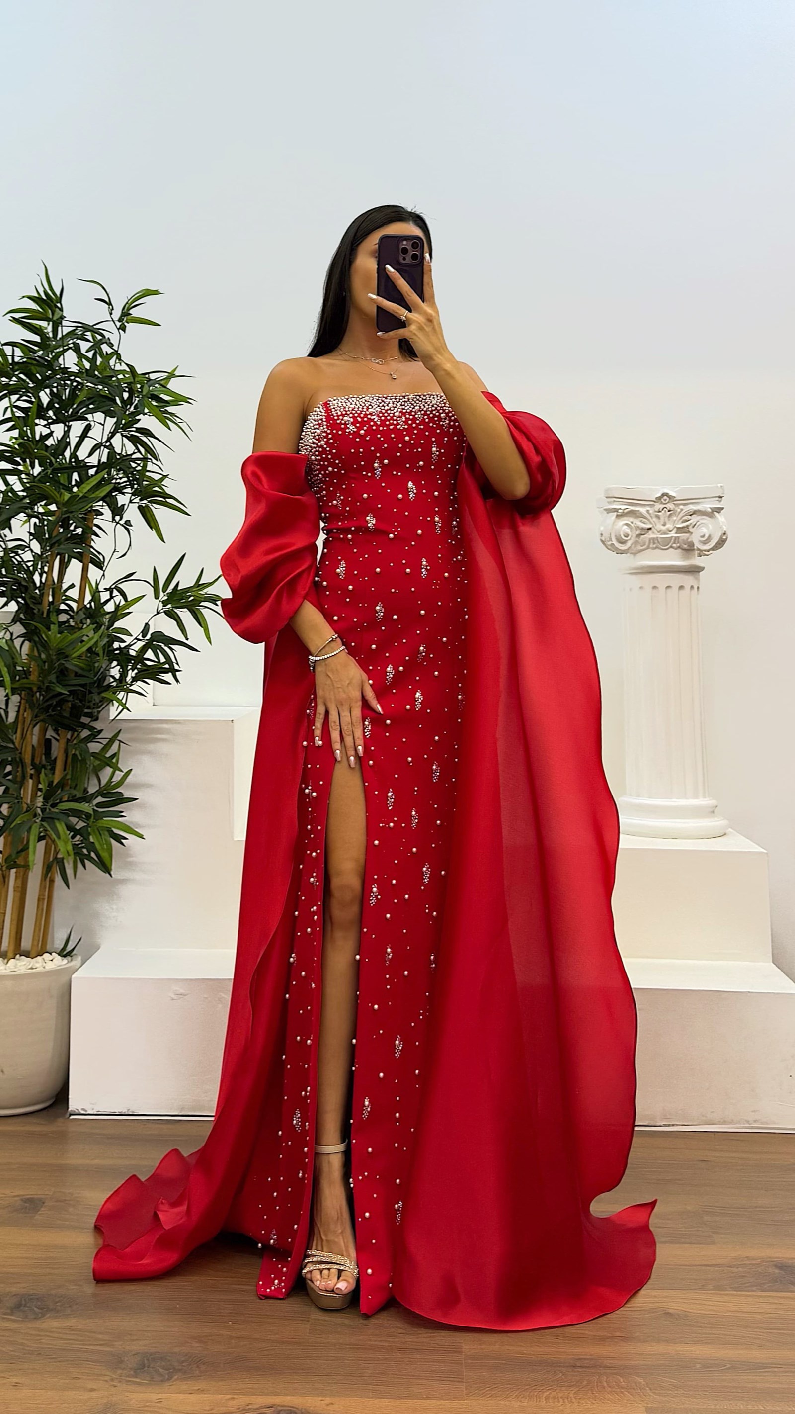 Ürün 36-42 bedene kadar uyumlu, göğüs pedli, astarlı, sırt capraz ip ve fermuar kapamalı, balon kol, inci detay abiye olarak tasarlanmıştır.