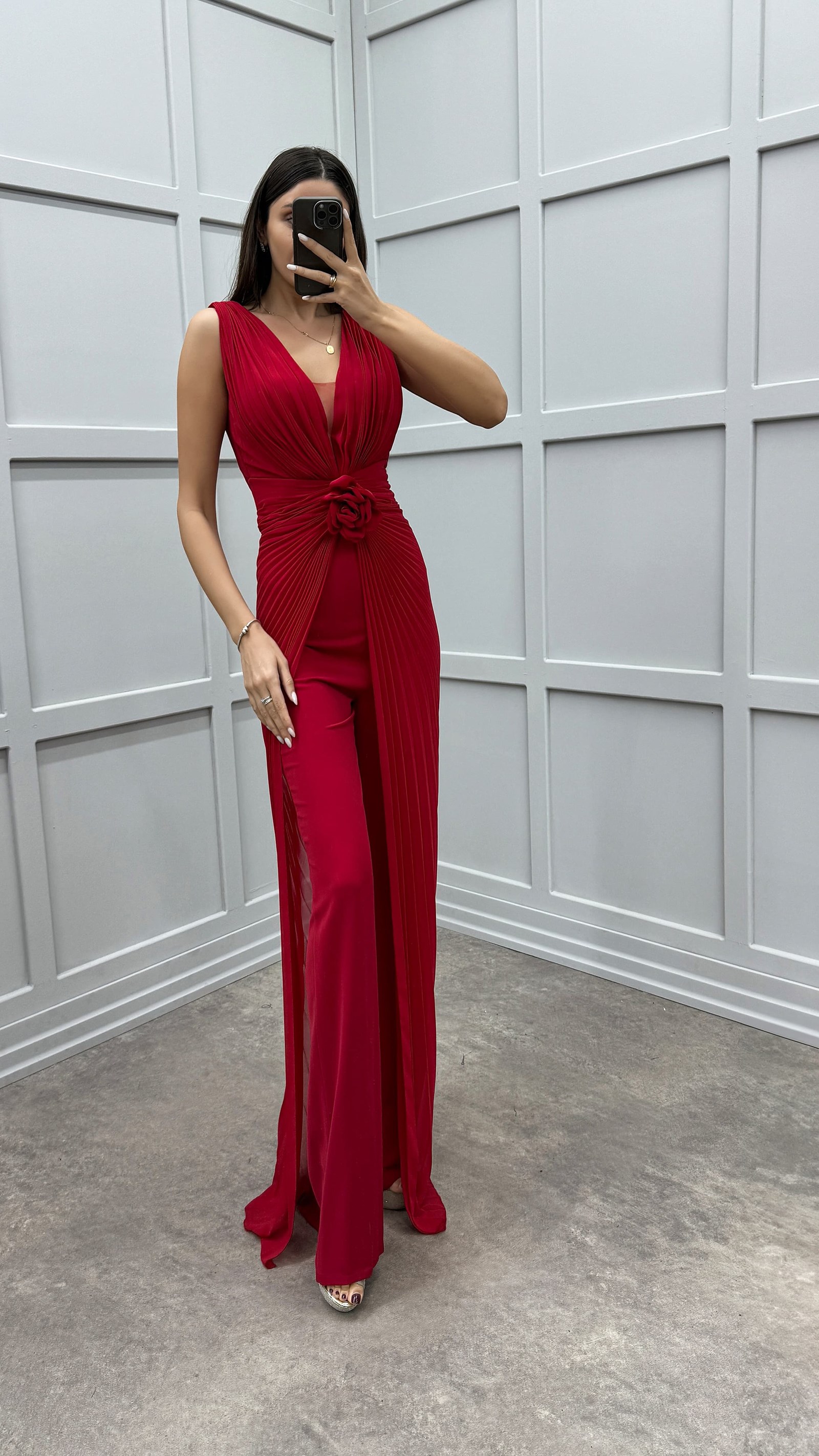 Kırmızı Bel Detay Pliseli Tasarım Abiye Tulum