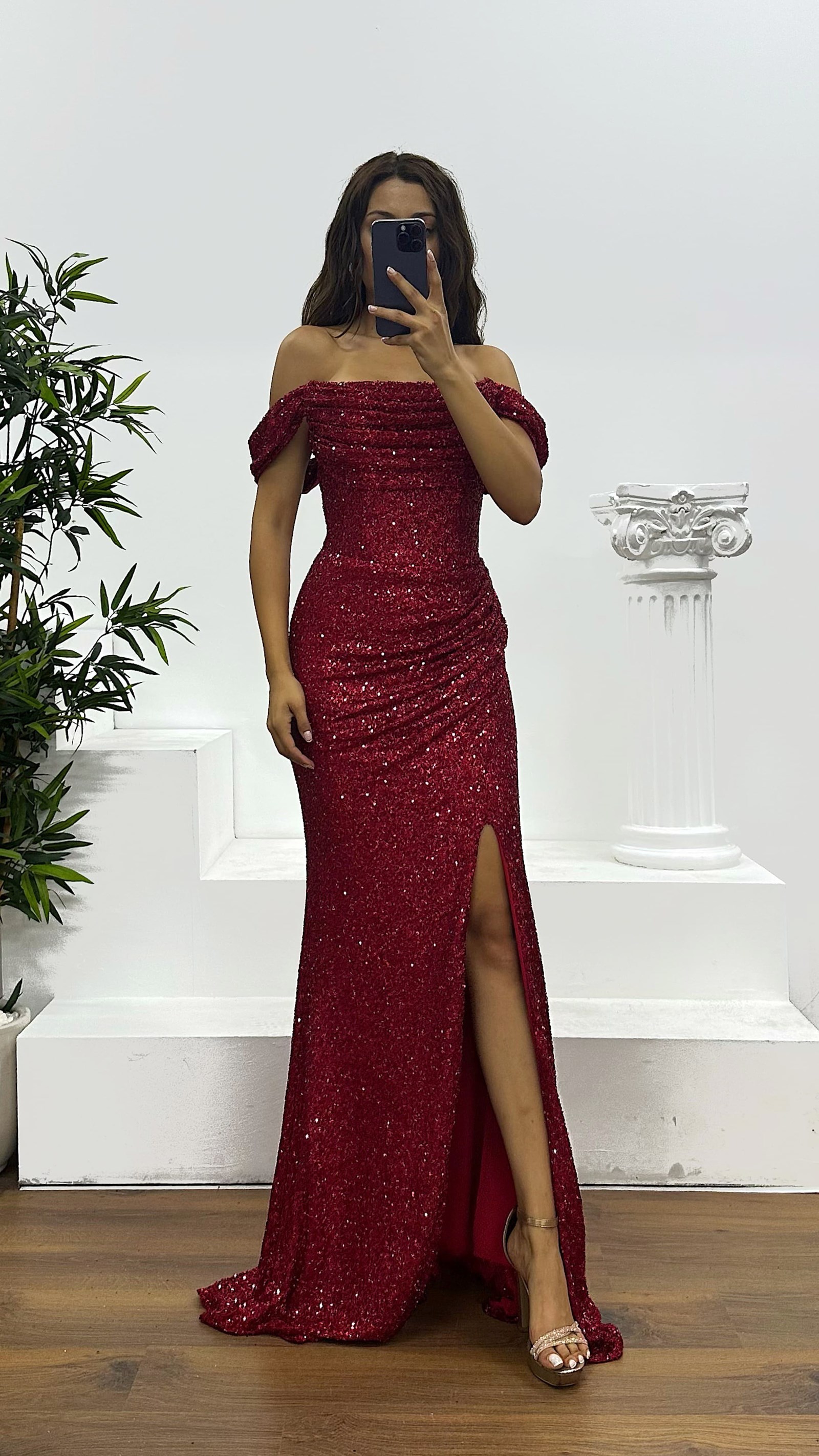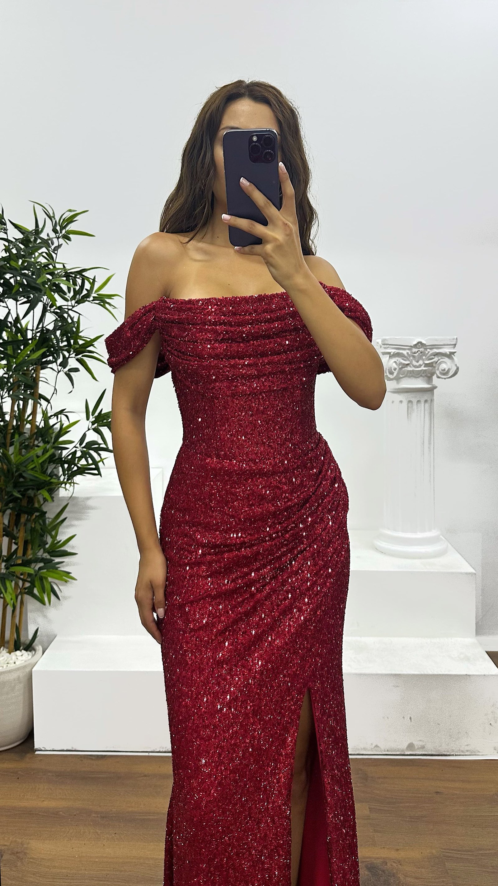 • Kırmızı Boncuk İşlemeli Abiye Elbise