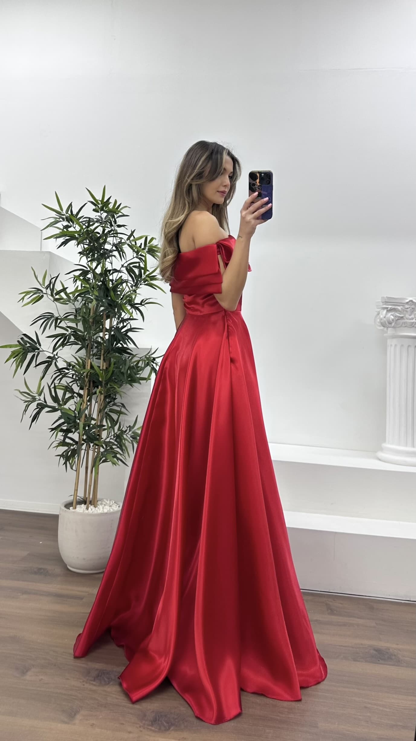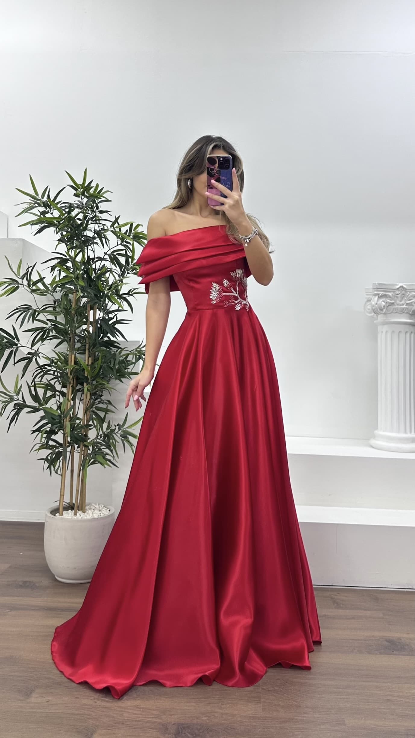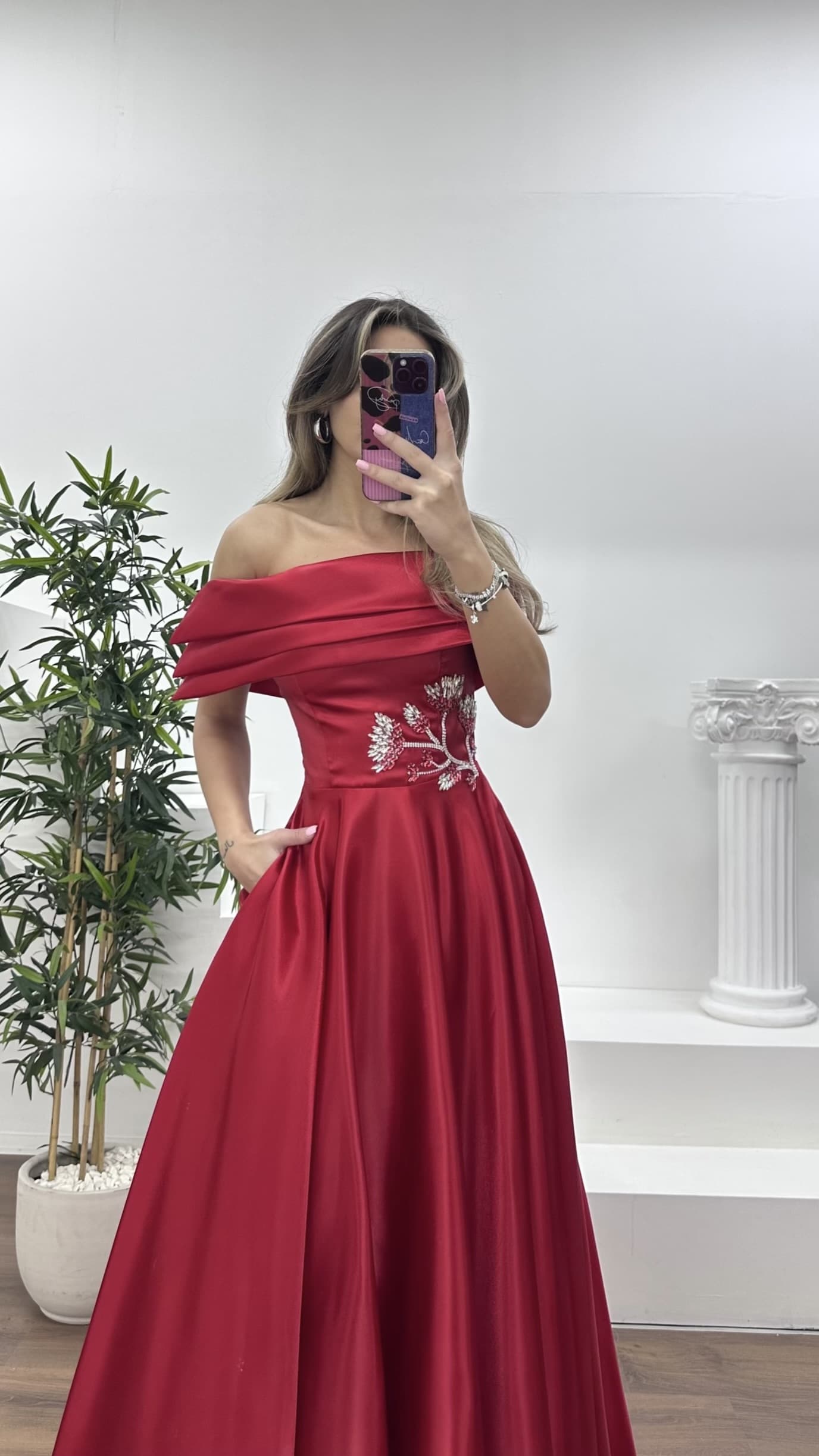 • Kırmızı Dökümlü Etek Formunda Bel Kısmı Çiçek Taşlı Şifon Abiye Elbise