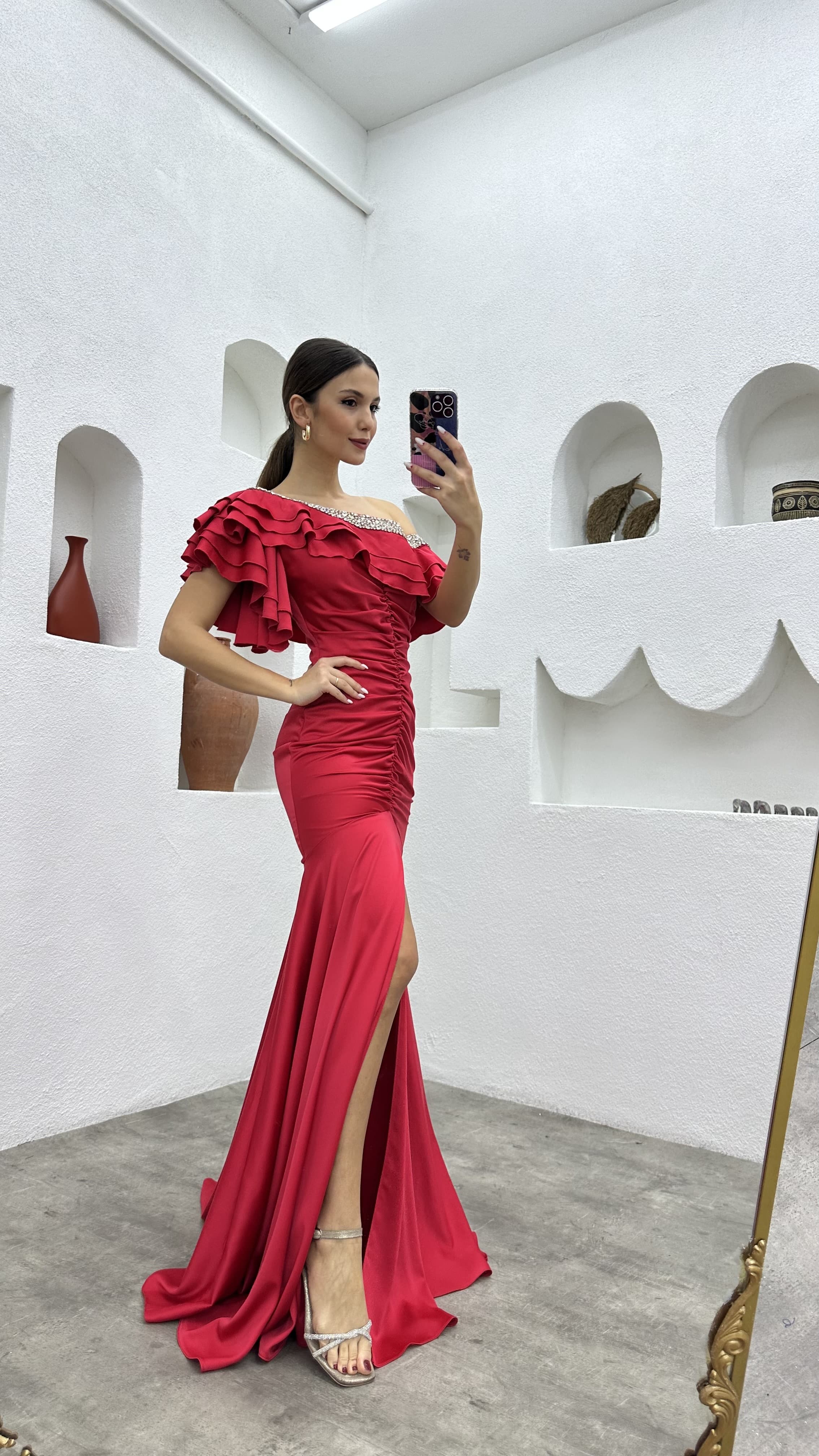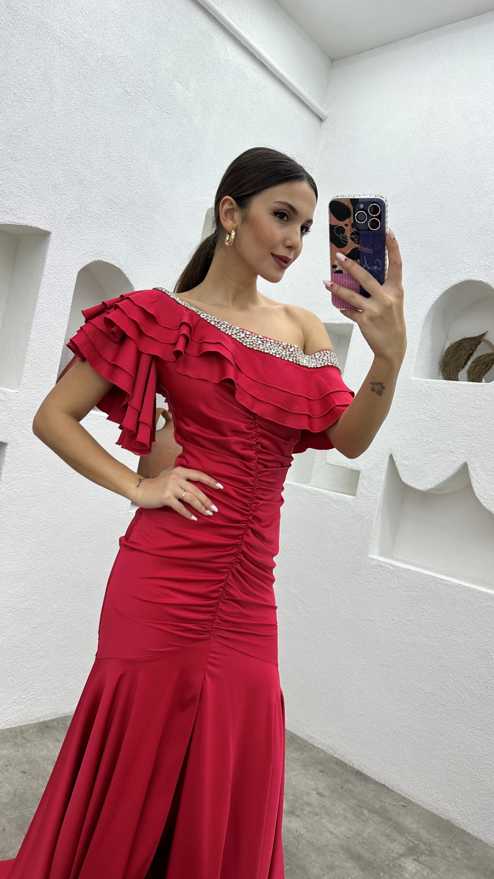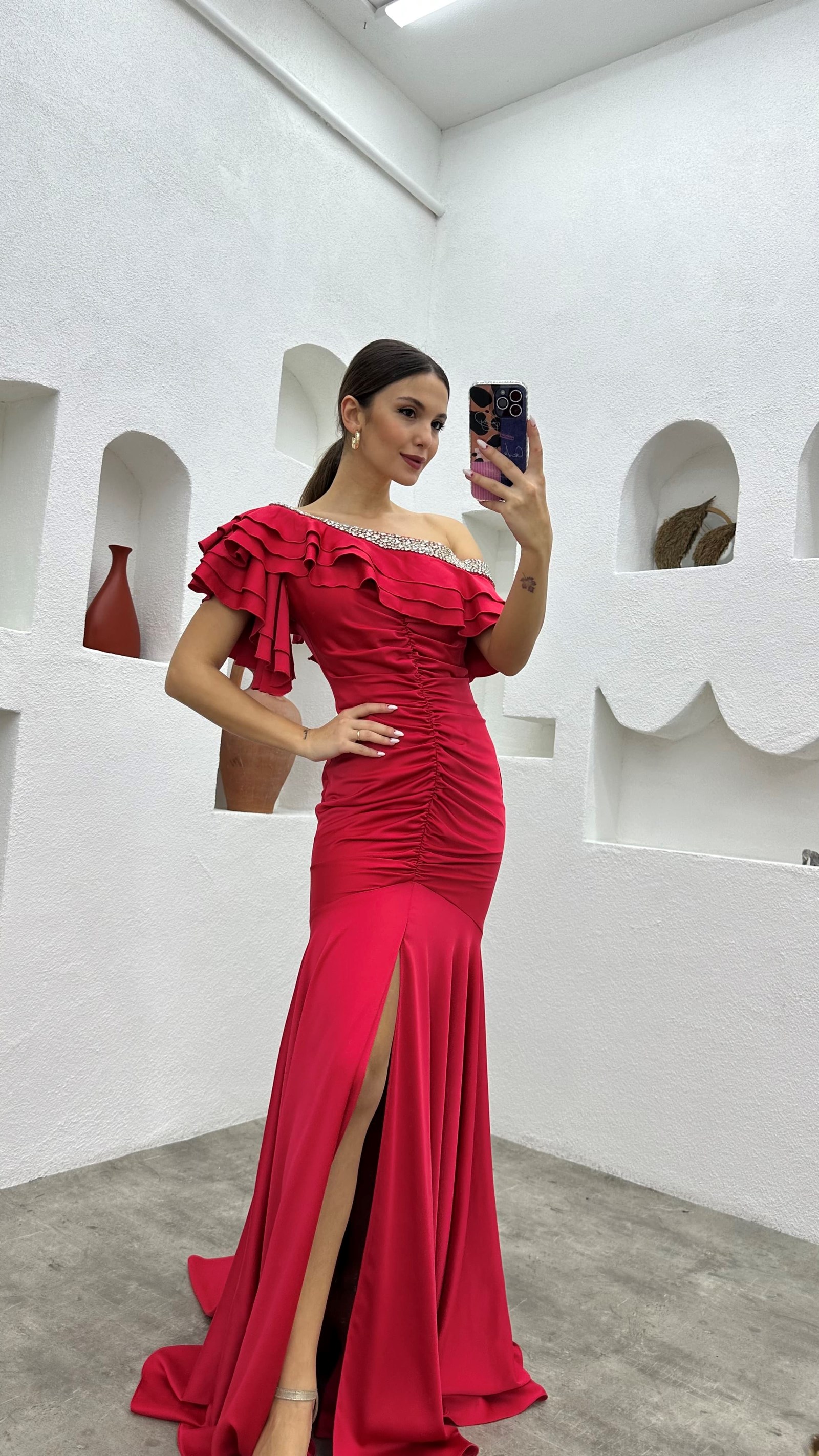 Kırmızı Göğsü Taşlı Volanlı Büzgülü Abiye Elbise